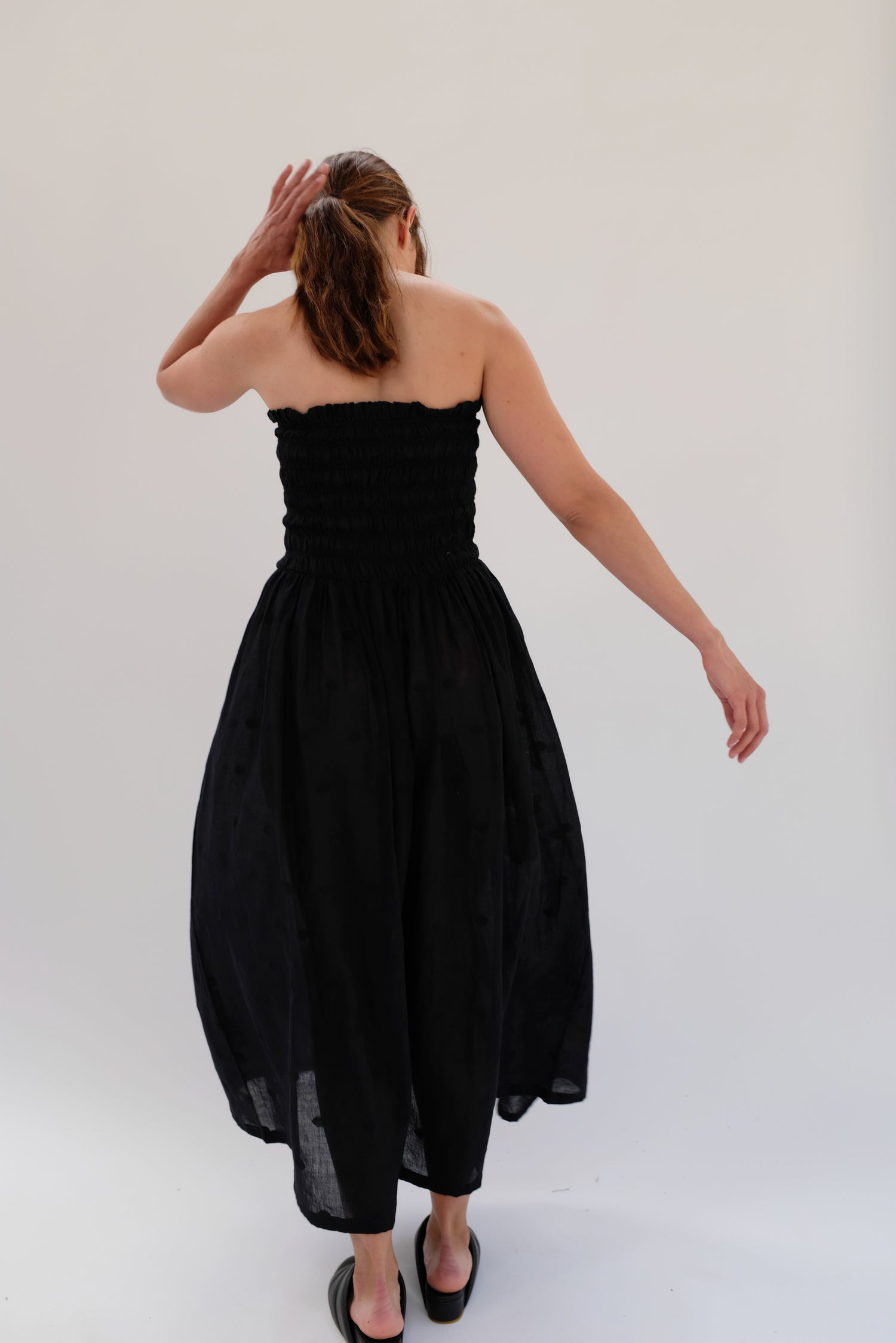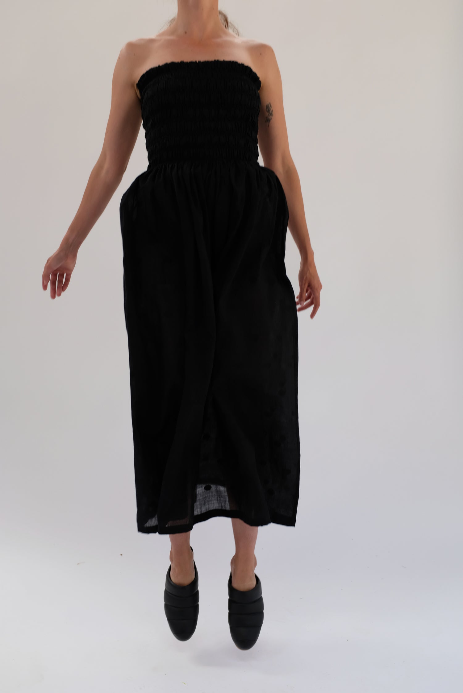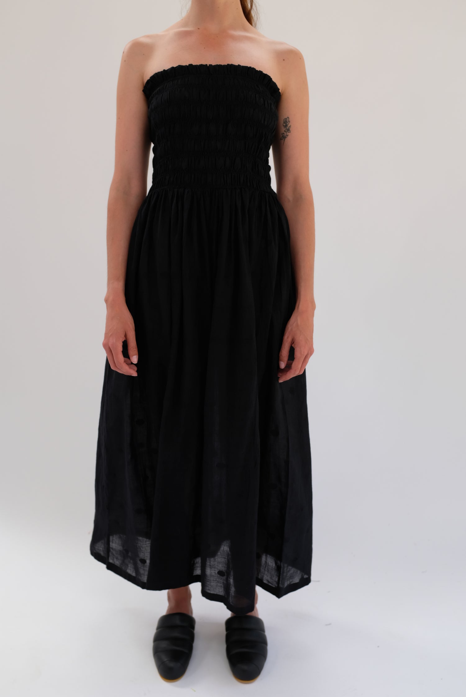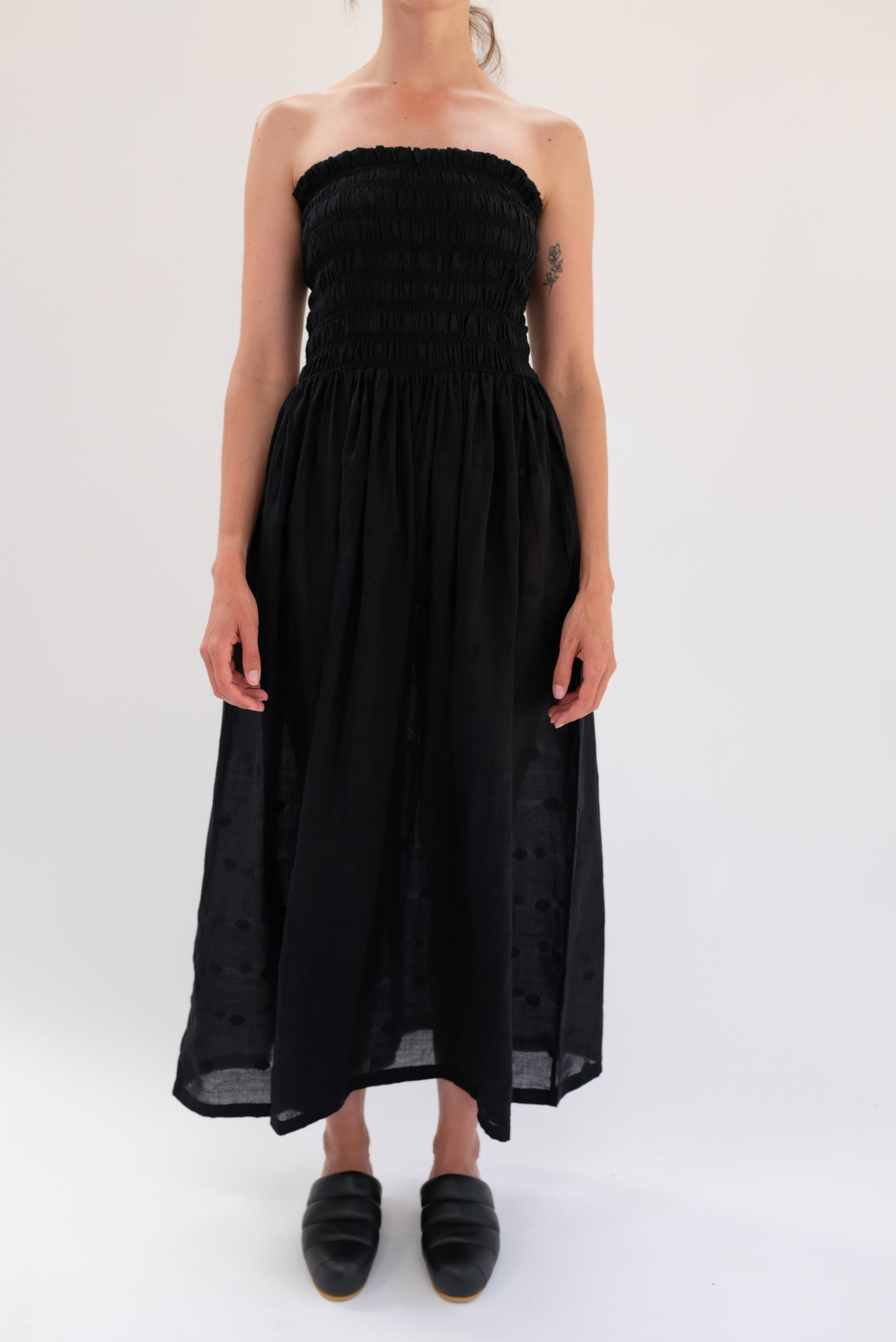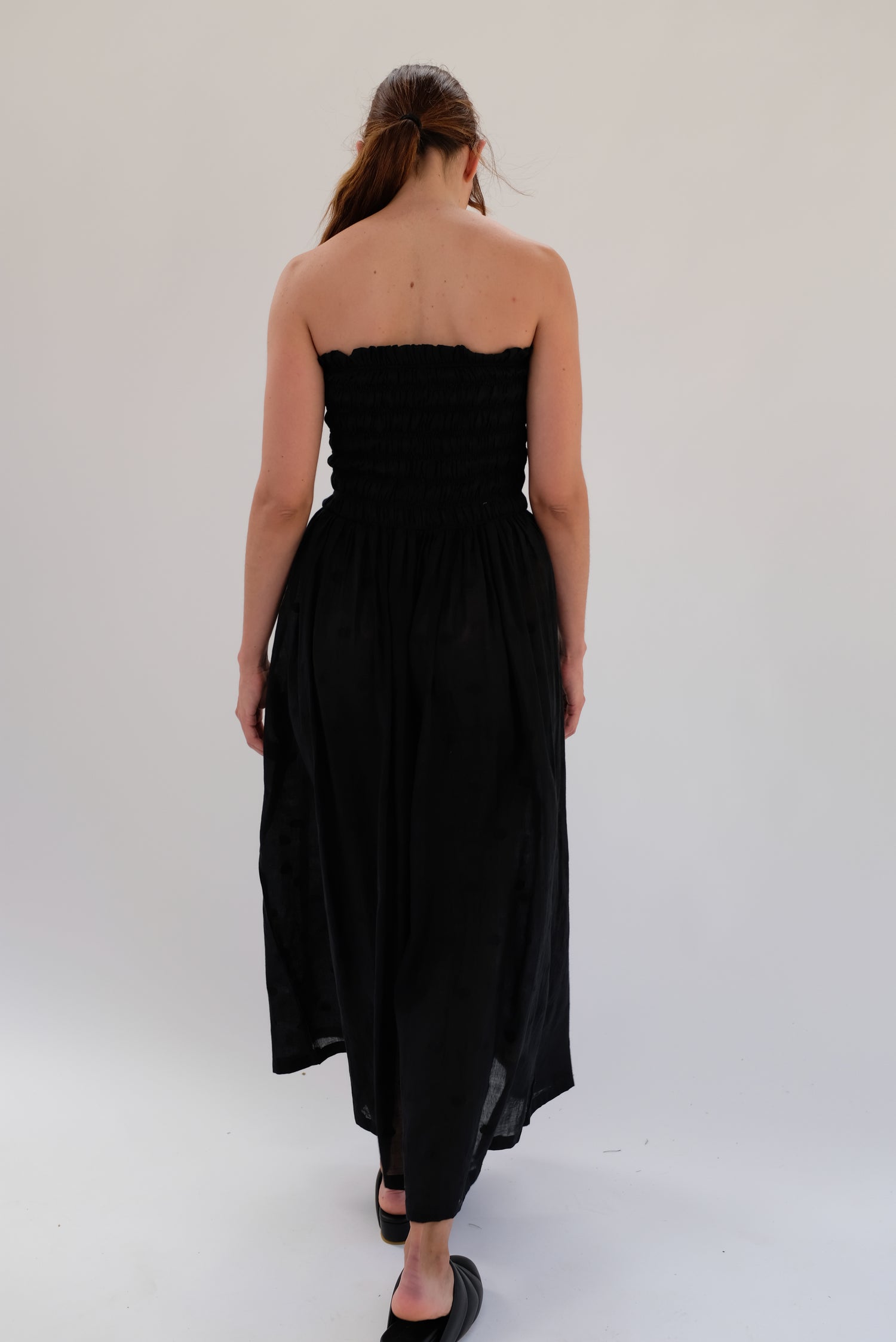 100% Cotton hand loomed on non-electric looms, enclosed seams. Jumbo dot embroidered Swiss polka-dots, semi-sheer. Strapless dress, with ruching bodice and full skirt. Model is wearing a small/medium.
