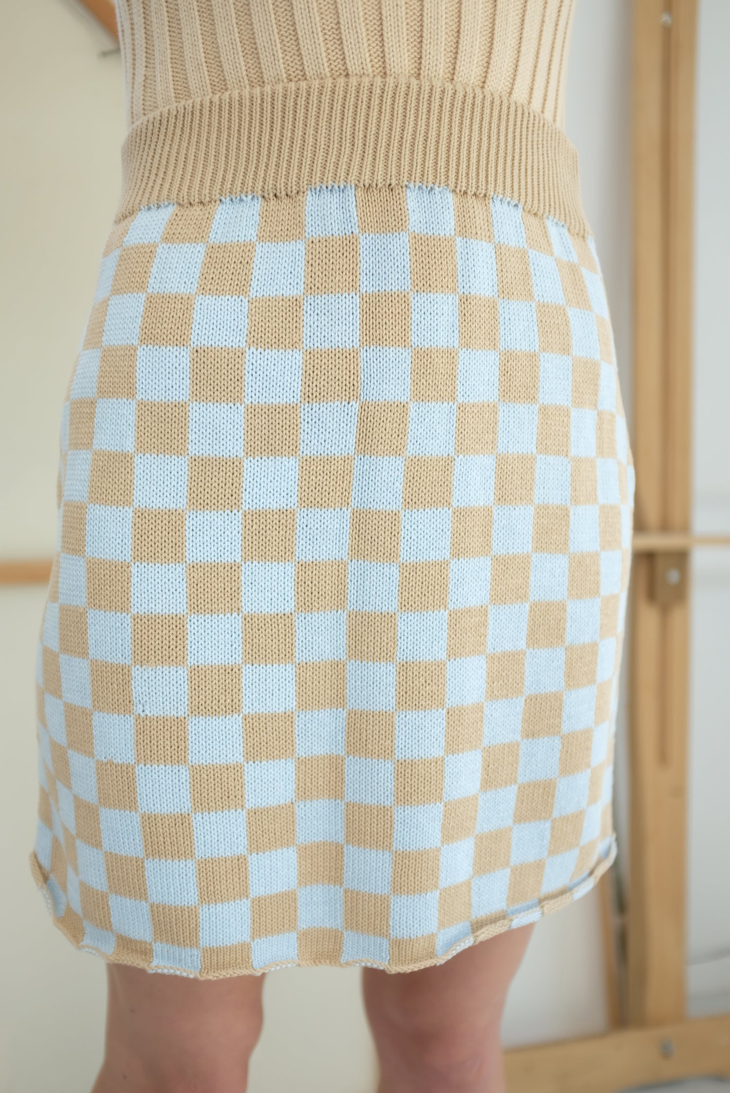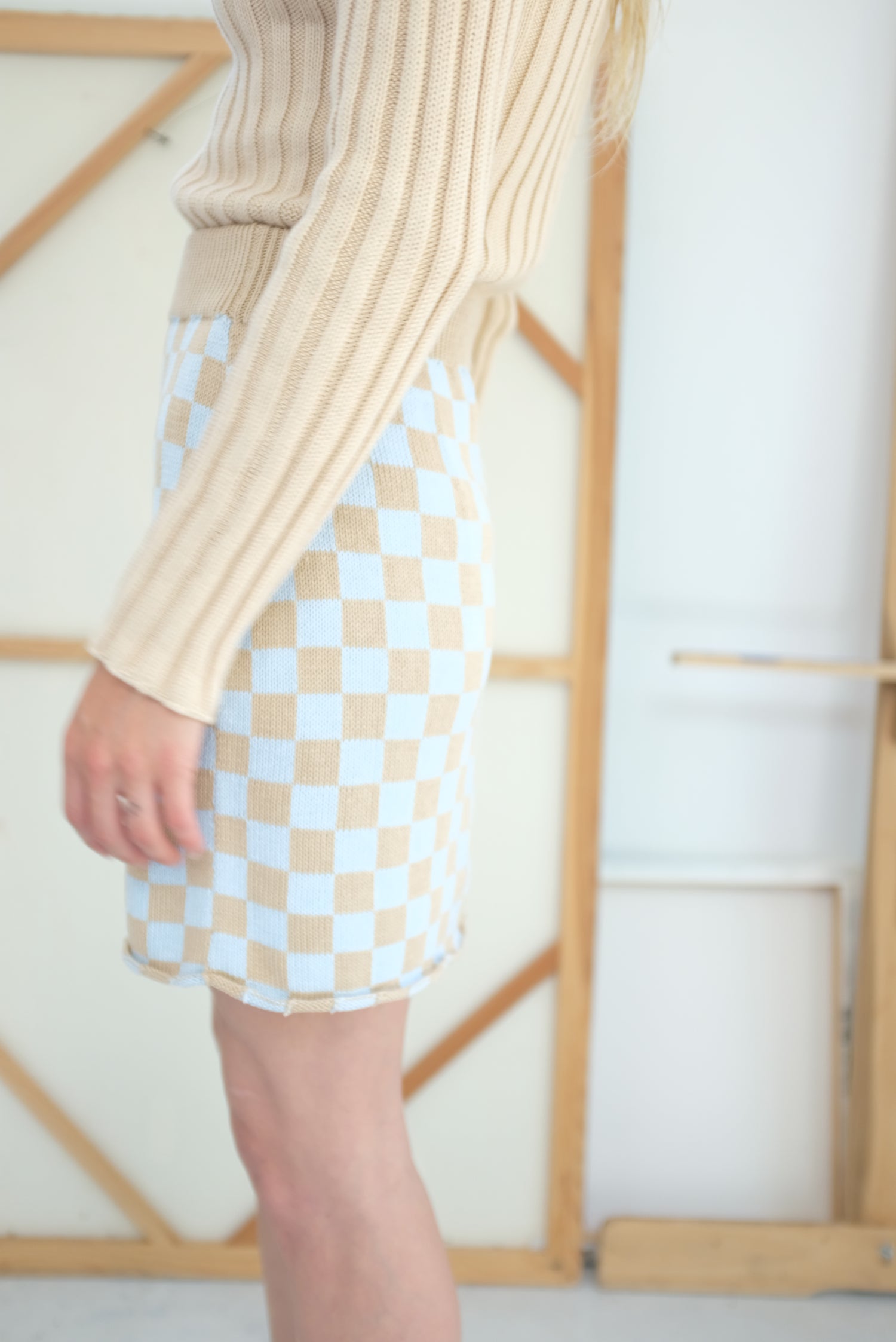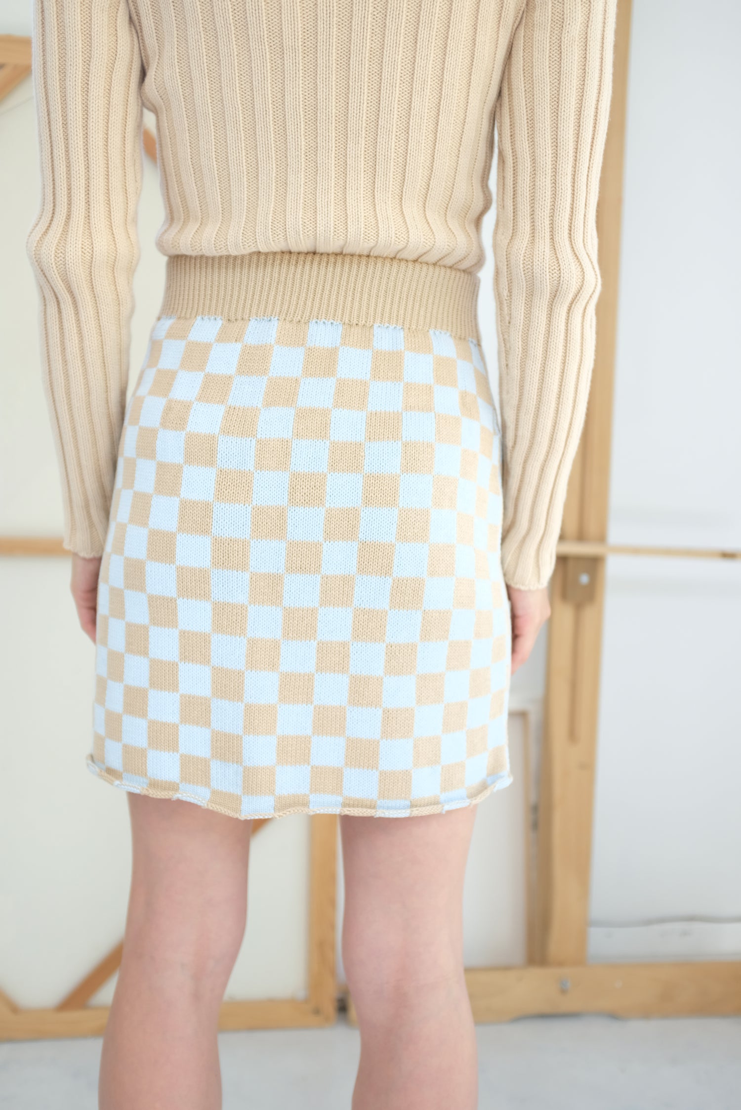 Hand knit skirt with thick gentle elastic waist, made to fit at high true waist, flattering feminine cut. Rolled edge at hemline. 100% medium weight cotton that flatters and fits. Soft washable cotton.