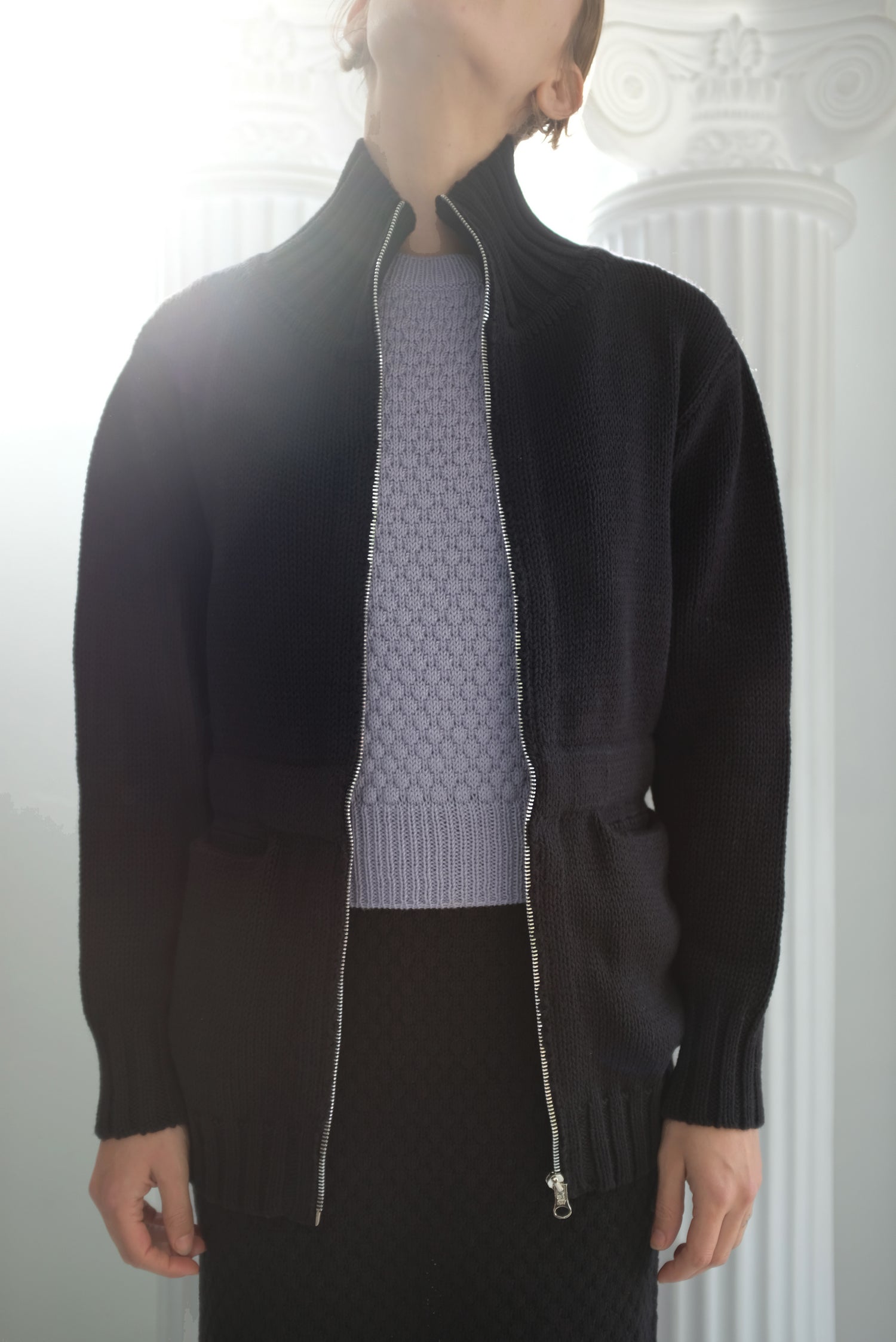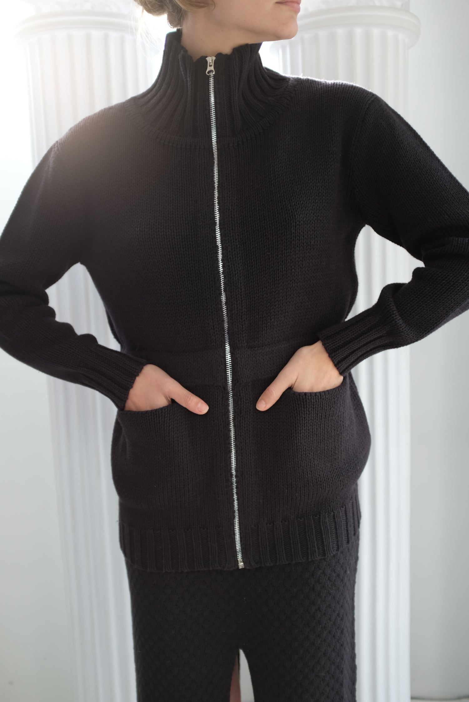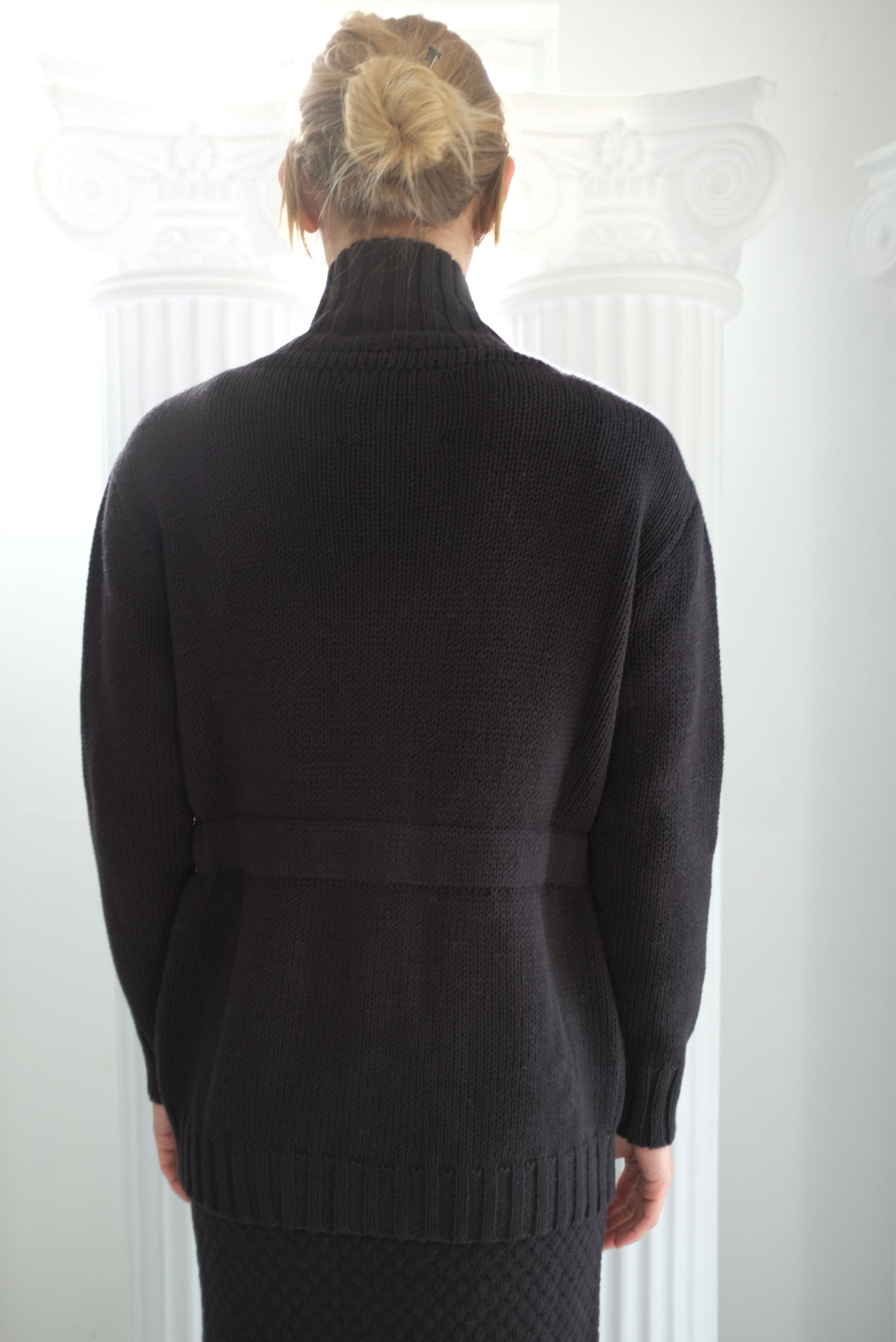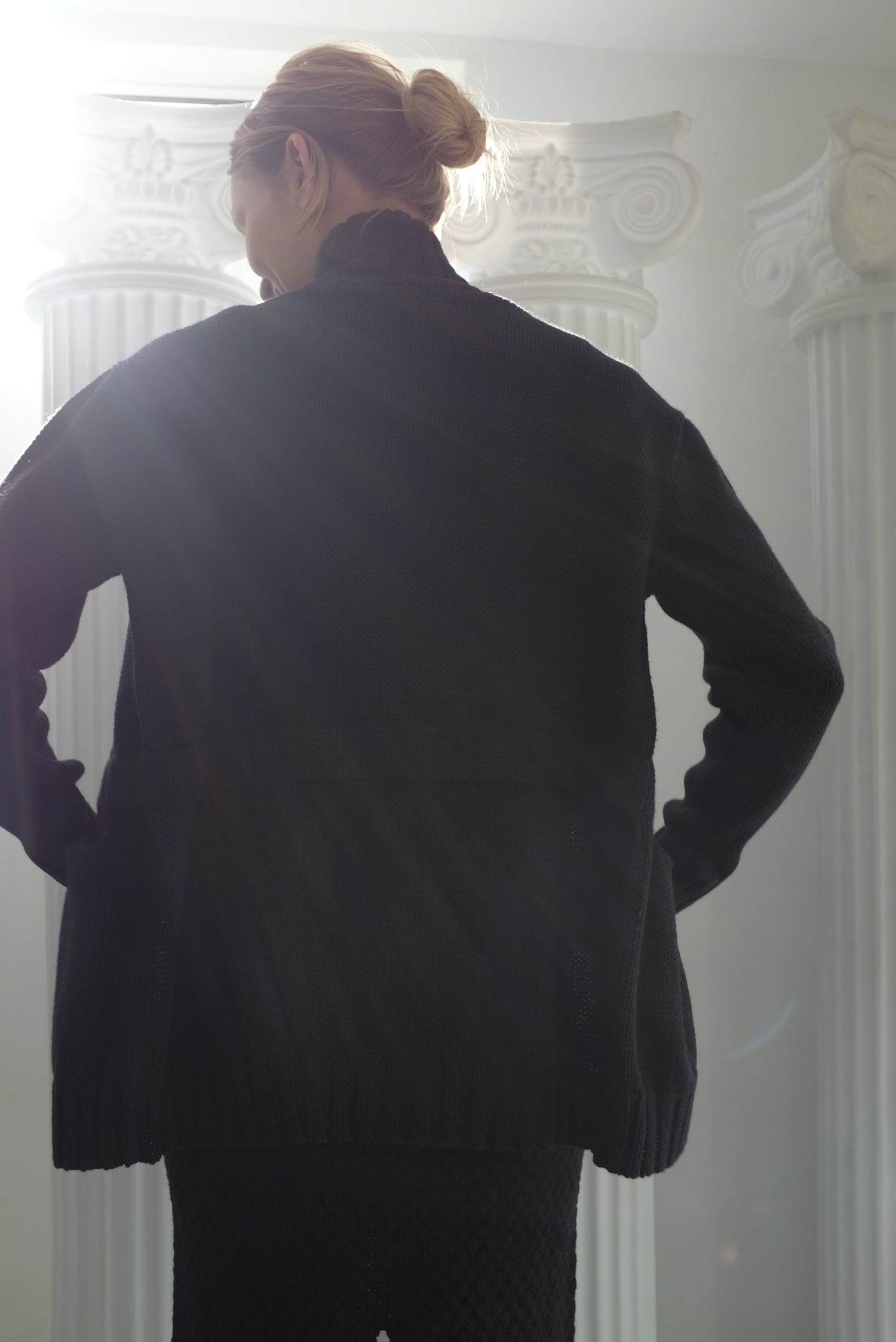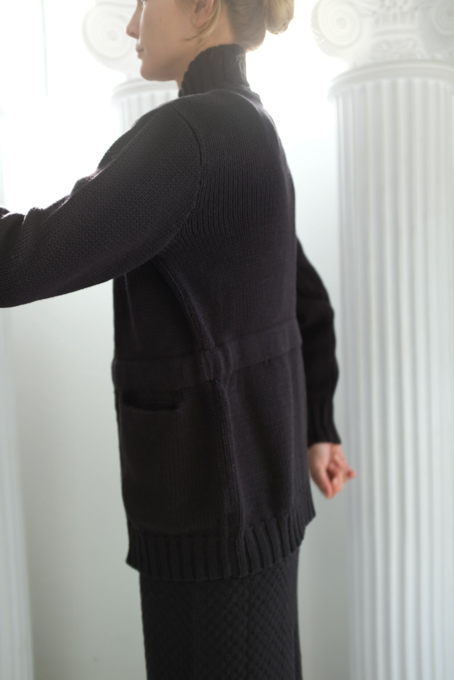 Long and warm, front pockets, high ribbed collar, every-day go-to knit outerwear. Ever so slightly oversized, with a semi fitted waist, and internal elastic structure, encouraging a gentle hourglass silhouette. Substantial weight knit.