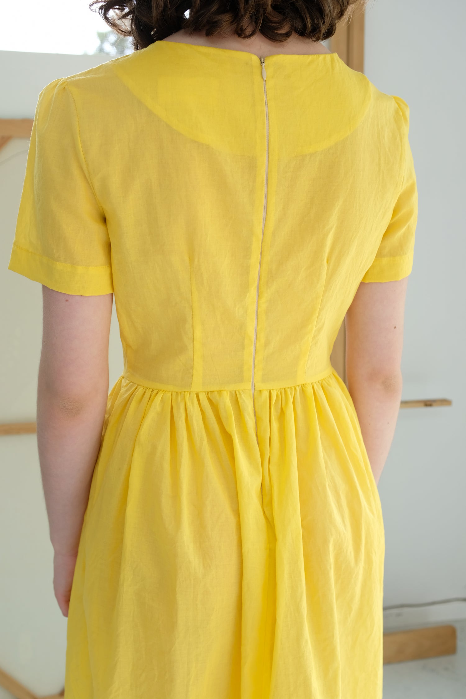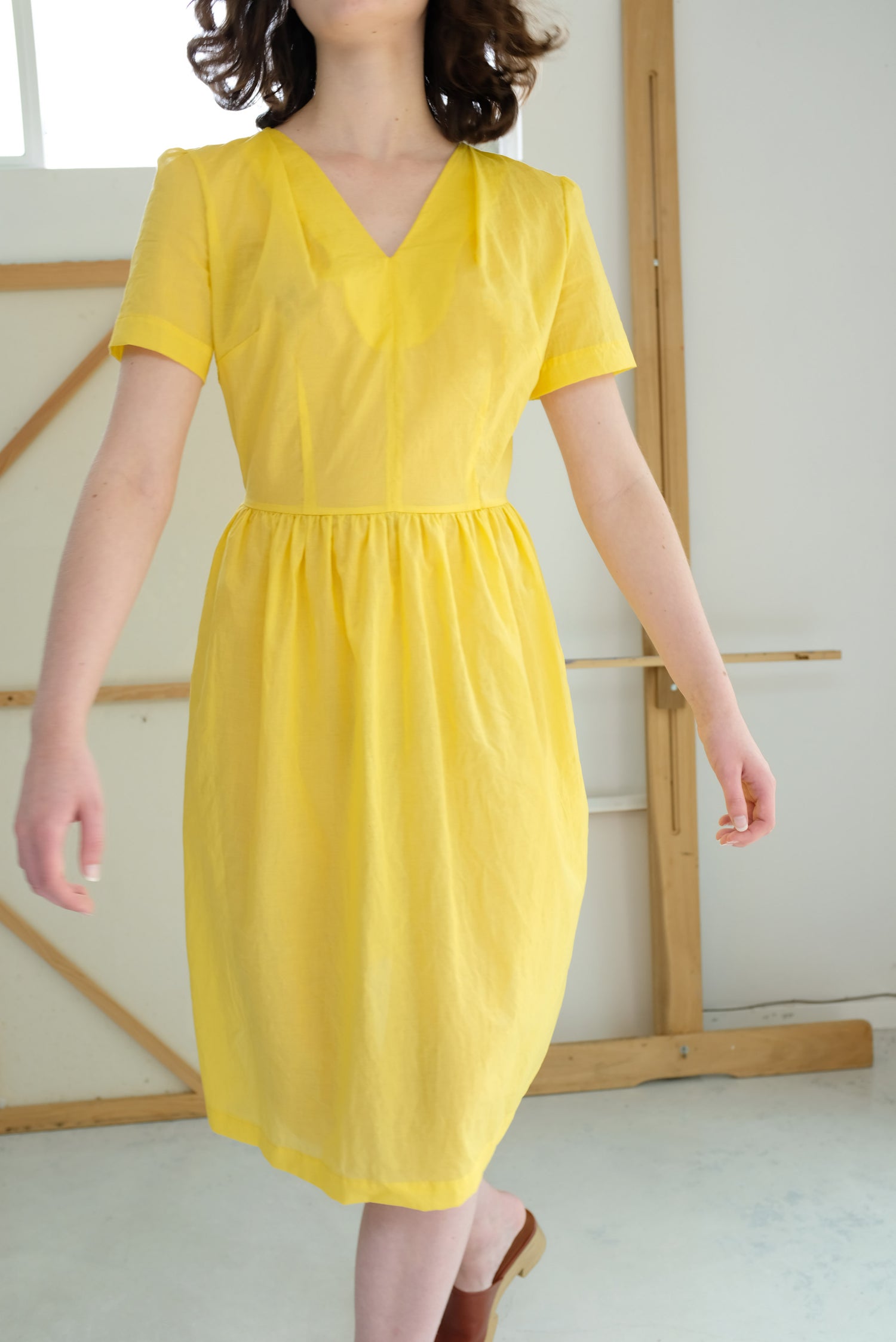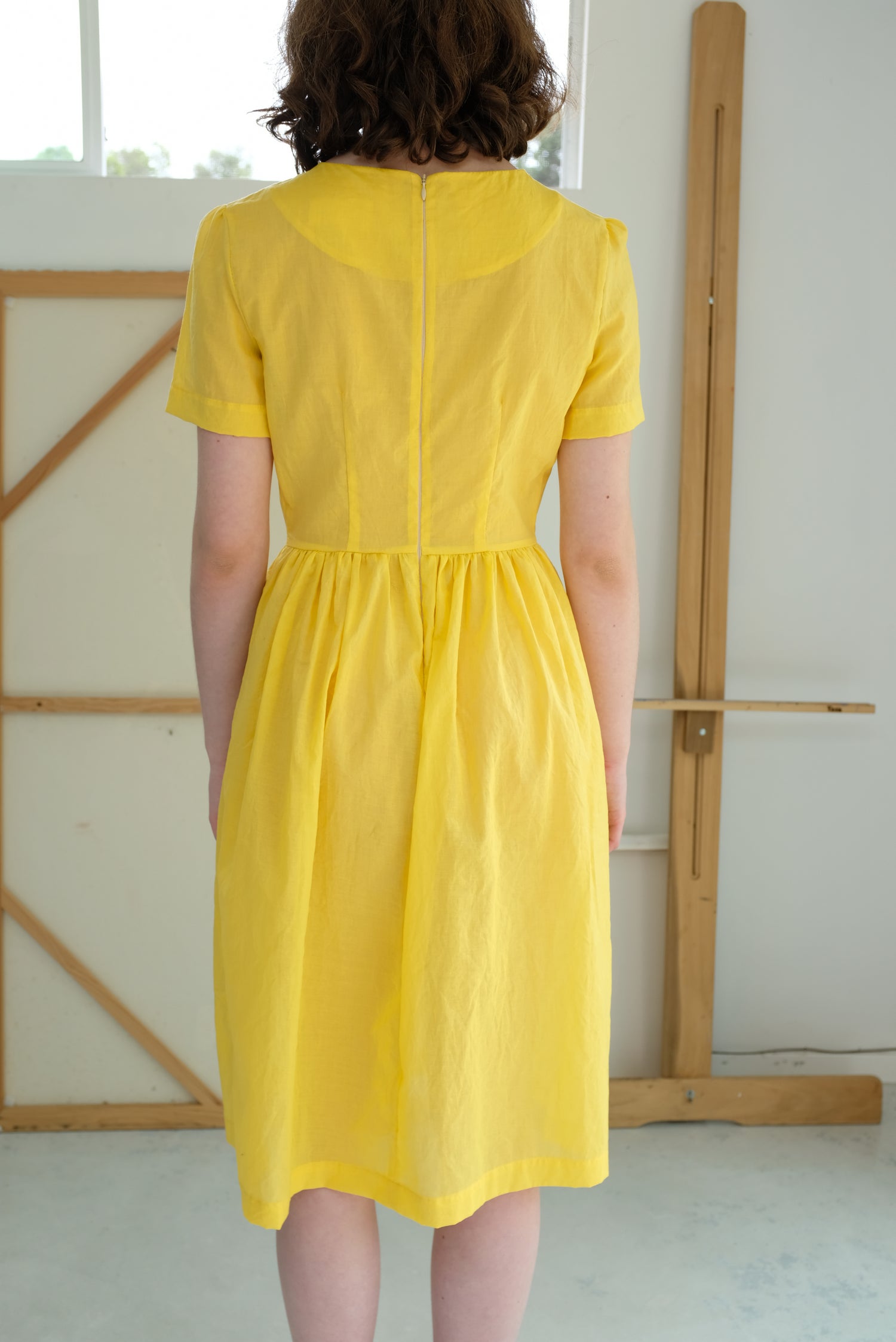100% Cotton gauze, fitted waist, short sleeve, full skirt hits just below knee, zipper in back, pleat details on shoulders and darts for fitting upper bodice front and back. Sheer gauze, light woven cotton, feminine classic fit.