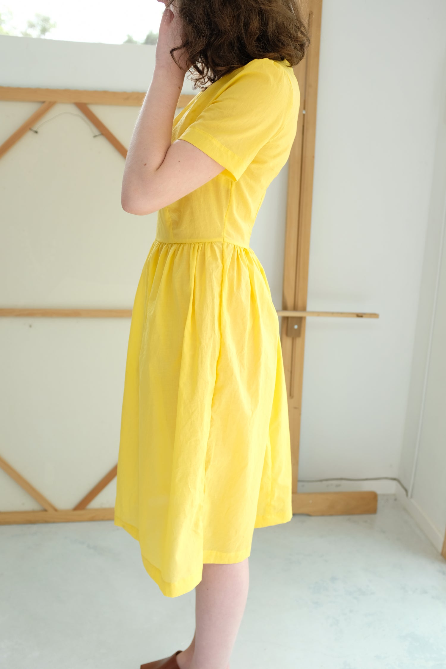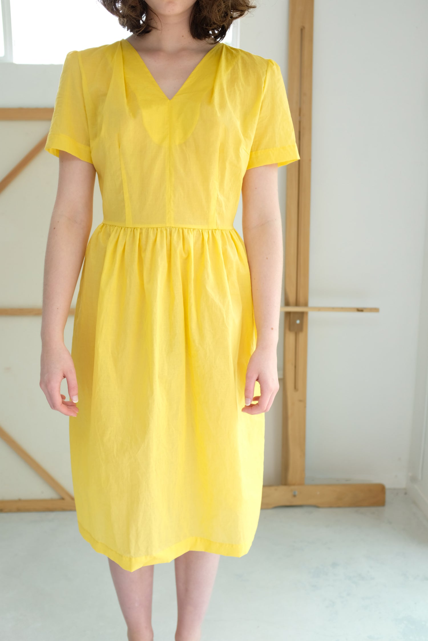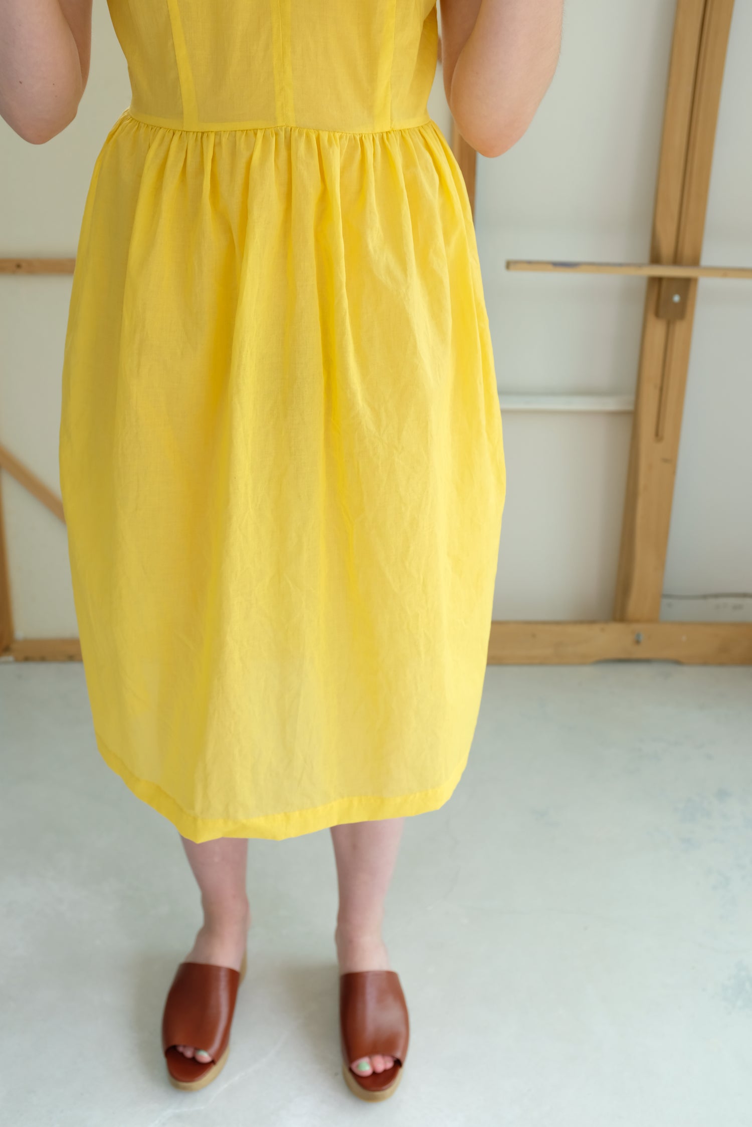 100% Cotton gauze, fitted waist, short sleeve, full skirt hits just below knee, zipper in back, pleat details on shoulders and darts for fitting upper bodice front and back. Sheer gauze, light woven cotton, feminine classic fit.