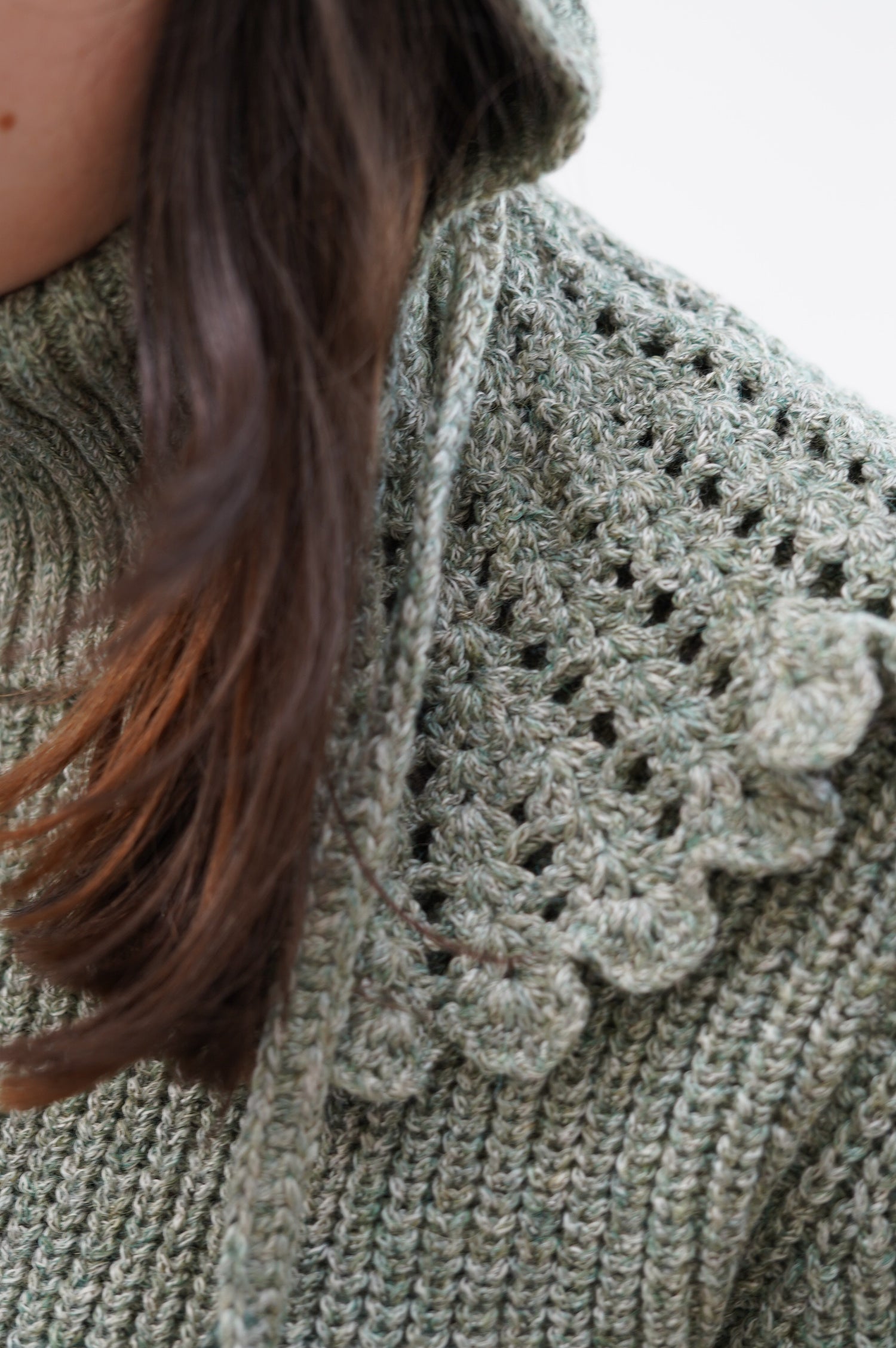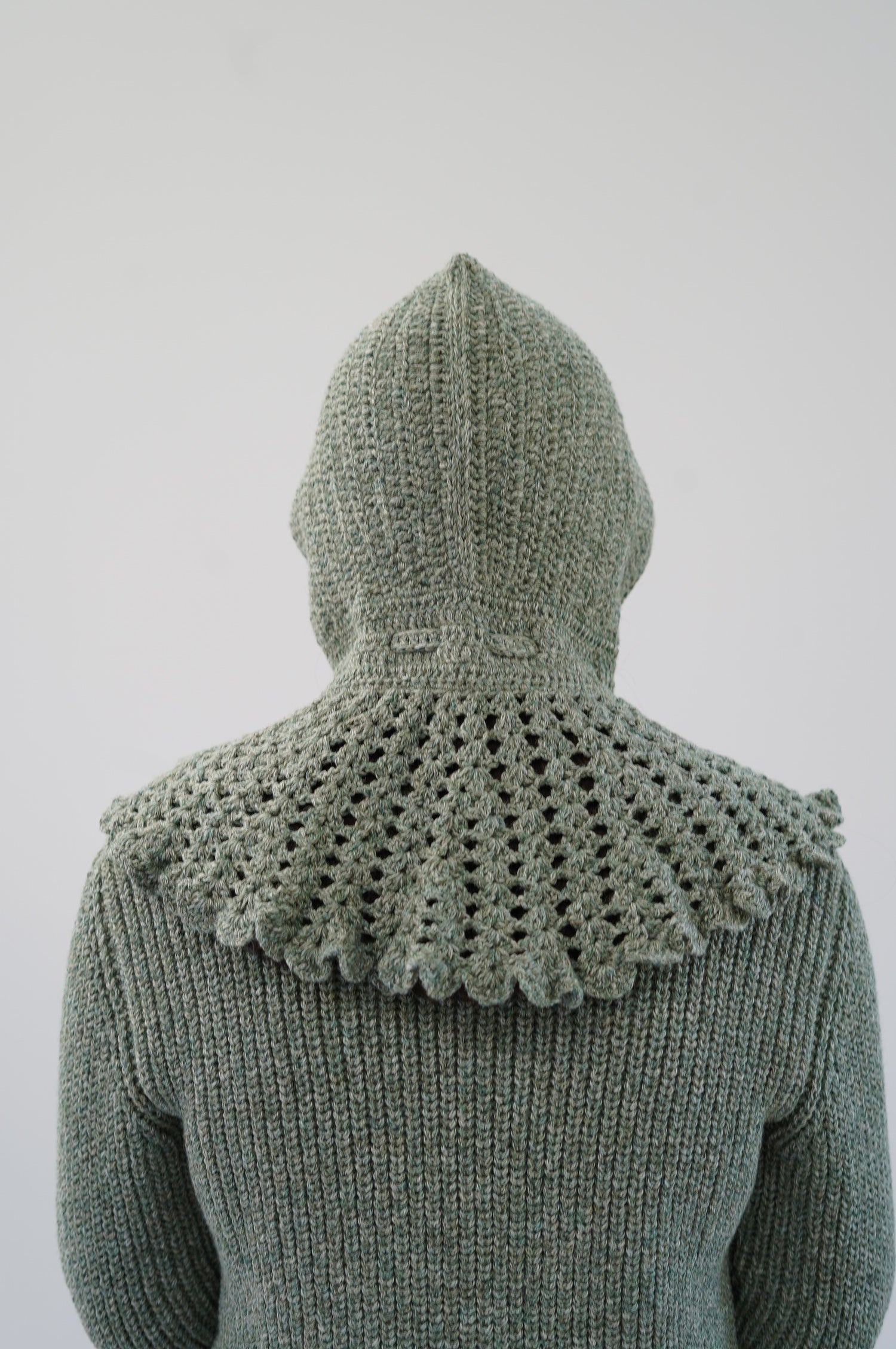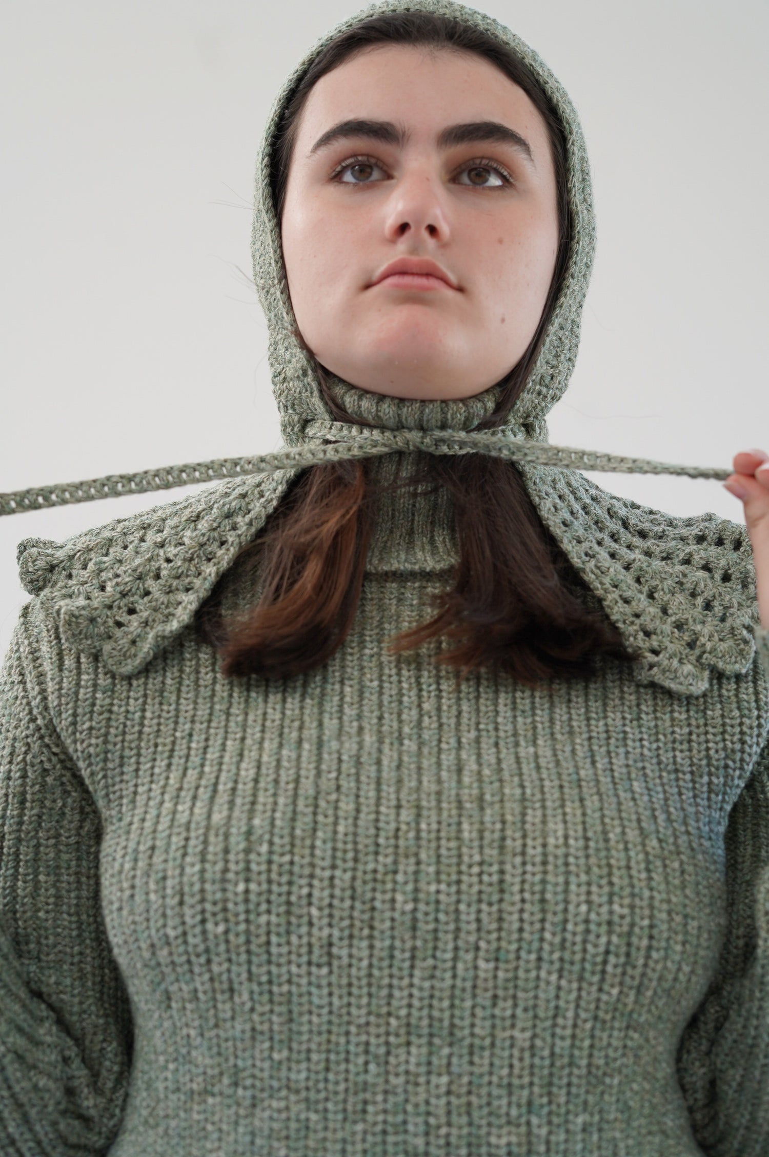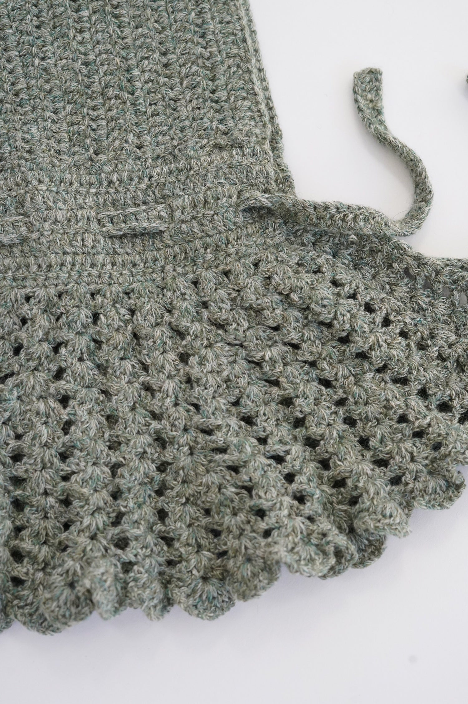 Hand crocheted, adjustable tie, warm, open lace crochet collar. 68% Baby alpaca, 32% pima cotton. One size fits most. Unisex.