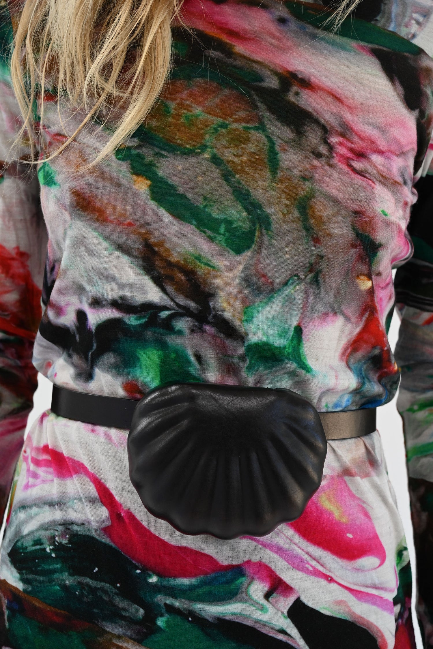Hand molded leather art piece bag, made from a hand carved wooden shell mold. Meant to be worn at true waist like a belt, size up for lower waist/hip. Fits, keys, money, chapstick and essentials very easily, but does not fit an Iphone. Folds snugly over itself and stays in place securely. 100% Leather with a brass buckle.