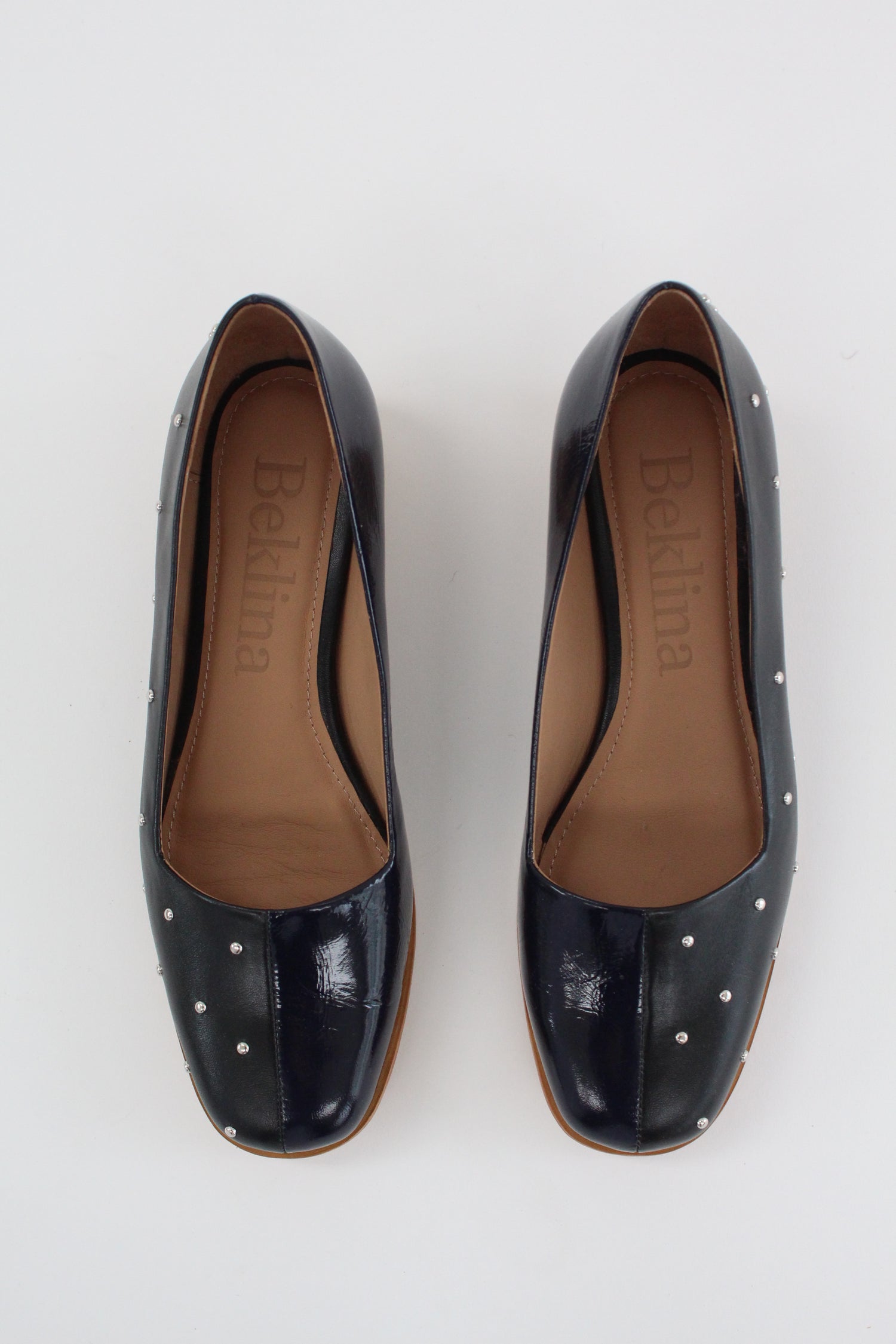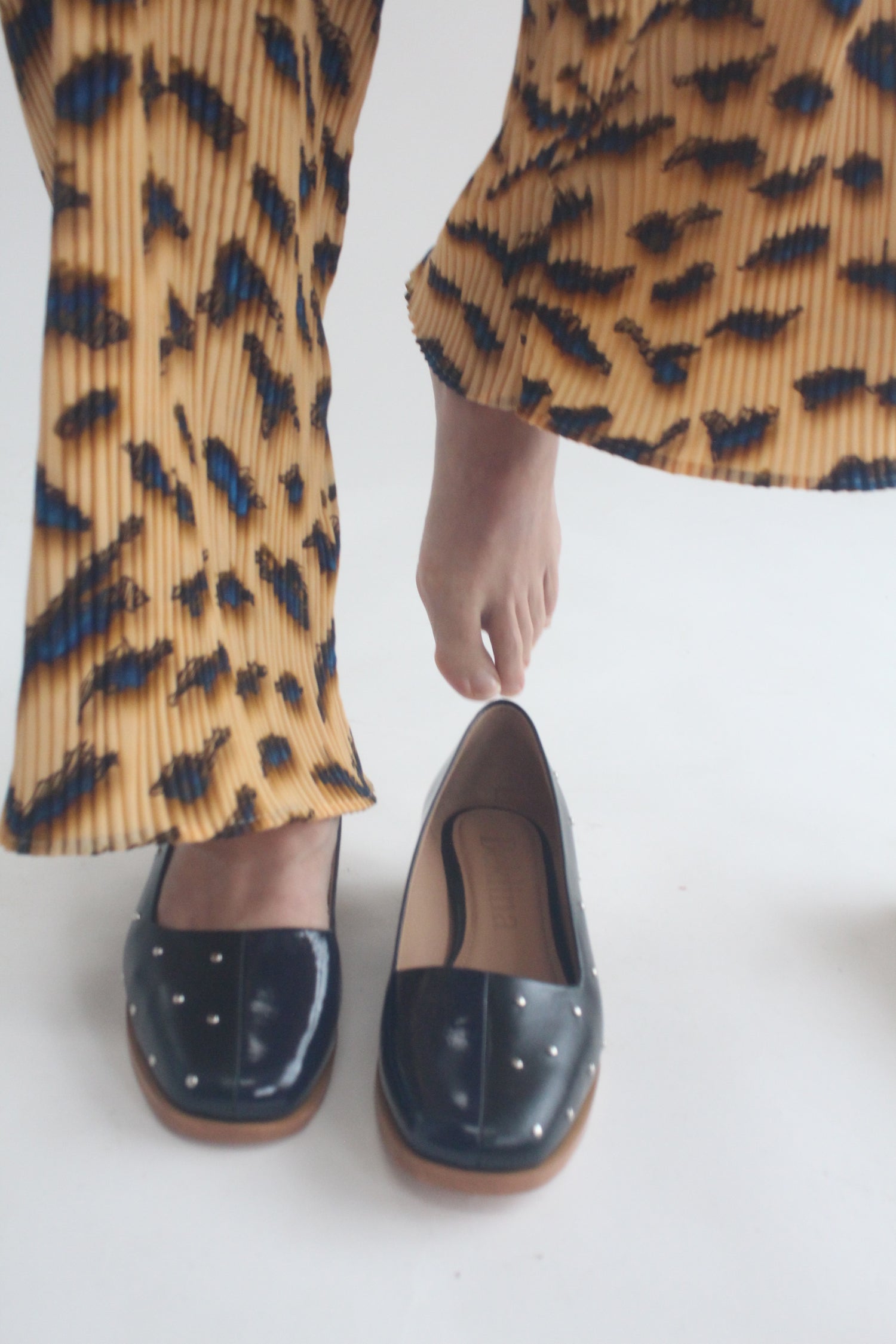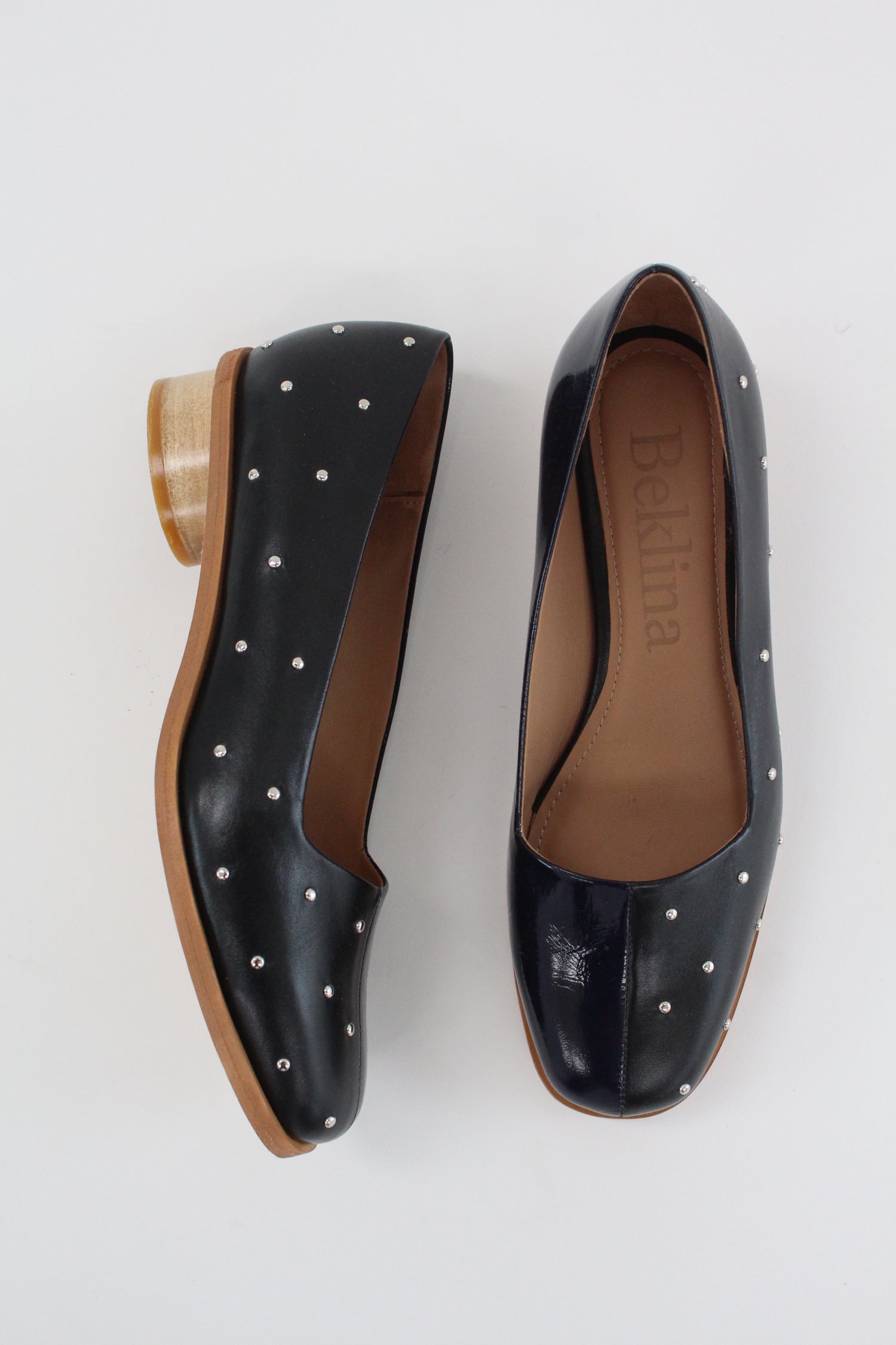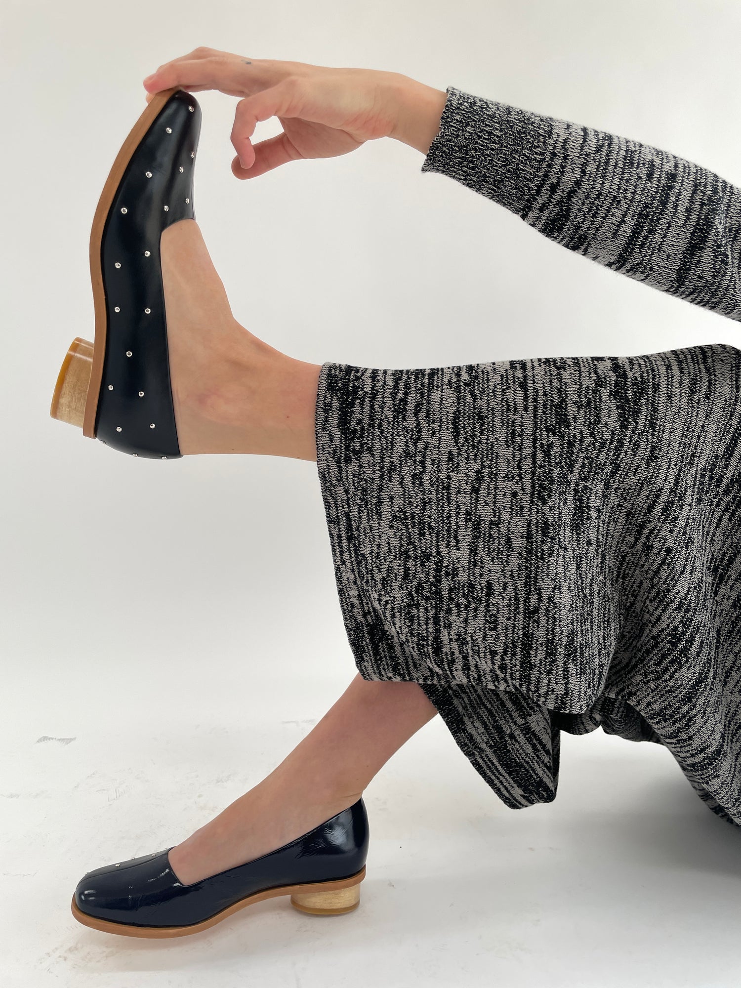 All day wearable low pump. Contrasting right and left sides, one side stud covered black leather, and the other navy patent leather. Leather sole with hand carved rounded wood heel and leather welt. Leather lined.