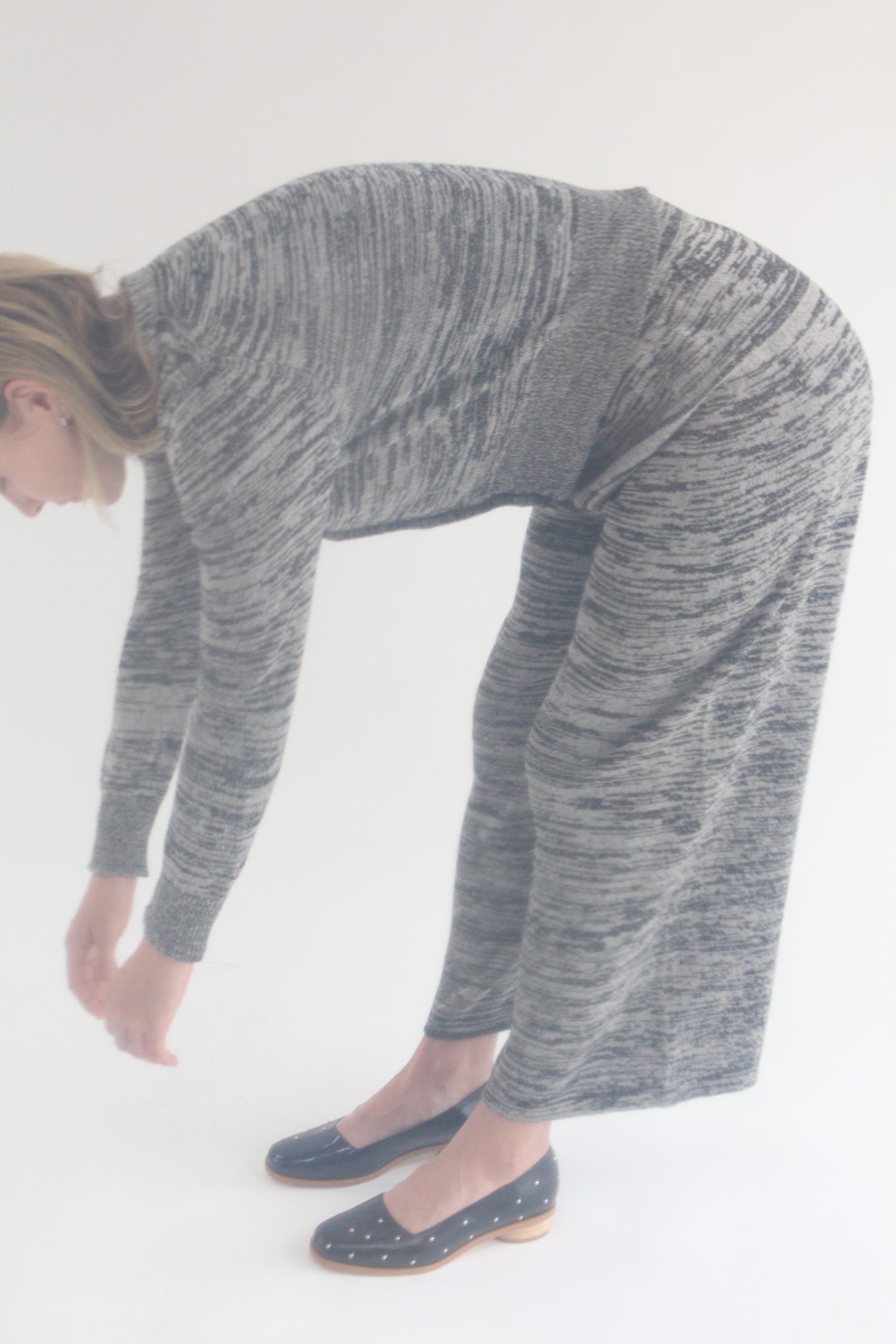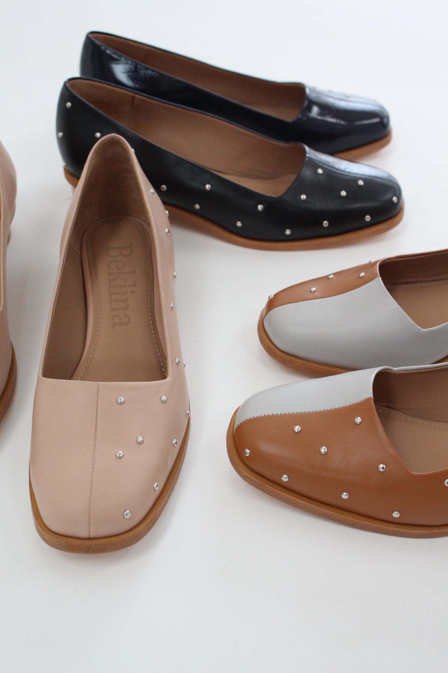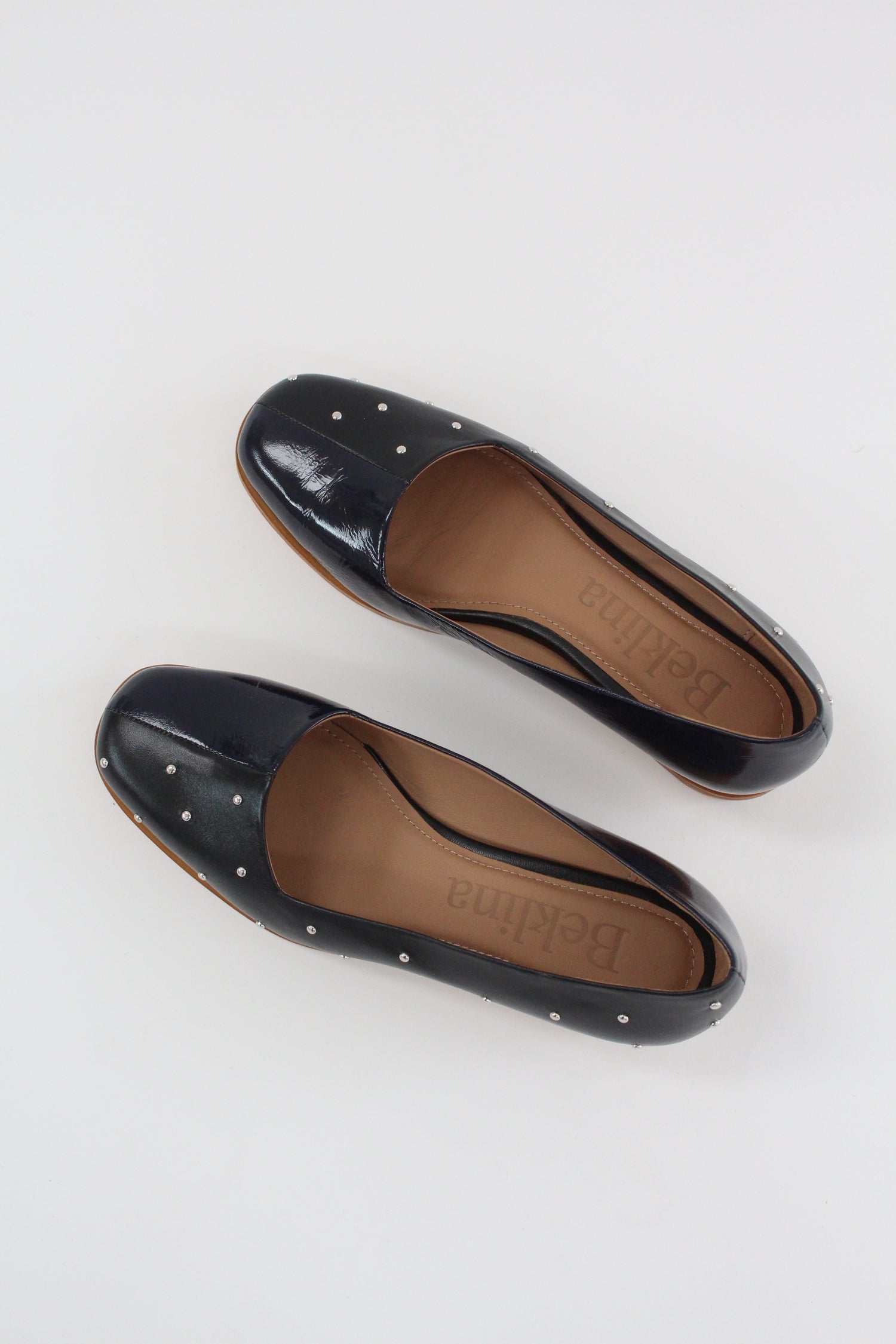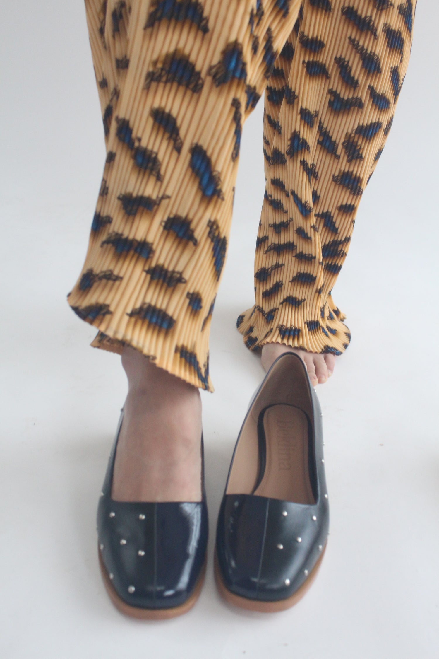 All day wearable low pump. Contrasting right and left sides, one side stud covered black leather, and the other navy patent leather. Leather sole with hand carved rounded wood heel and leather welt. Leather lined.