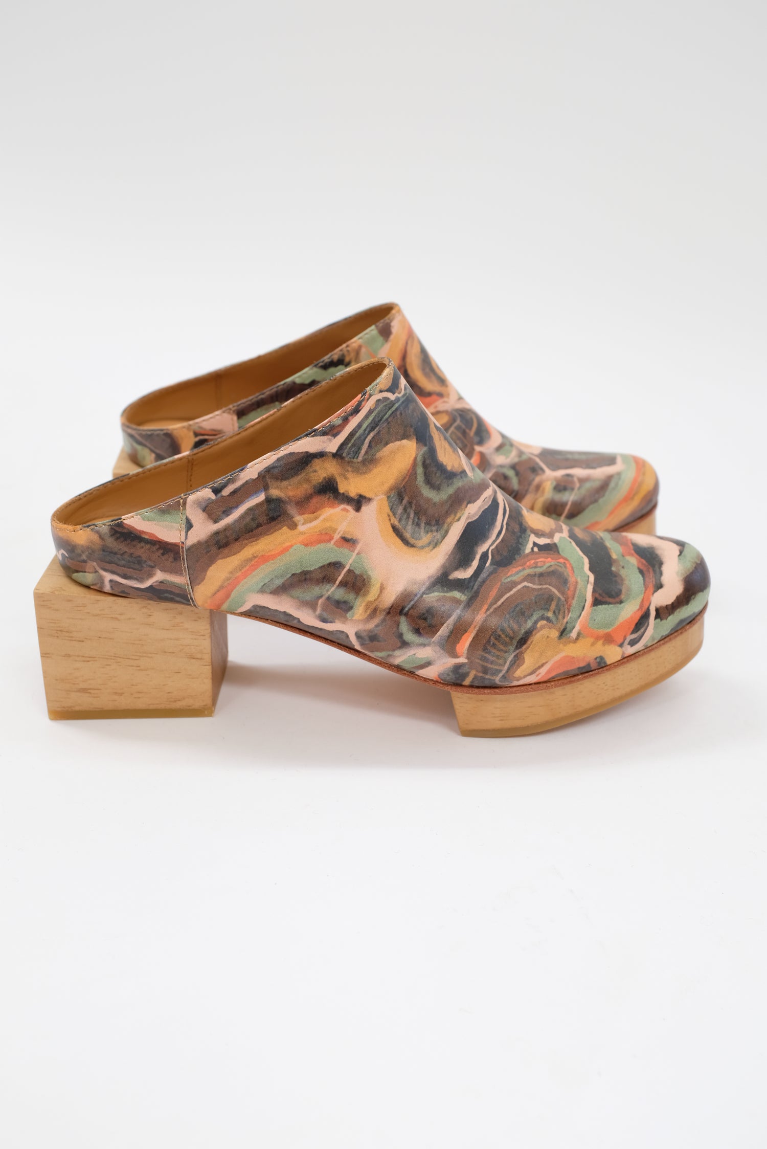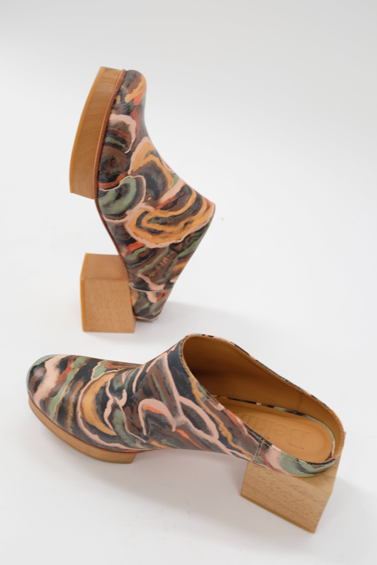 Hand carved wooden platform split heel, comfy mule slide upper 100% Italian leather uppers and leather lined. 2" back heel and 1" front platform. The heel is split in two parts, allowing the shoe's middle leather layer base to bend, making it very wearable and ultra comfortable.