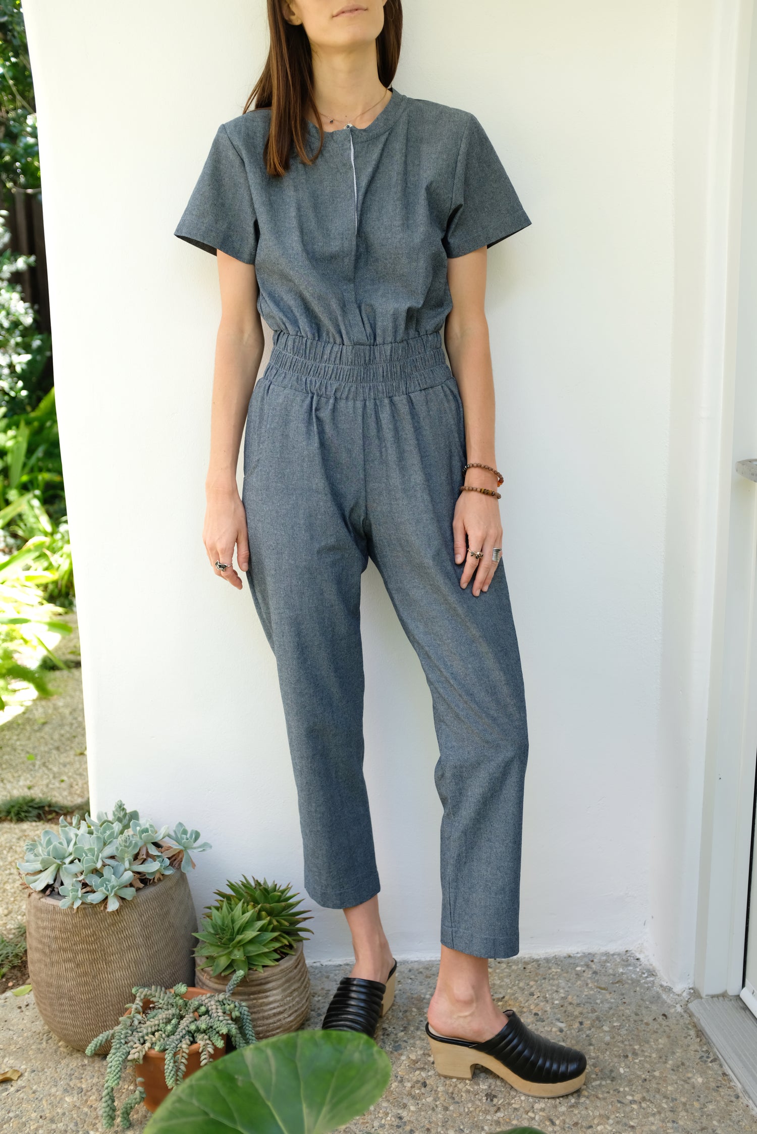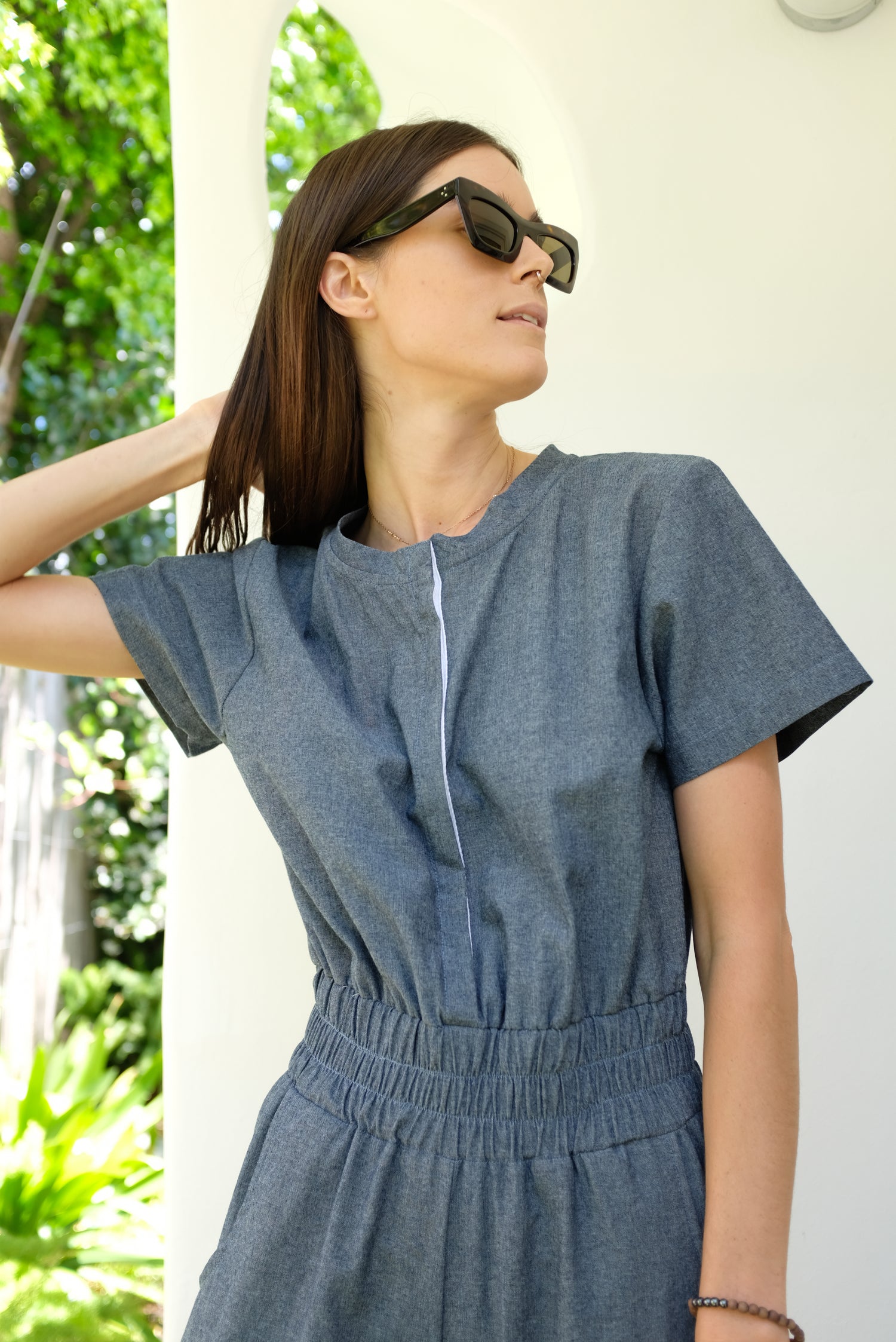 100% Organic cotton chambray. Gentle wide elastic true waist, snaps down front, side pockets, loose fitting. Total length from shoulder to hem is 55”. Abigail is wearing size small/medium and she is 5' 9".