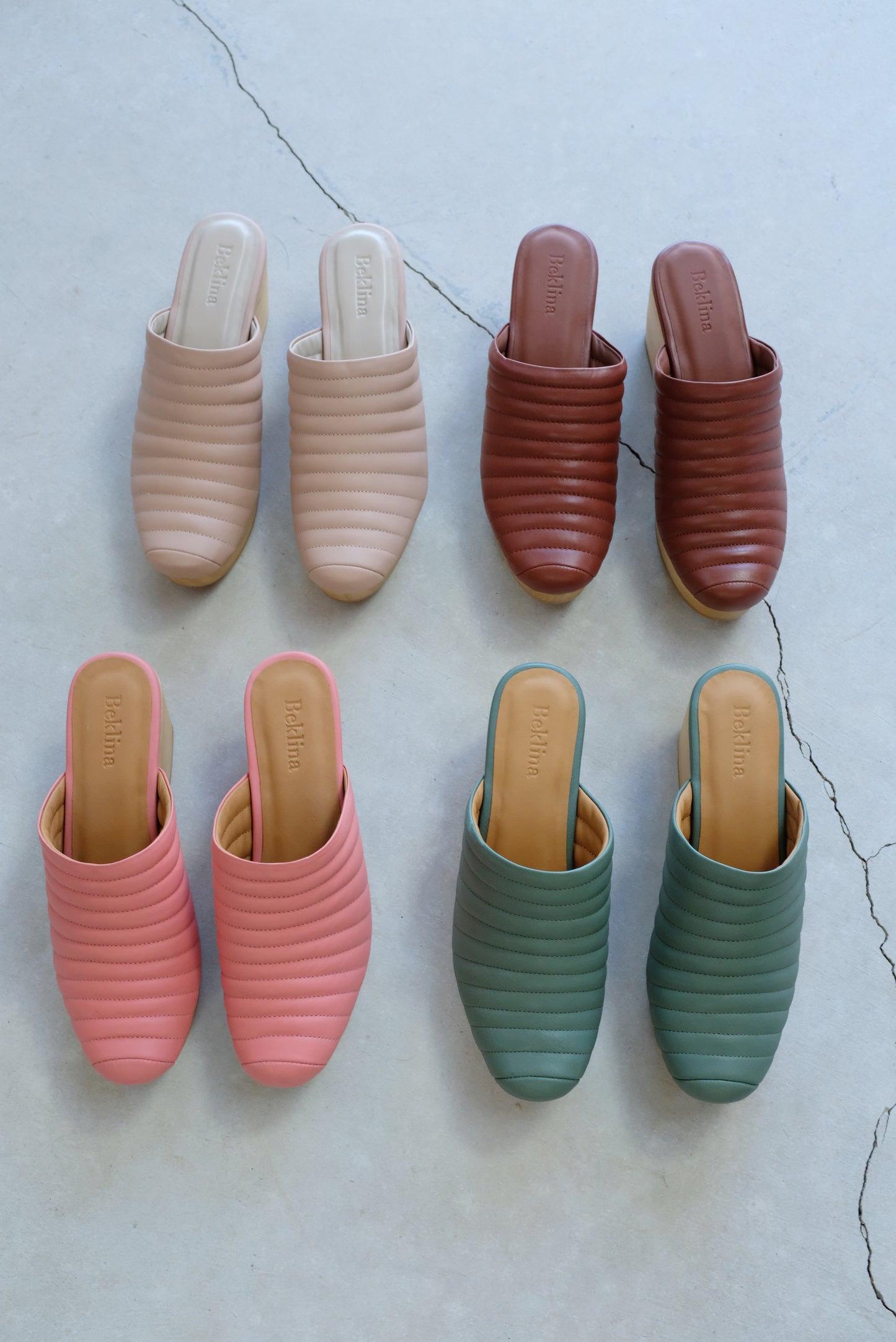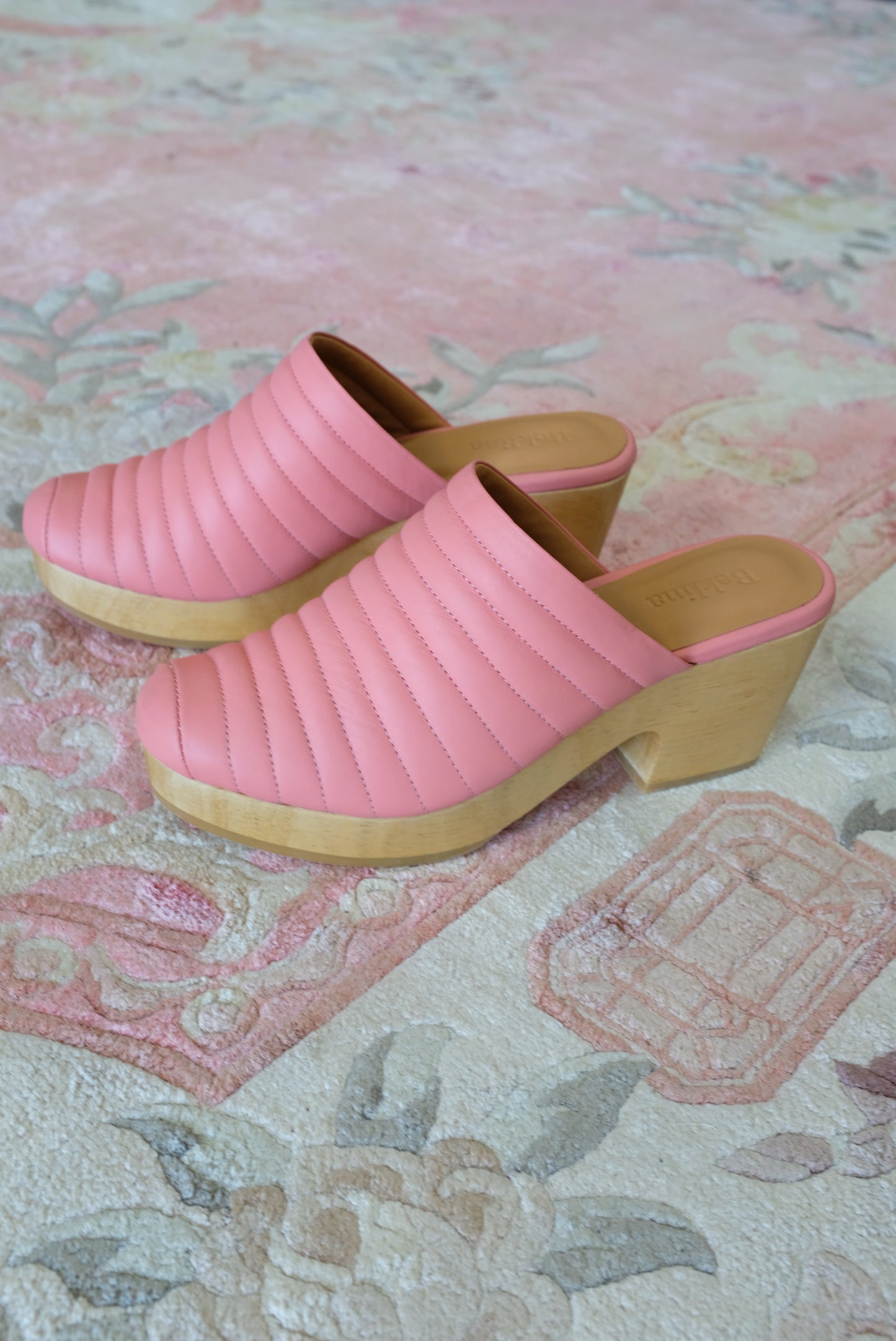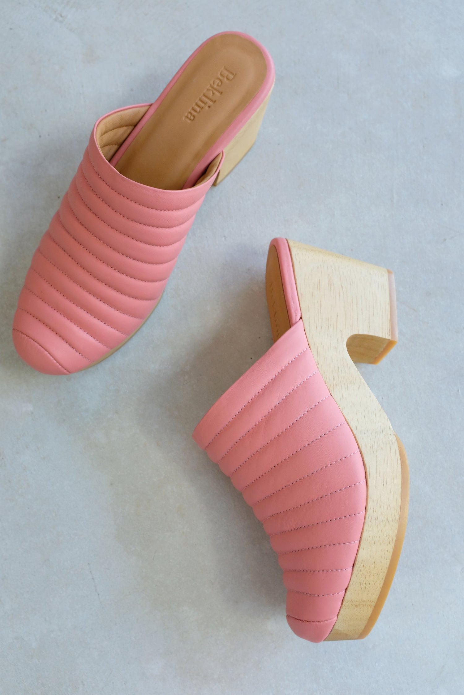 Hand carved wooden platform heel, 100% Italian leather uppers and leather lined. 2 1/2" heel. Ultra comfortable, all-day-wearable, wood wedge clogs! Free of staples.