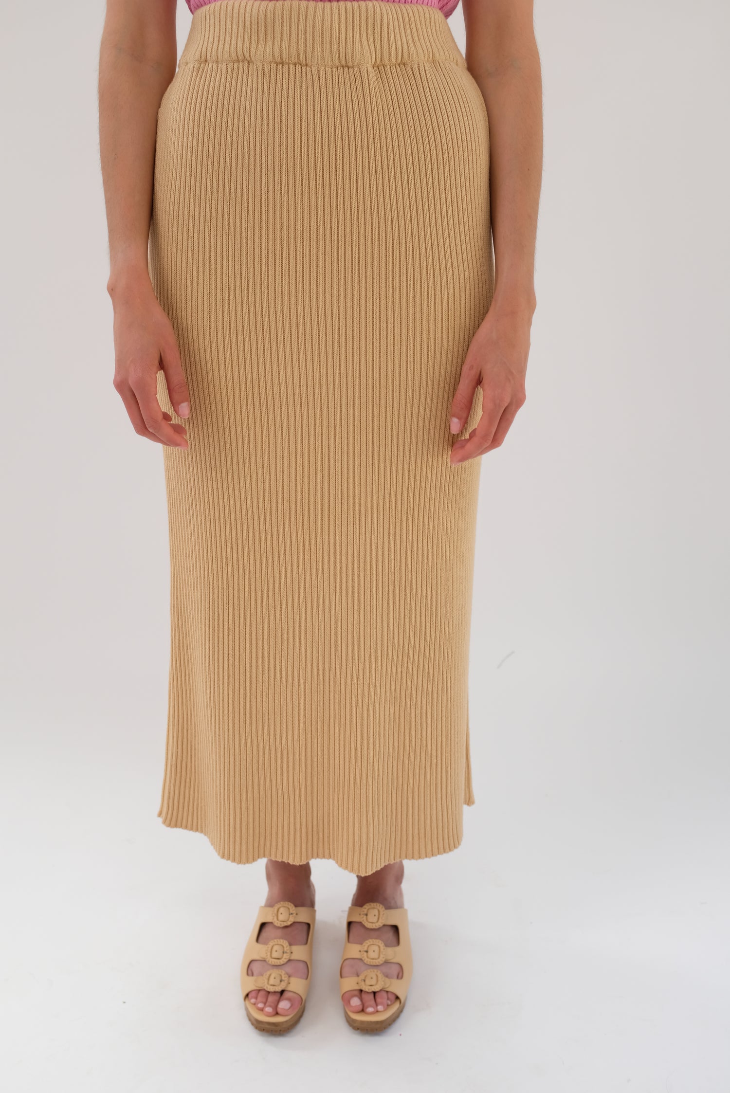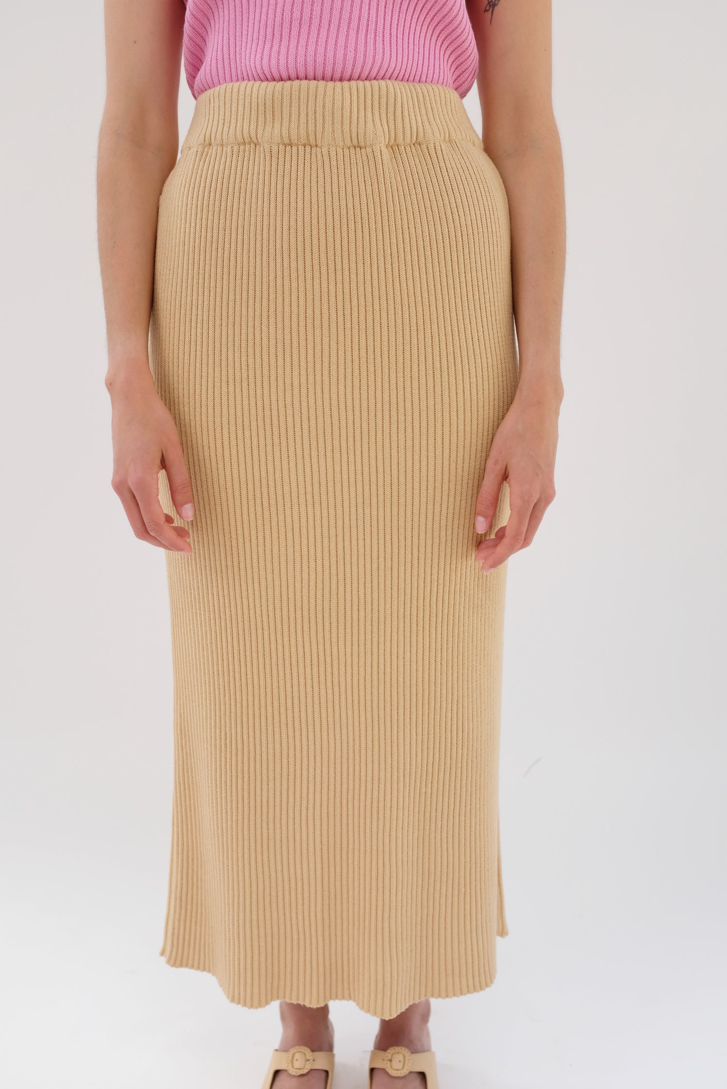 100% Ultra soft cotton knit, ribbed medium weight skirt. Elastic gentle waist, 14" center back slit. Model is wearing size s/m. Runs true to size and easy fitting.