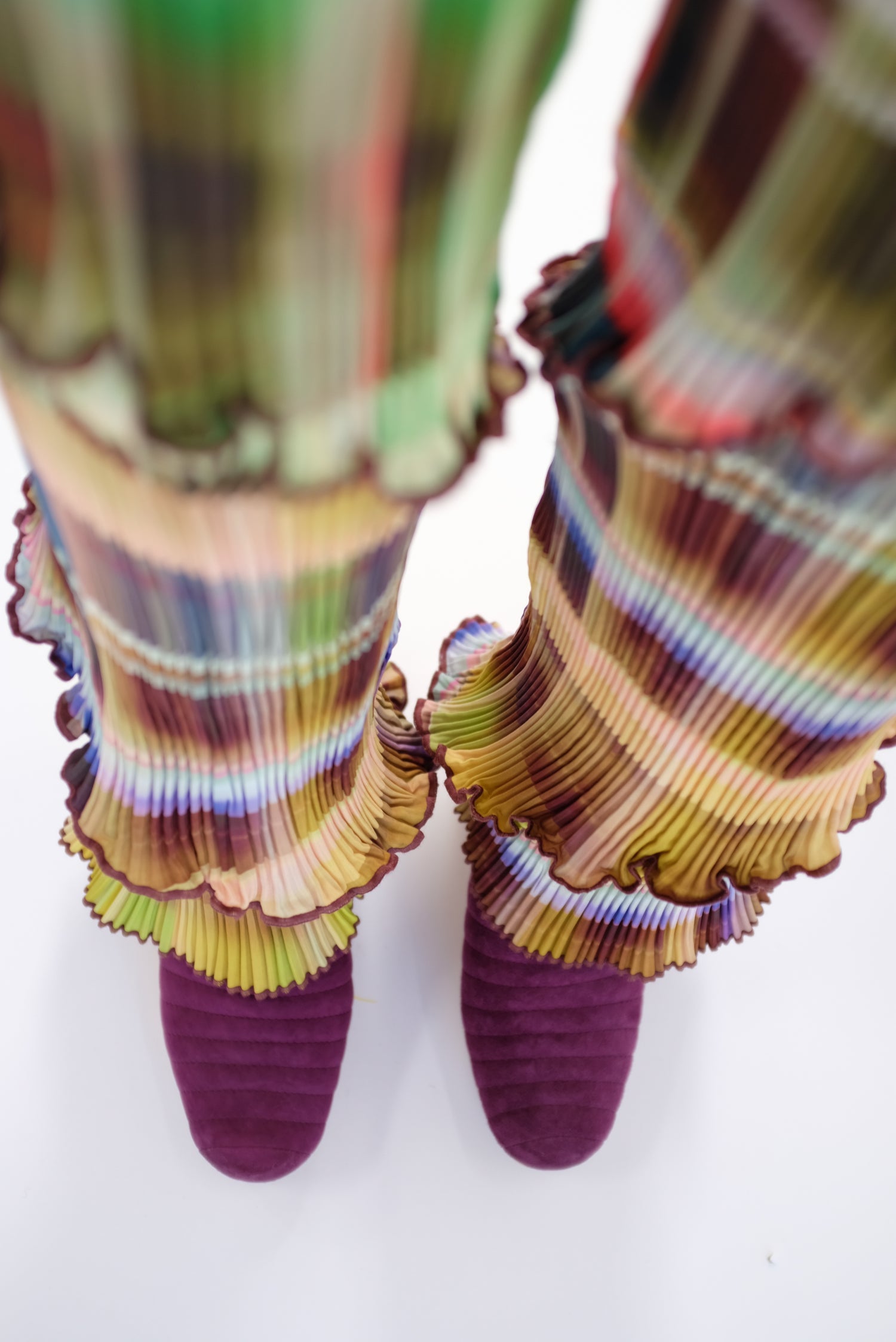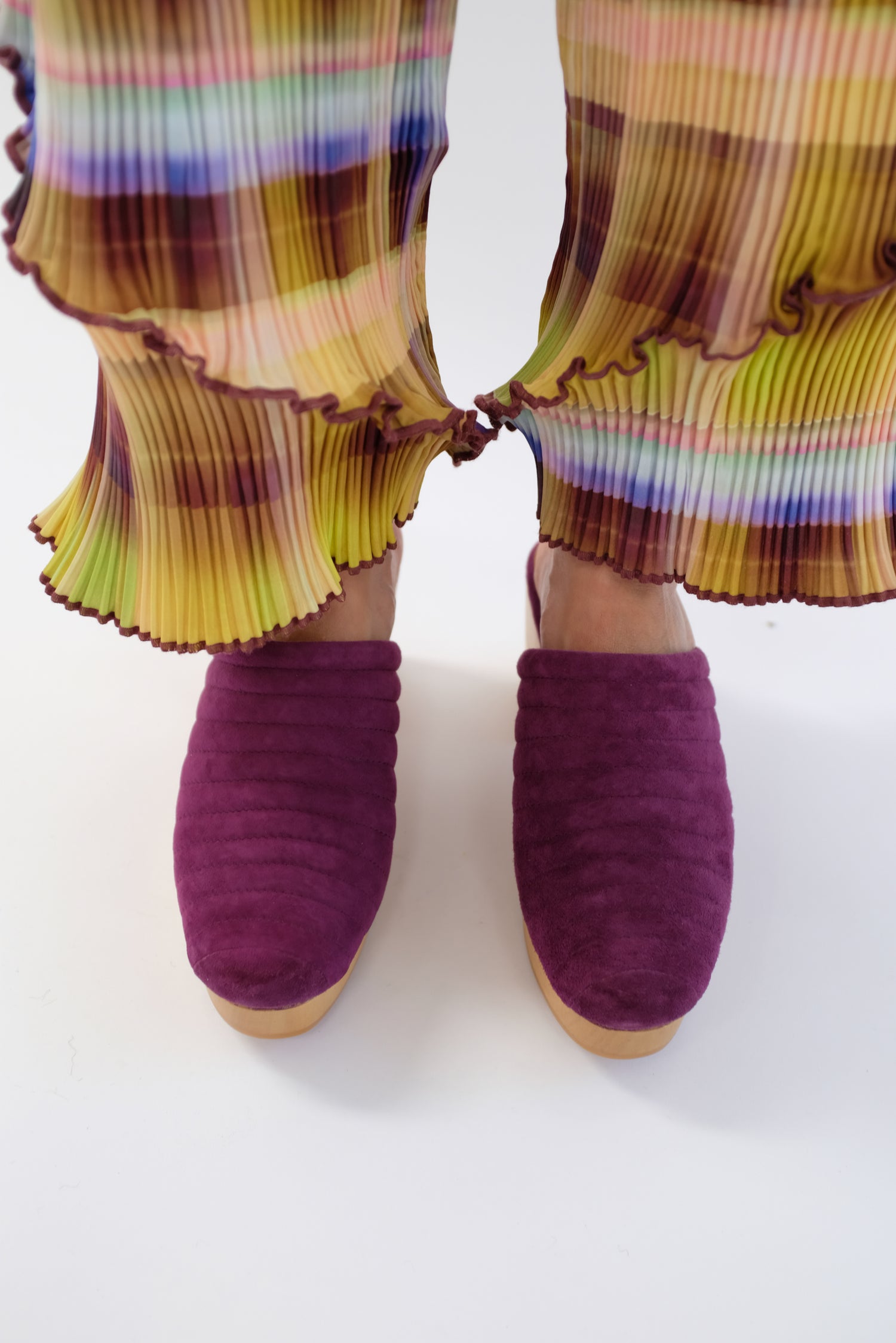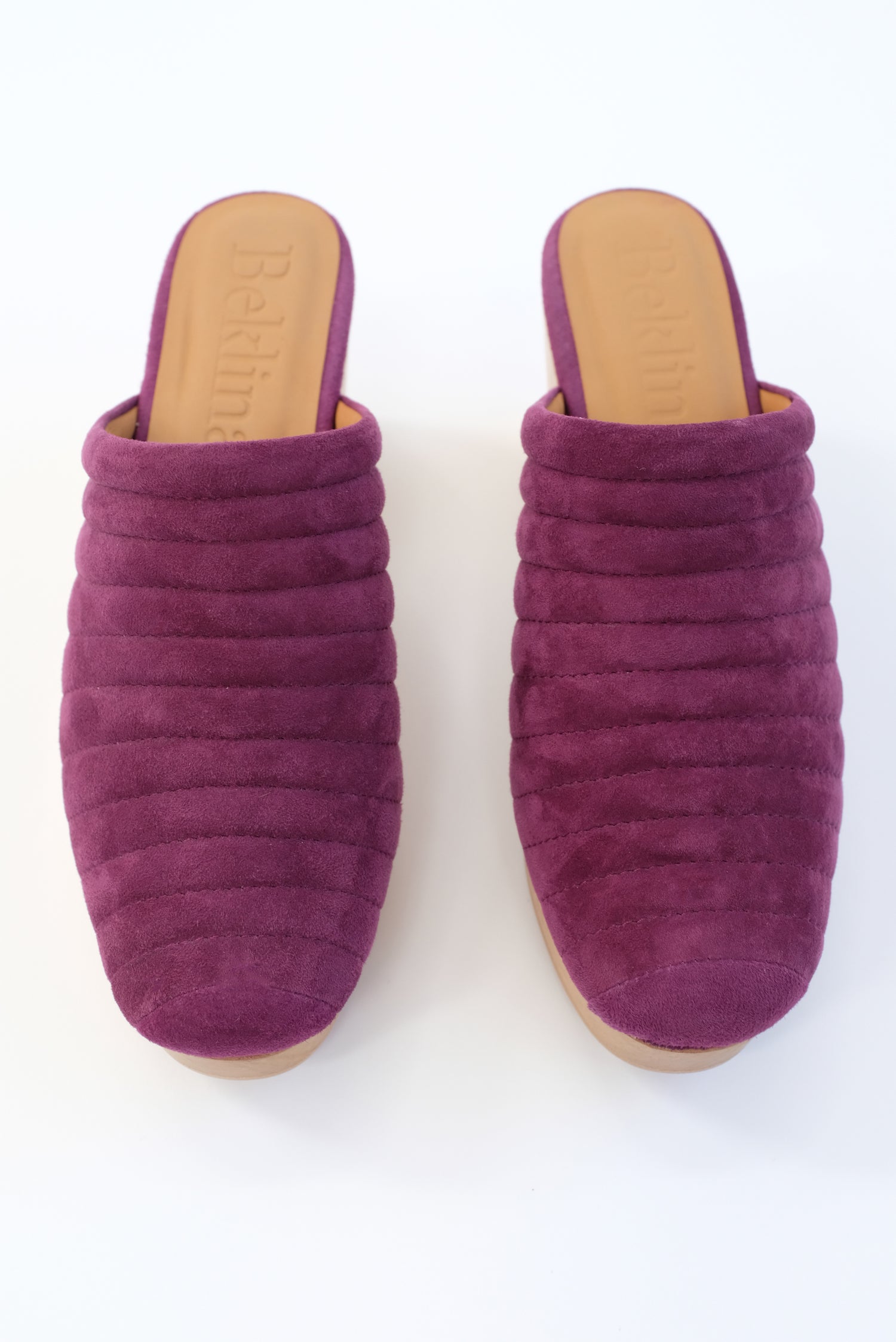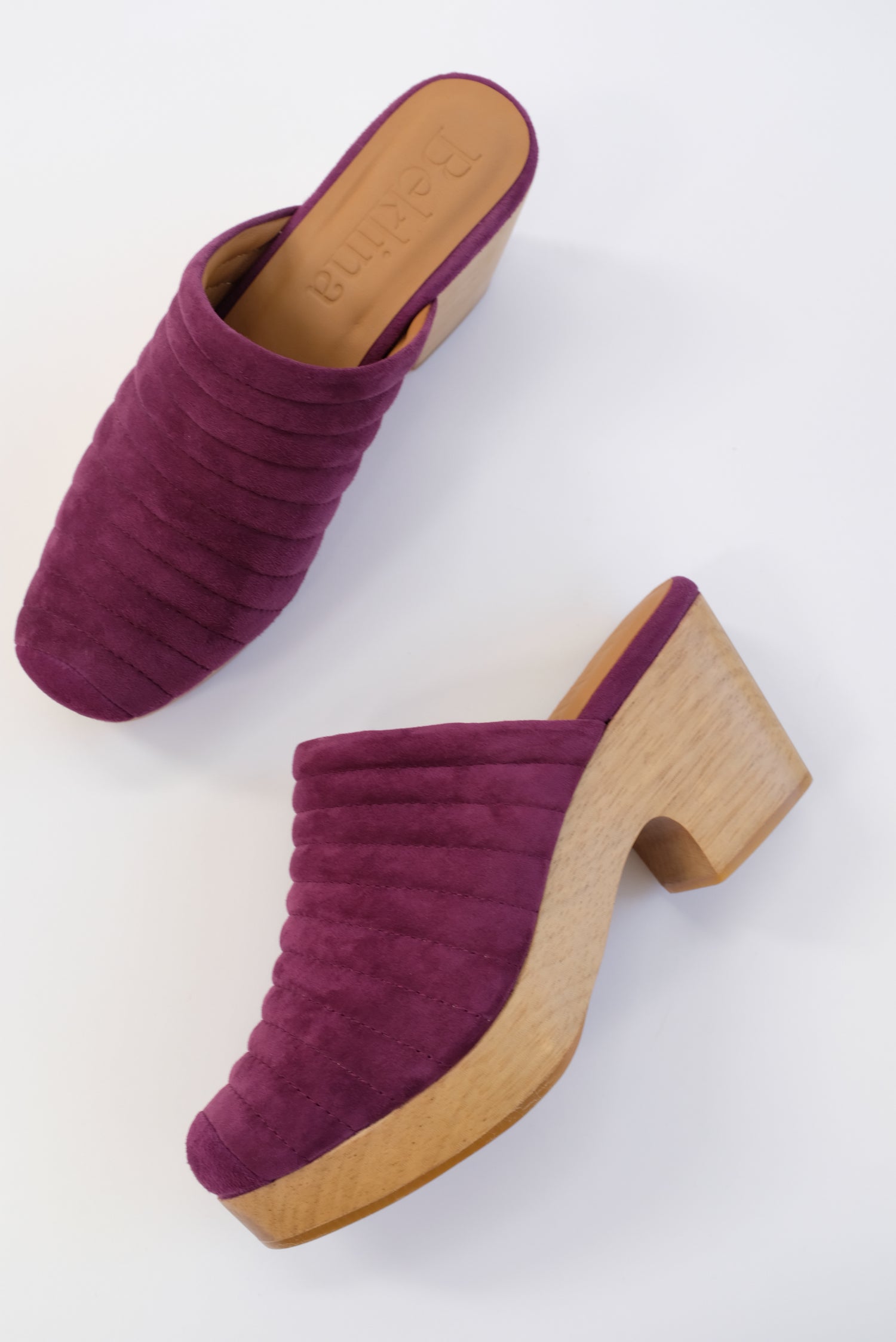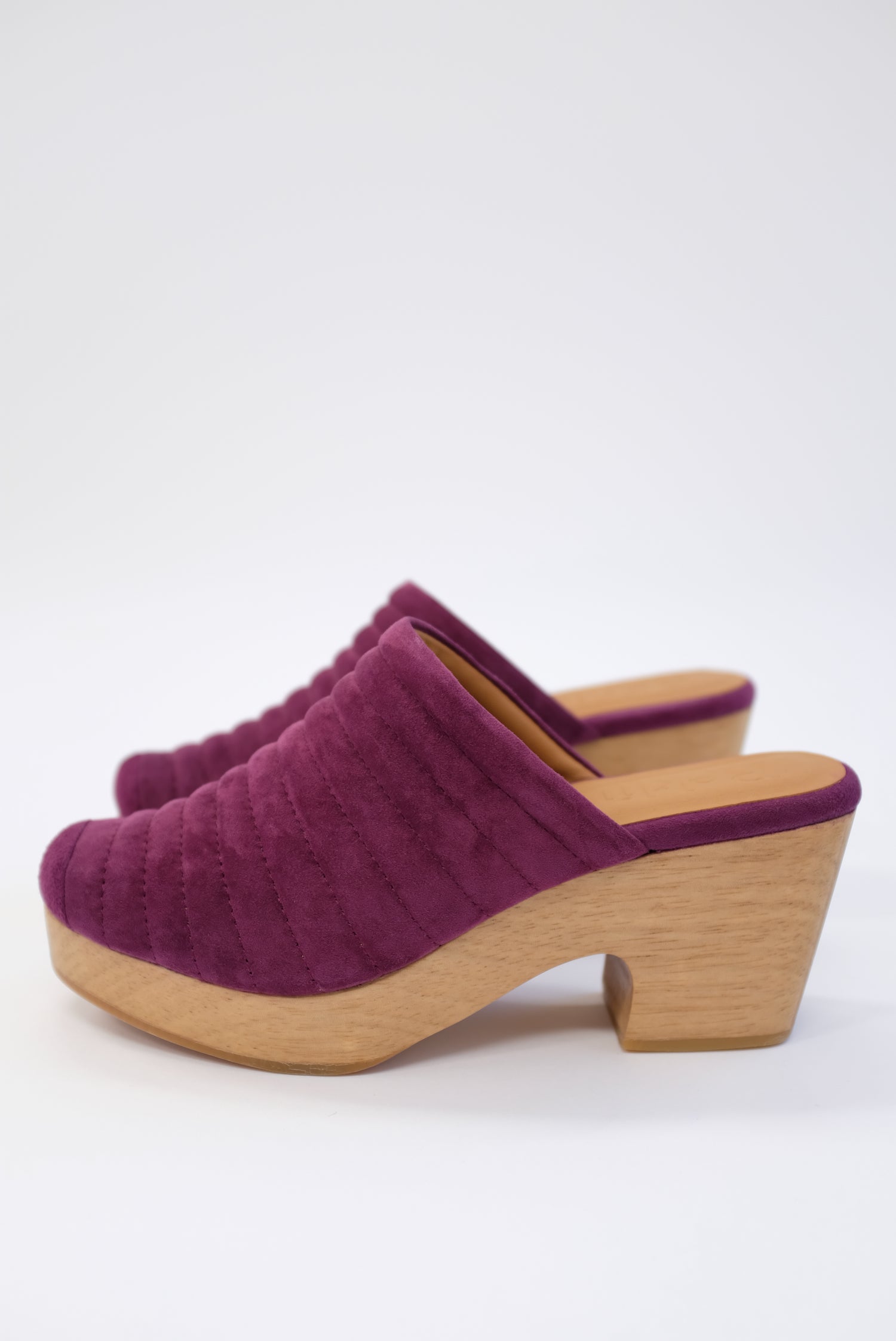 Hand carved wooden platform heel, 100% suede leather uppers and leather lined. 2 1/2" heel. Ultra comfortable, all-day-wearable, wood wedge clogs. Free of staples. Running true to size. If between sizes or on the wider side, we suggest going up a half size.
