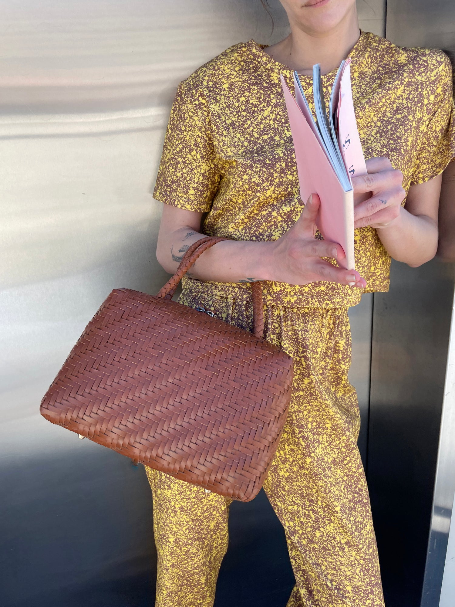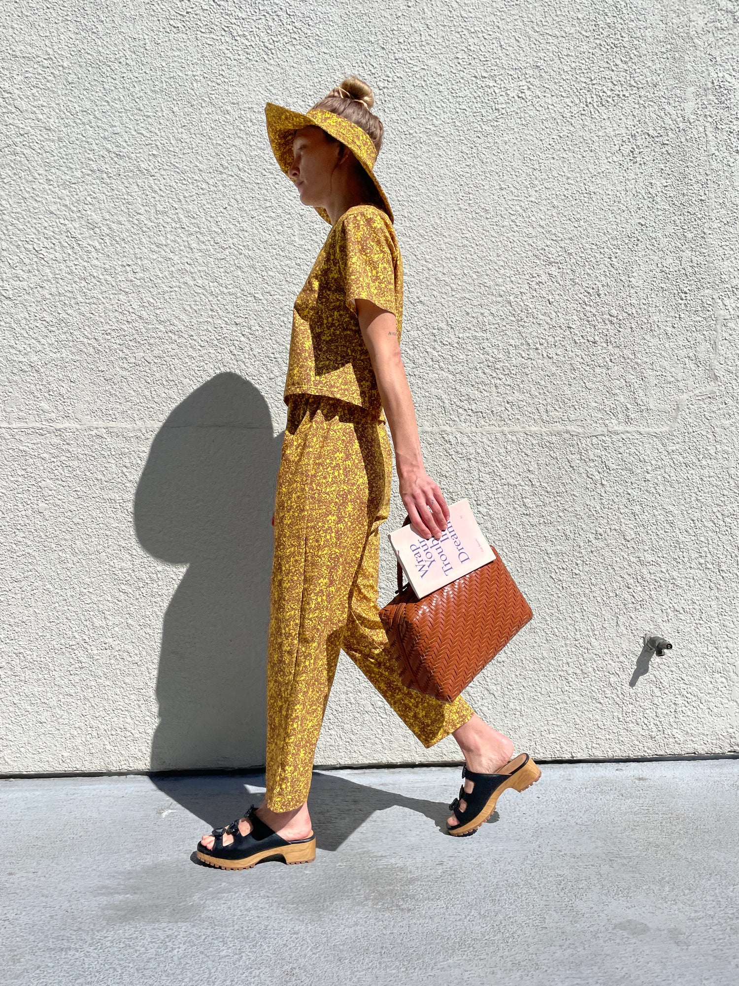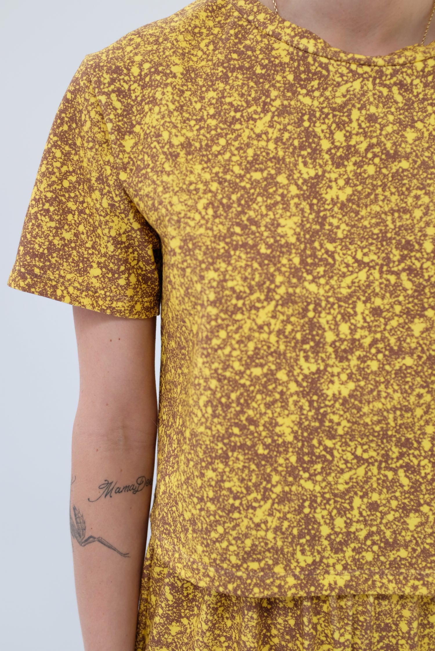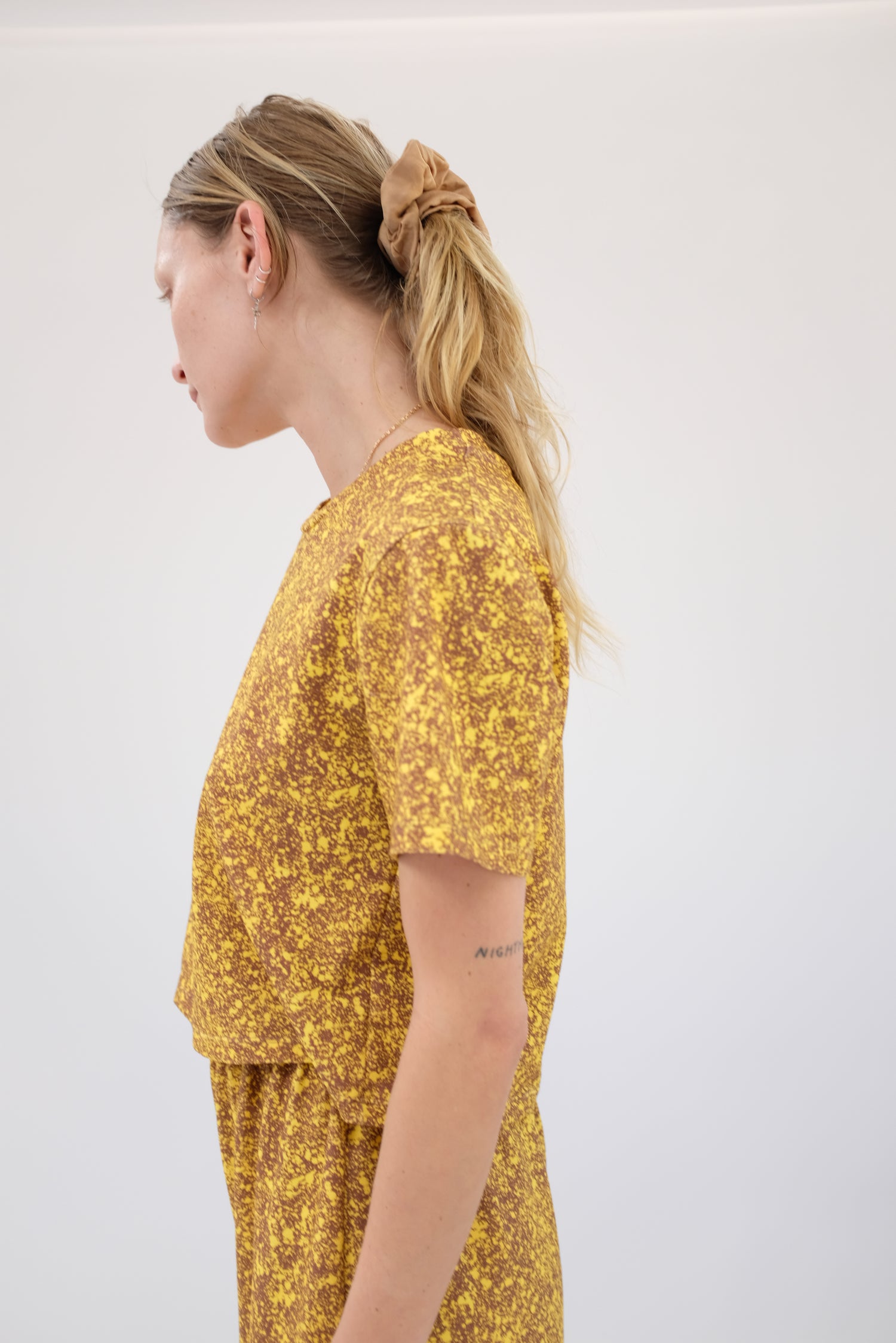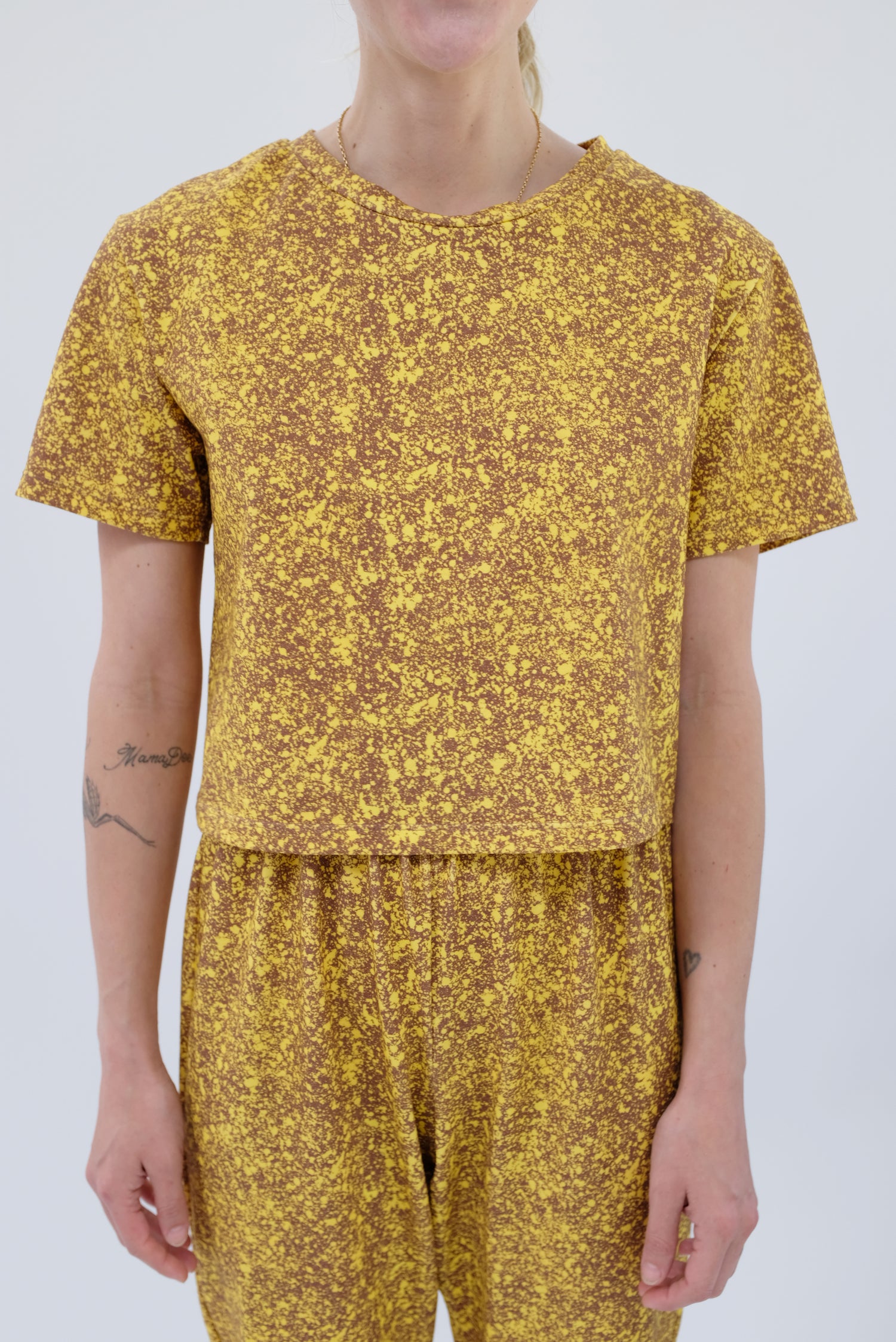 100% Organic cotton jersey. Soft with great stretch, short sleeves, slightly cropped. Runs true to size. Model is wearing size small/medium. Total length from shoulder to hem is 19".
