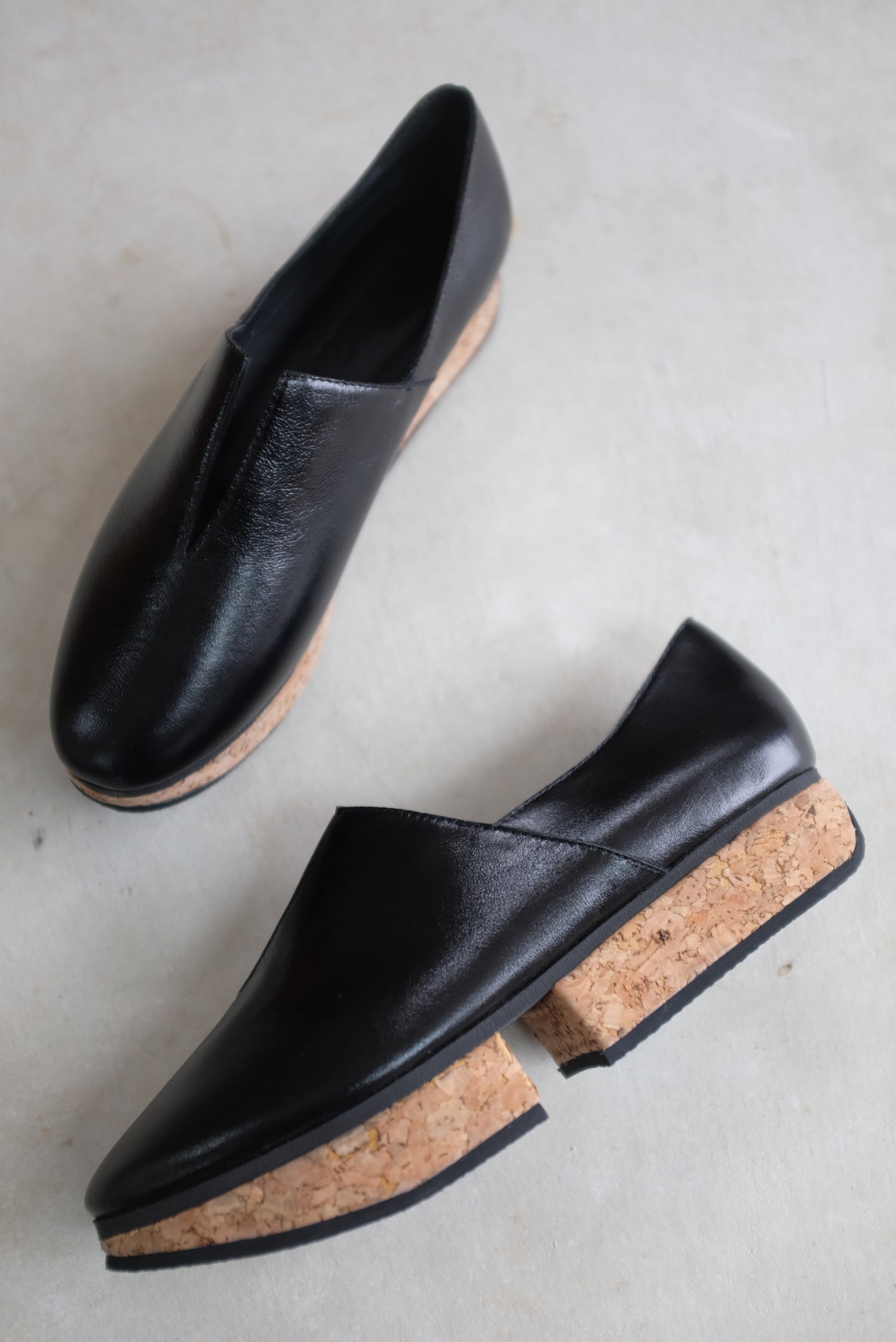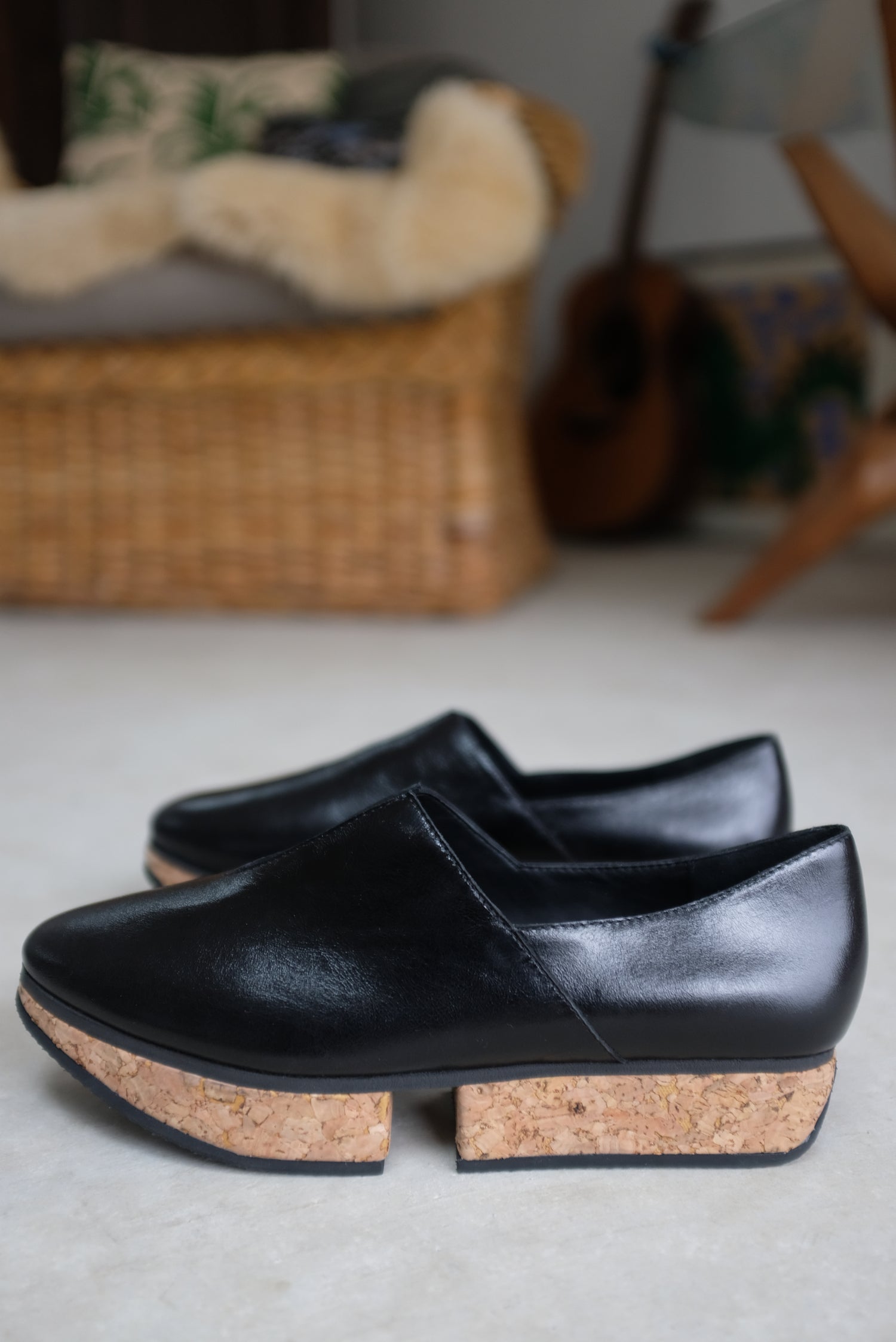 Leather slip on shoe, split cork 1 1/4" platform heel, all leather upper, v-detail, walking shoe. A best selling shoe in the shop. These are hard to keep in stock due to their cult following :)