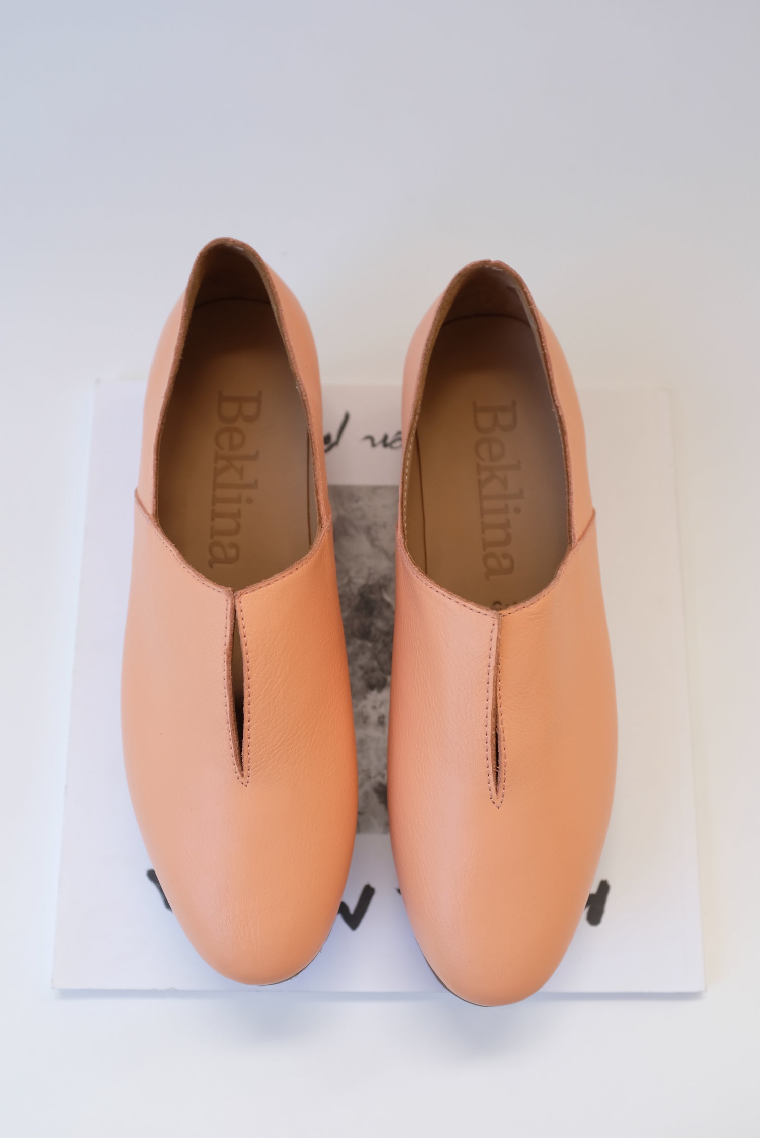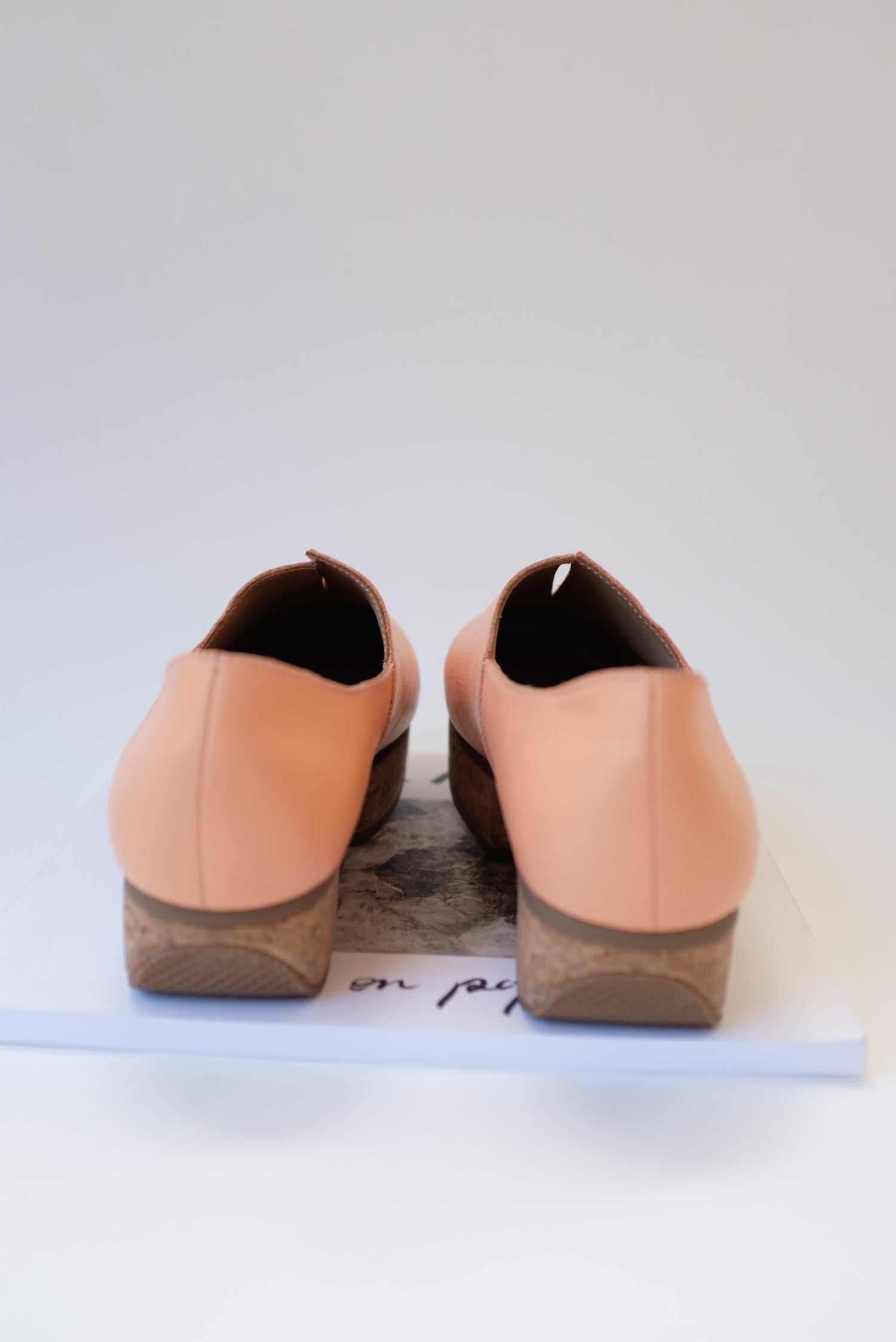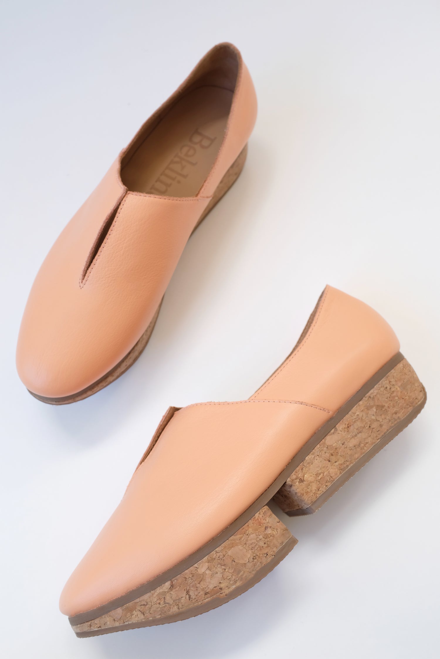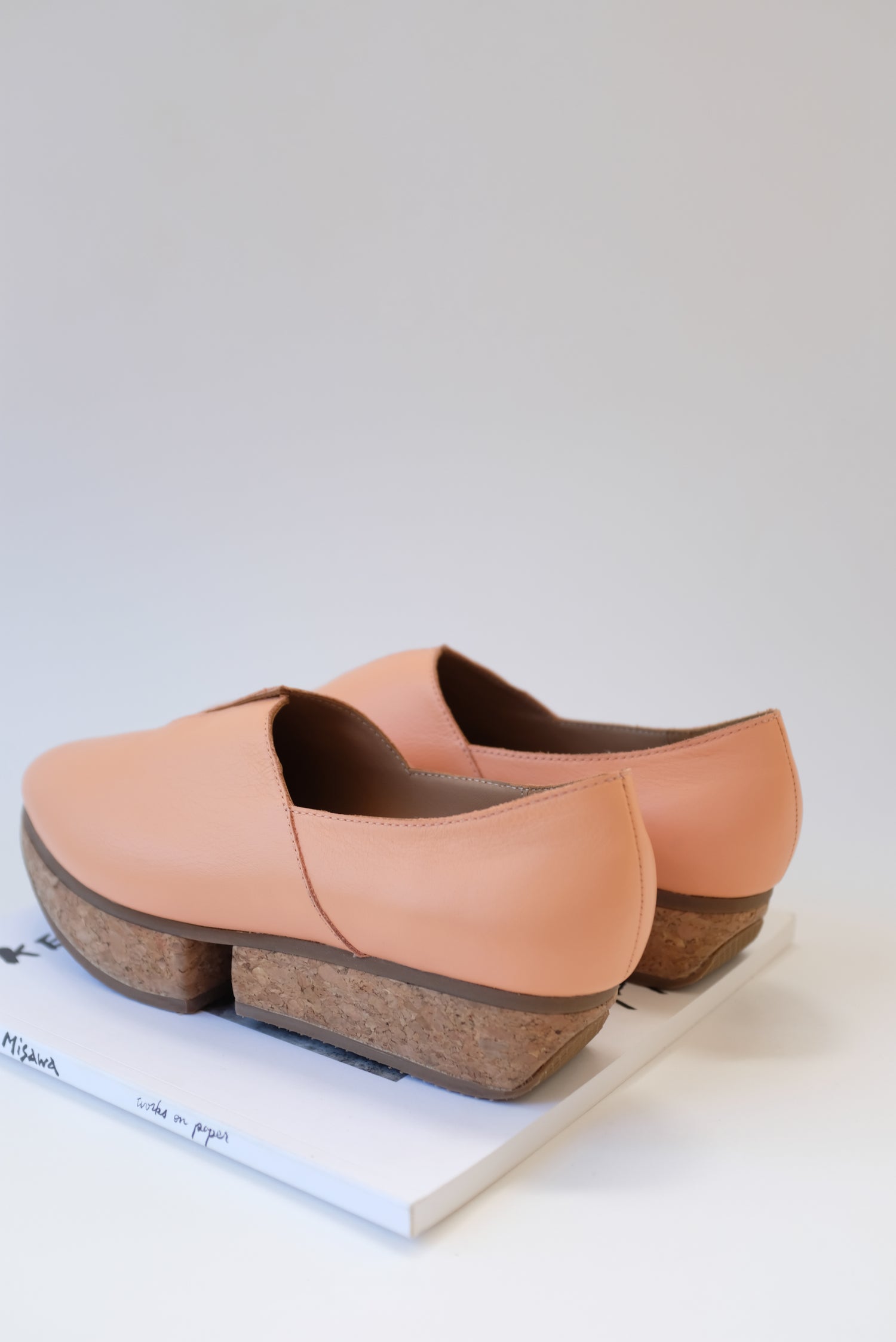 Leather slip on shoe, split cork 1 1/4" platform heel, all leather upper, v-detail, walking shoe. A best selling shoe in the shop. These are hard to keep in stock due to their cult following :)