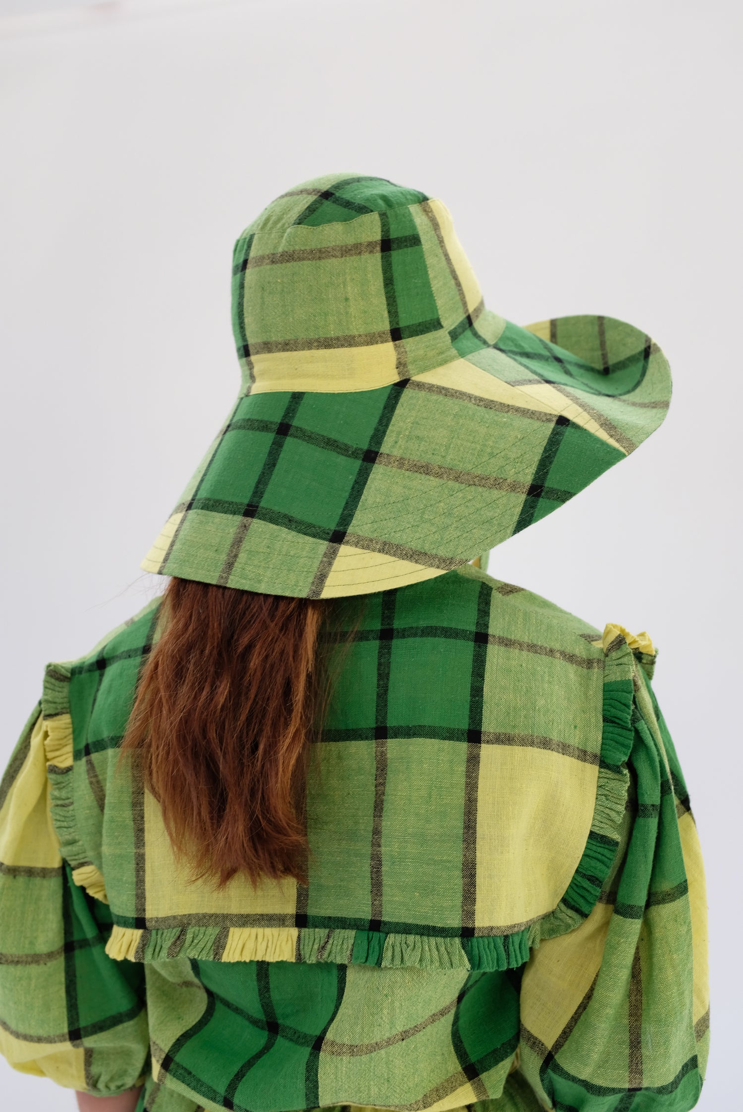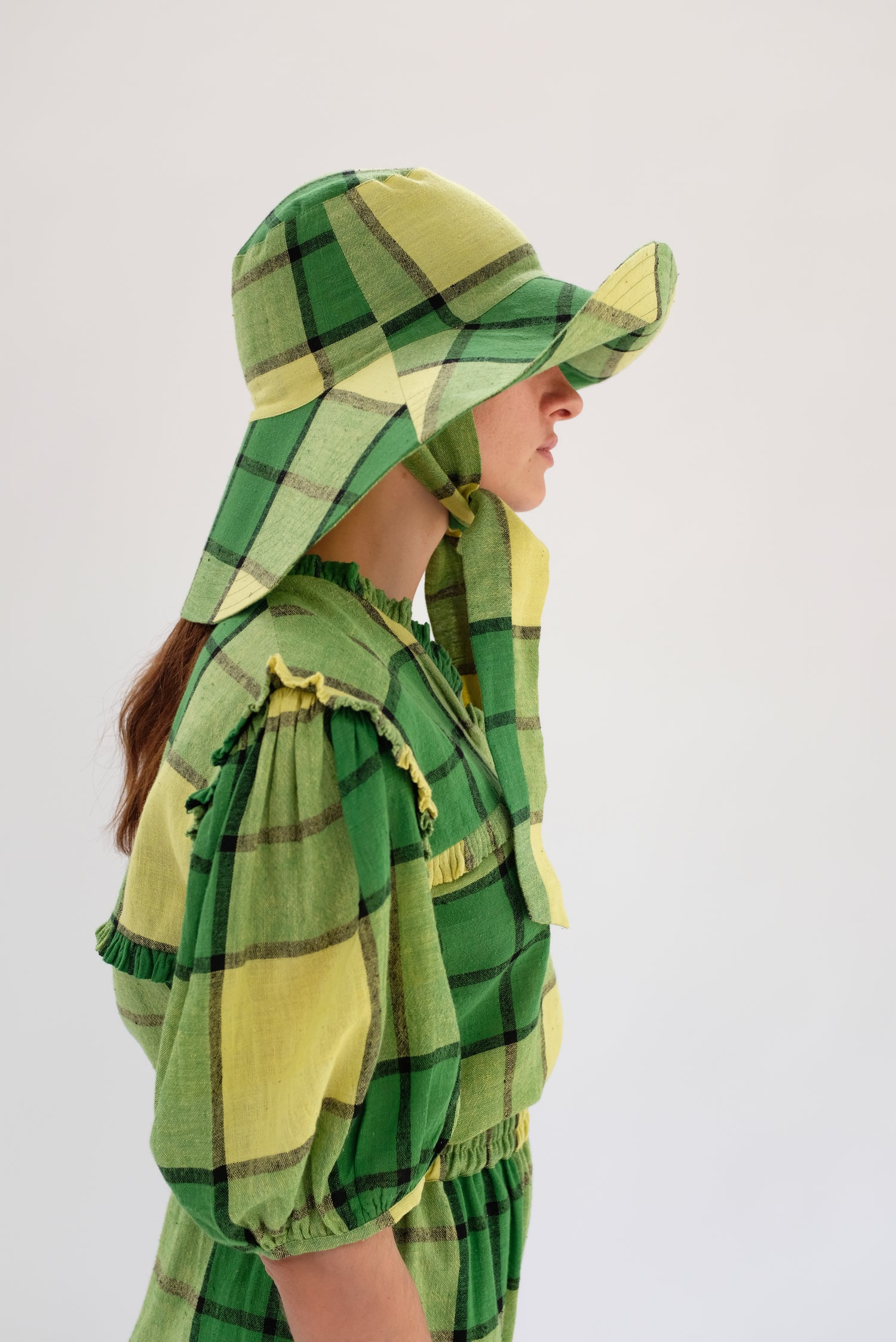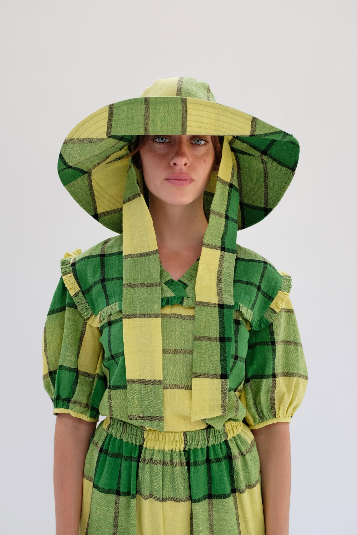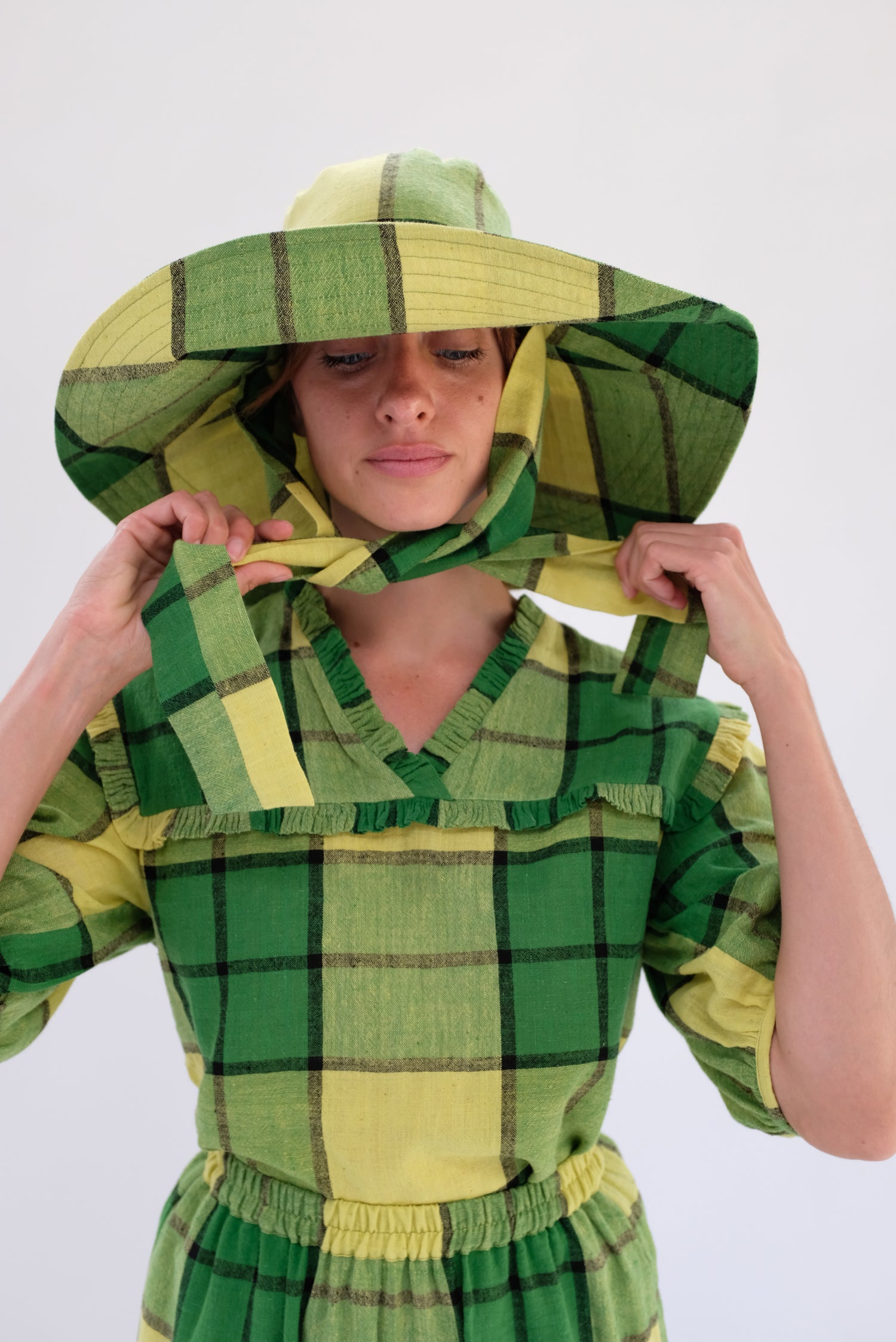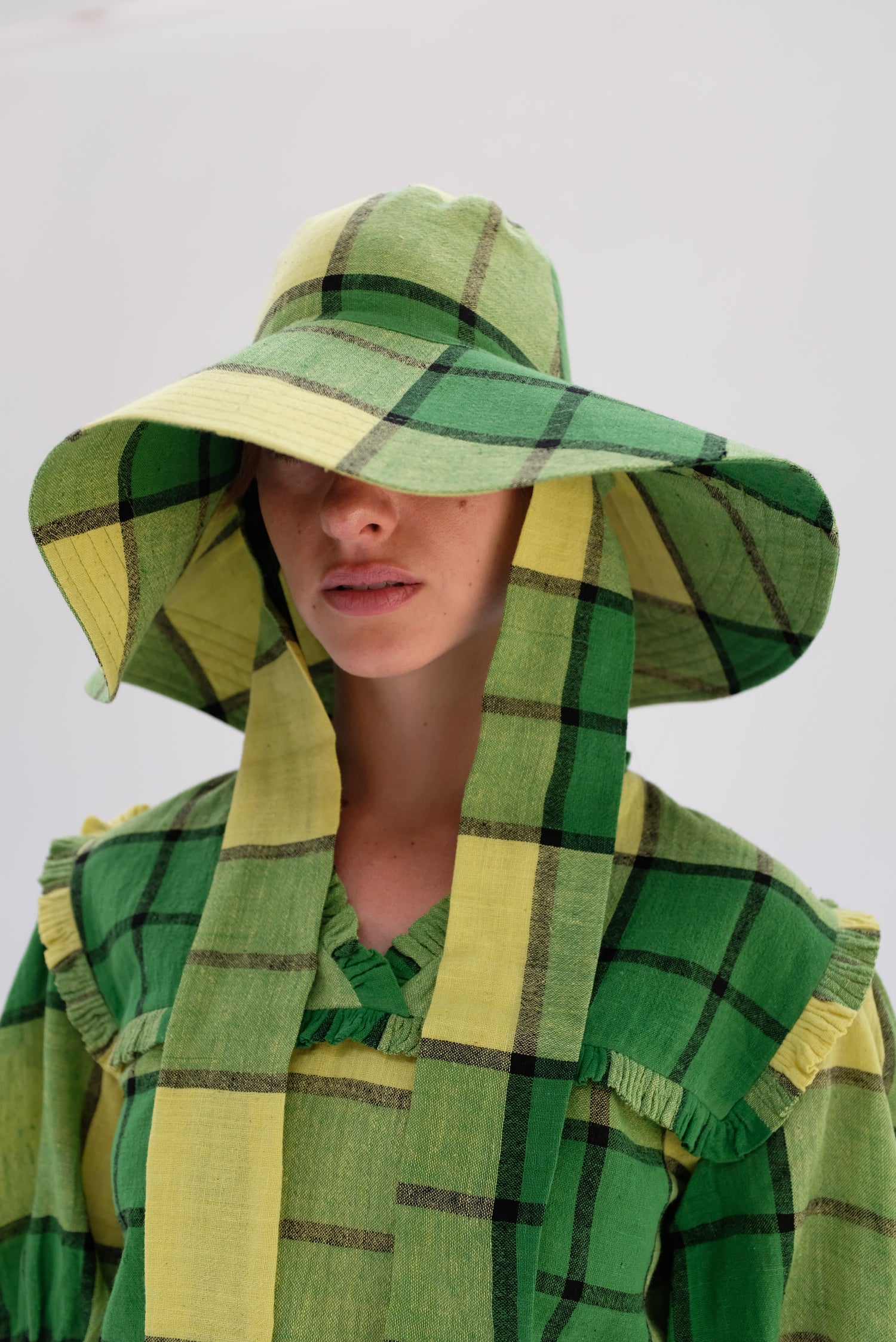 100% Cotton hand loomed plaid on non-electric looms, enclosed seams. Great shade for face, one size fits most, self tie sash for windy weather, wear tied or untied. A slightly smaller brim than our best selling Voluminoso Tie Hat. Throw in your suitcase, or trunk, takes up no room. Travels well and washable. Great sun protection.
