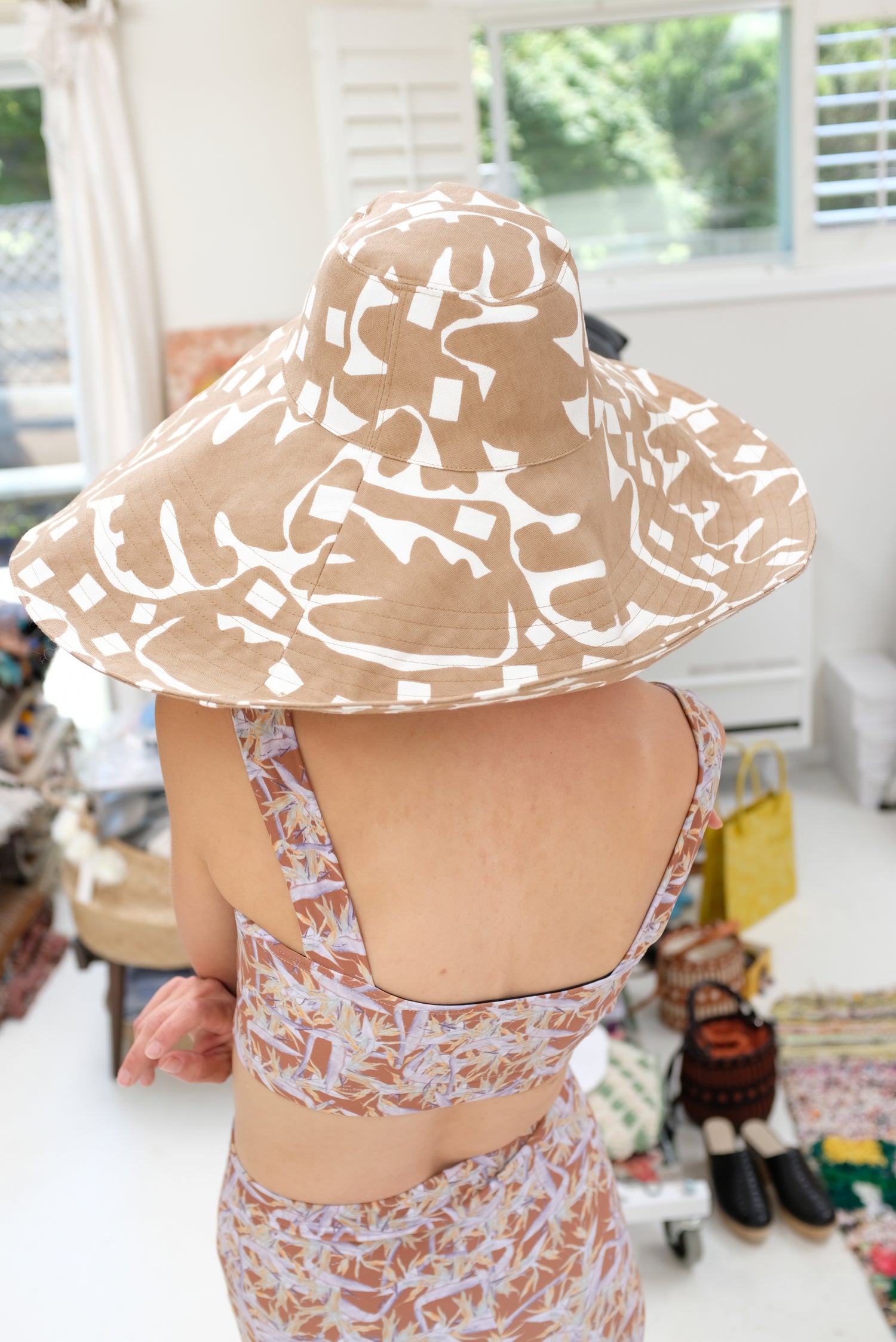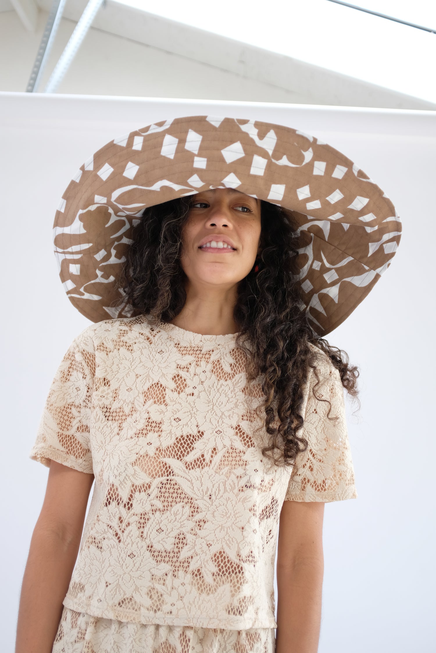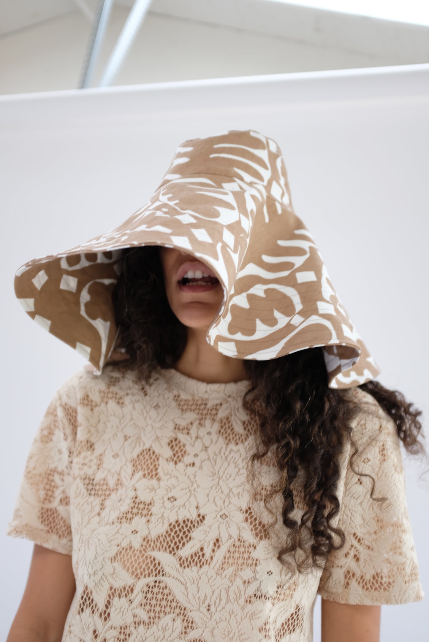 100% Organic cotton canvas, archived hand printed Mexican Divorce print, massive oversized floppy sunhat, full shade for face and shoulders, one size fits most. Travels and washable. Ultra sun protection.