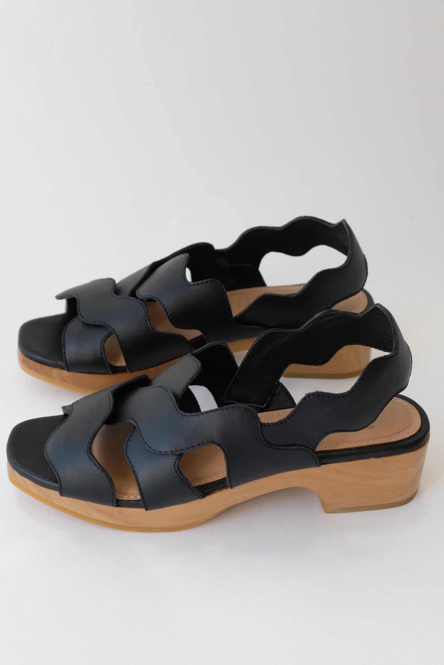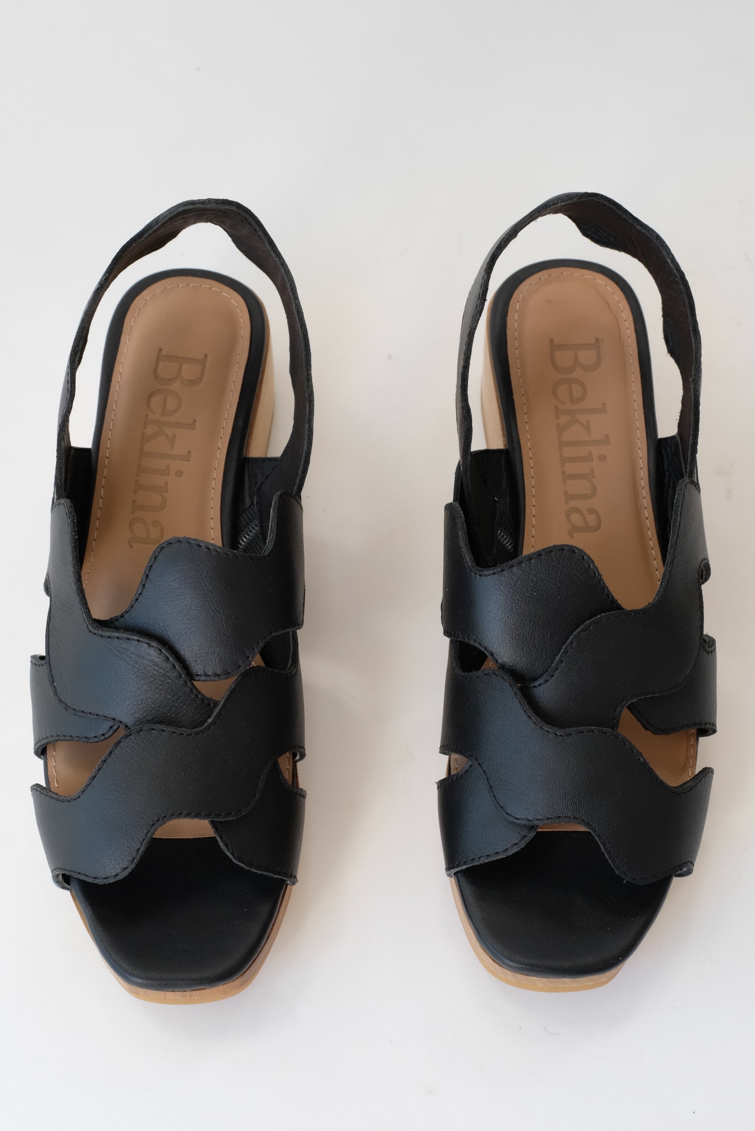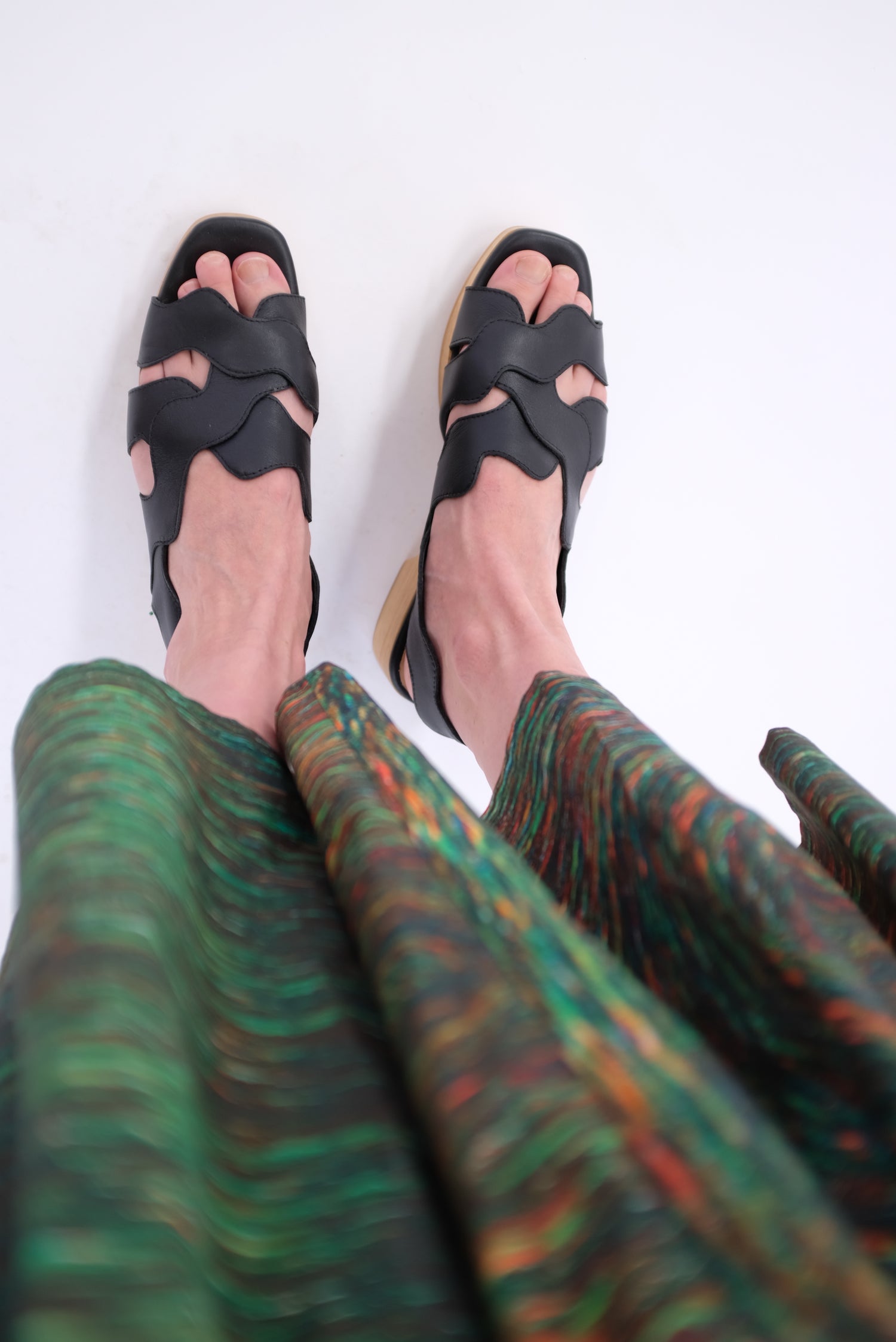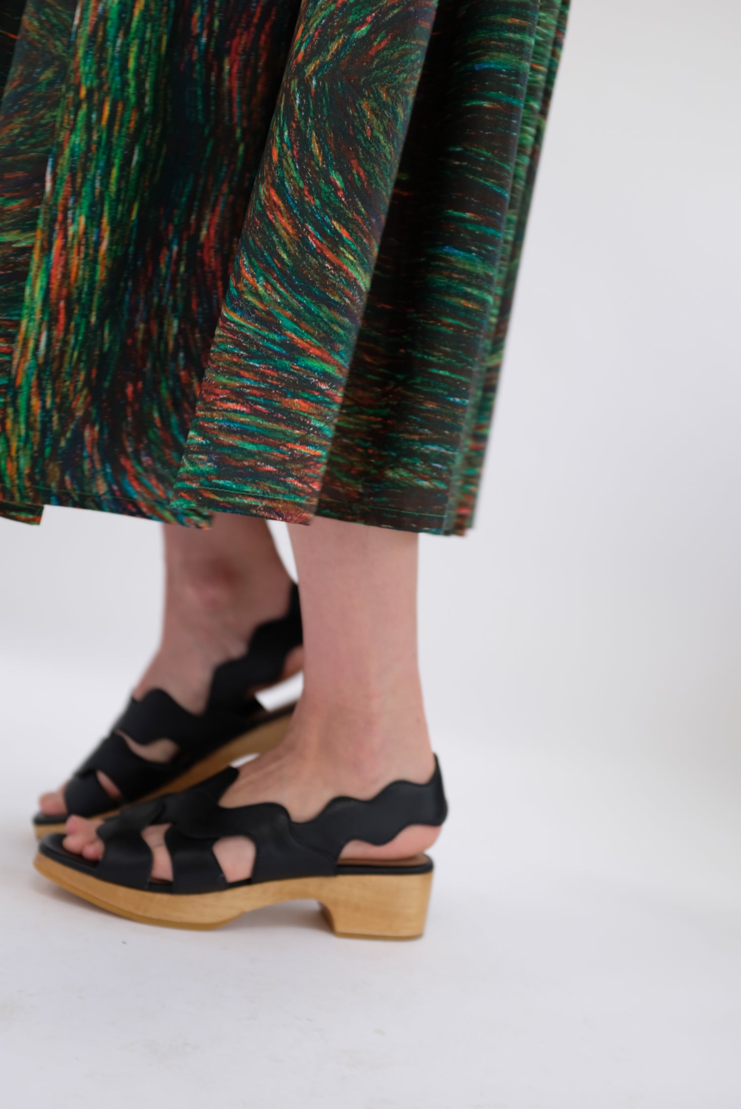 Sling back low clog sandal, iconic hand cut and layered wiggle leather collage, art for your feet. Soft glove leather upper, hand carved wooden platform heel.