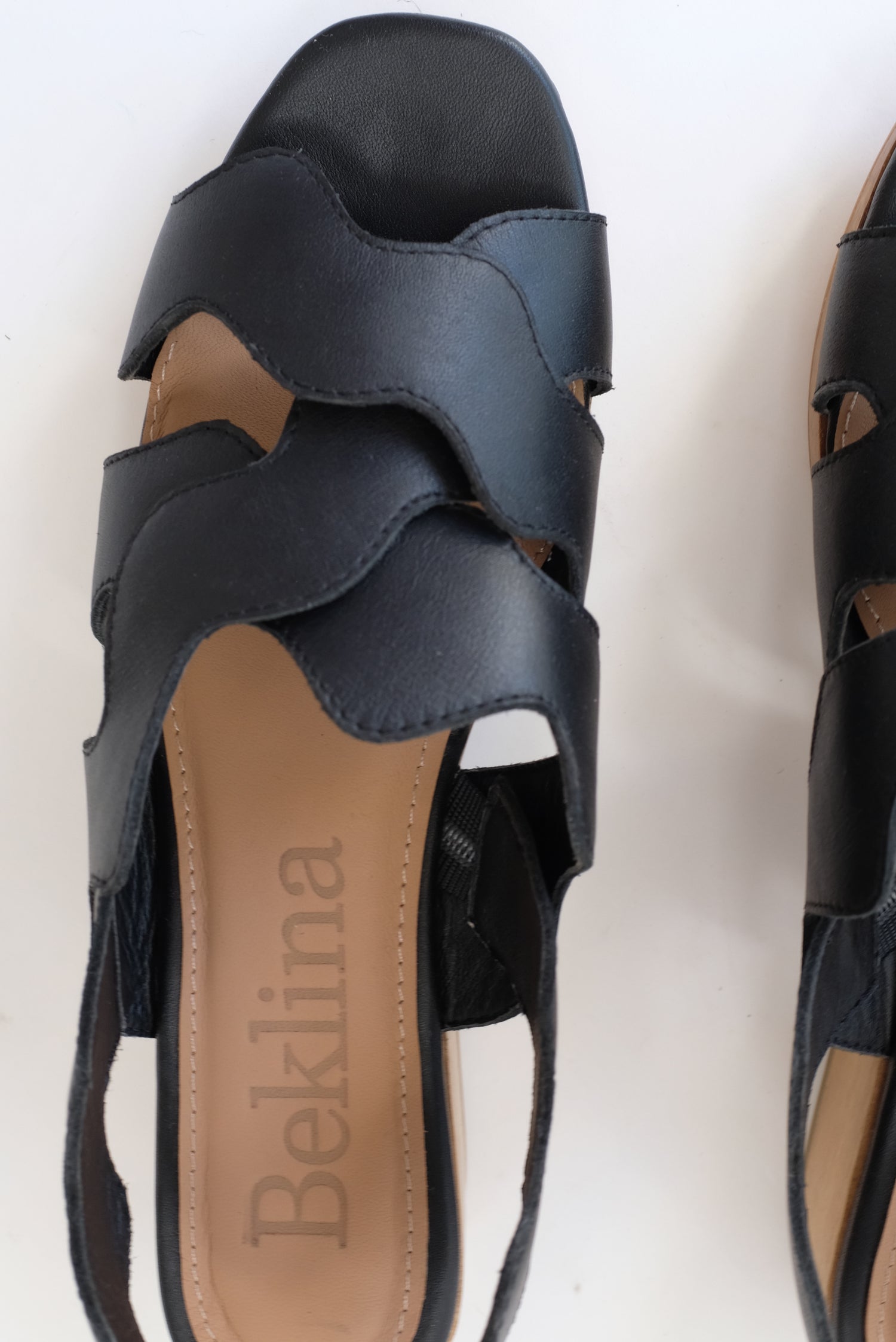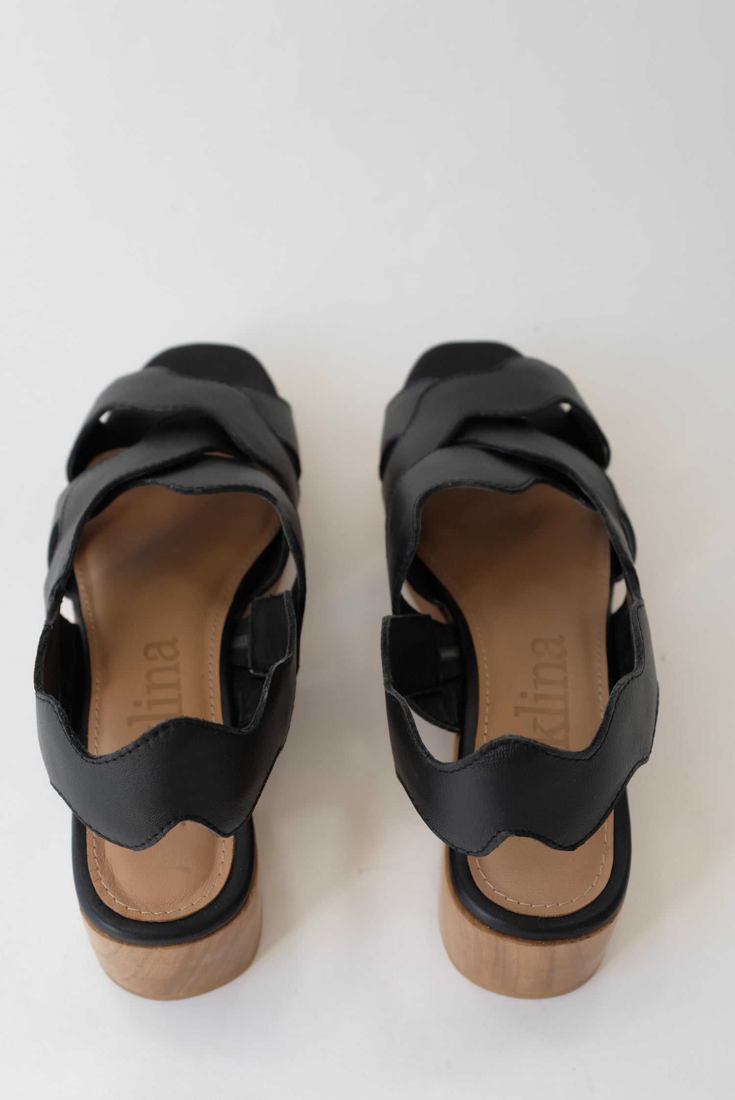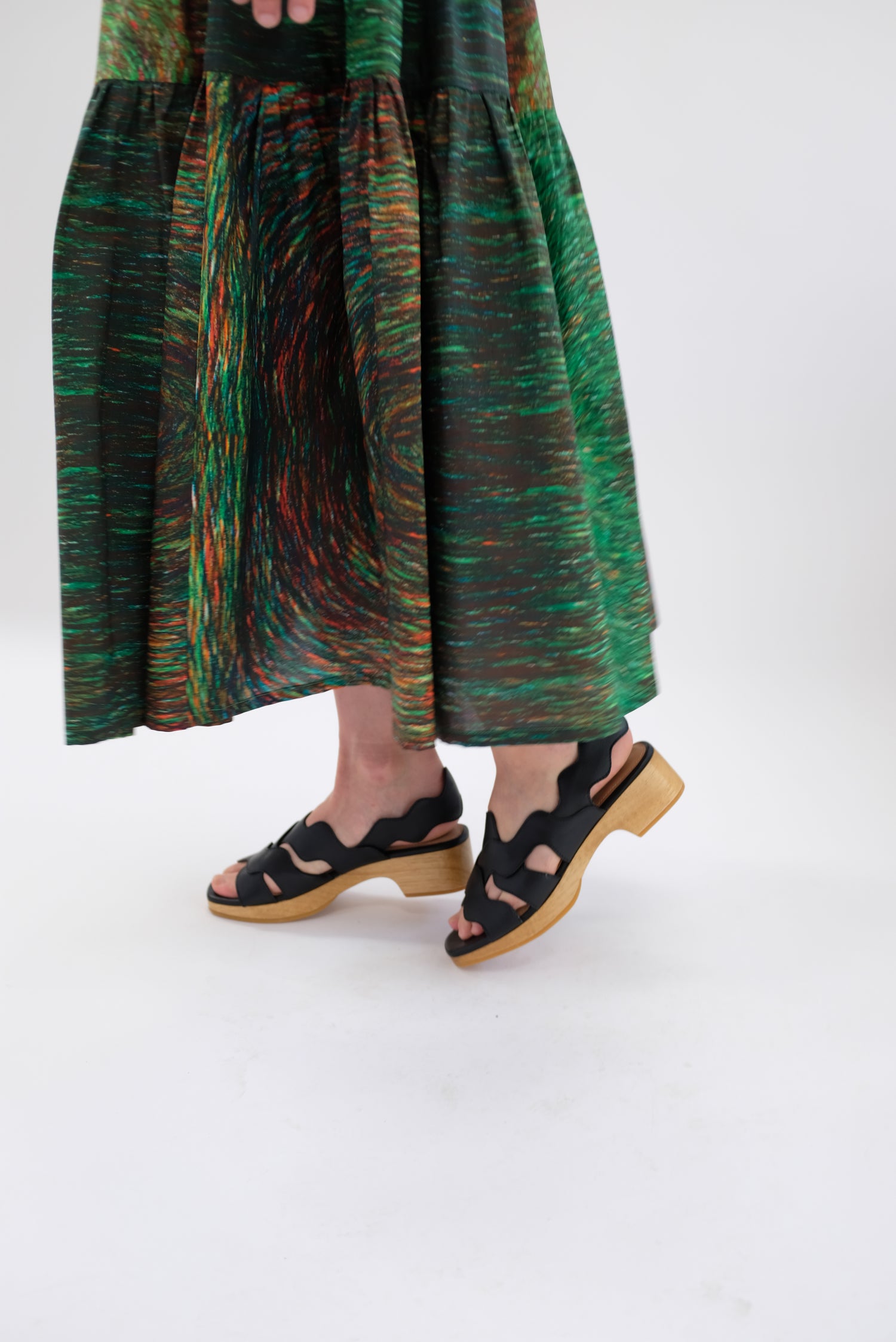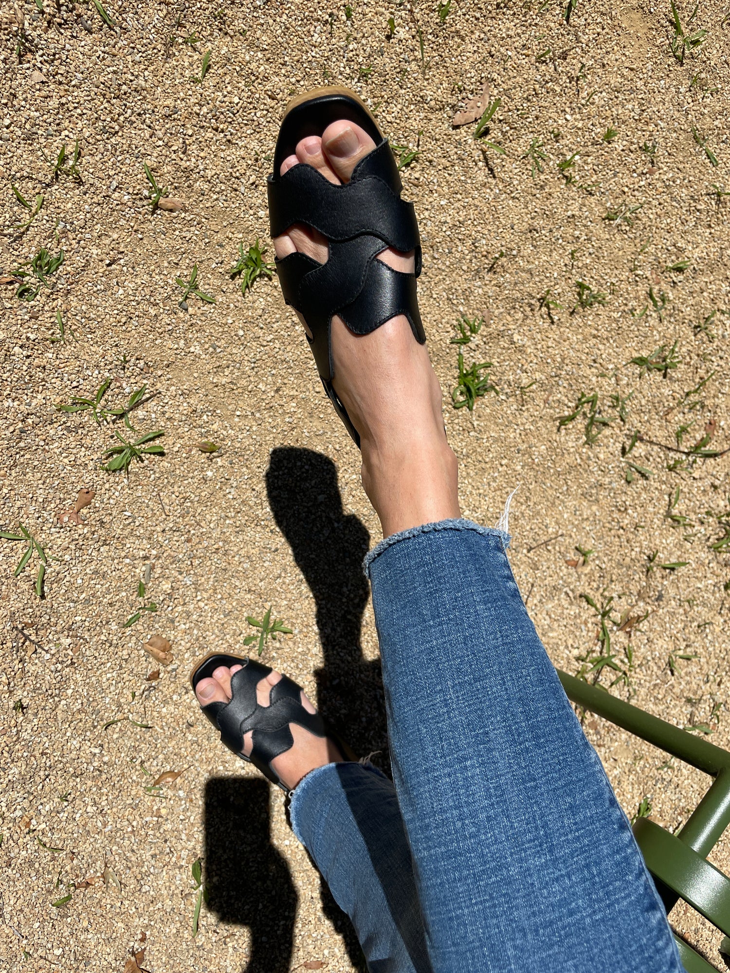 Sling back low clog sandal, iconic hand cut and layered wiggle leather collage, art for your feet. Soft glove leather upper, hand carved wooden platform heel.