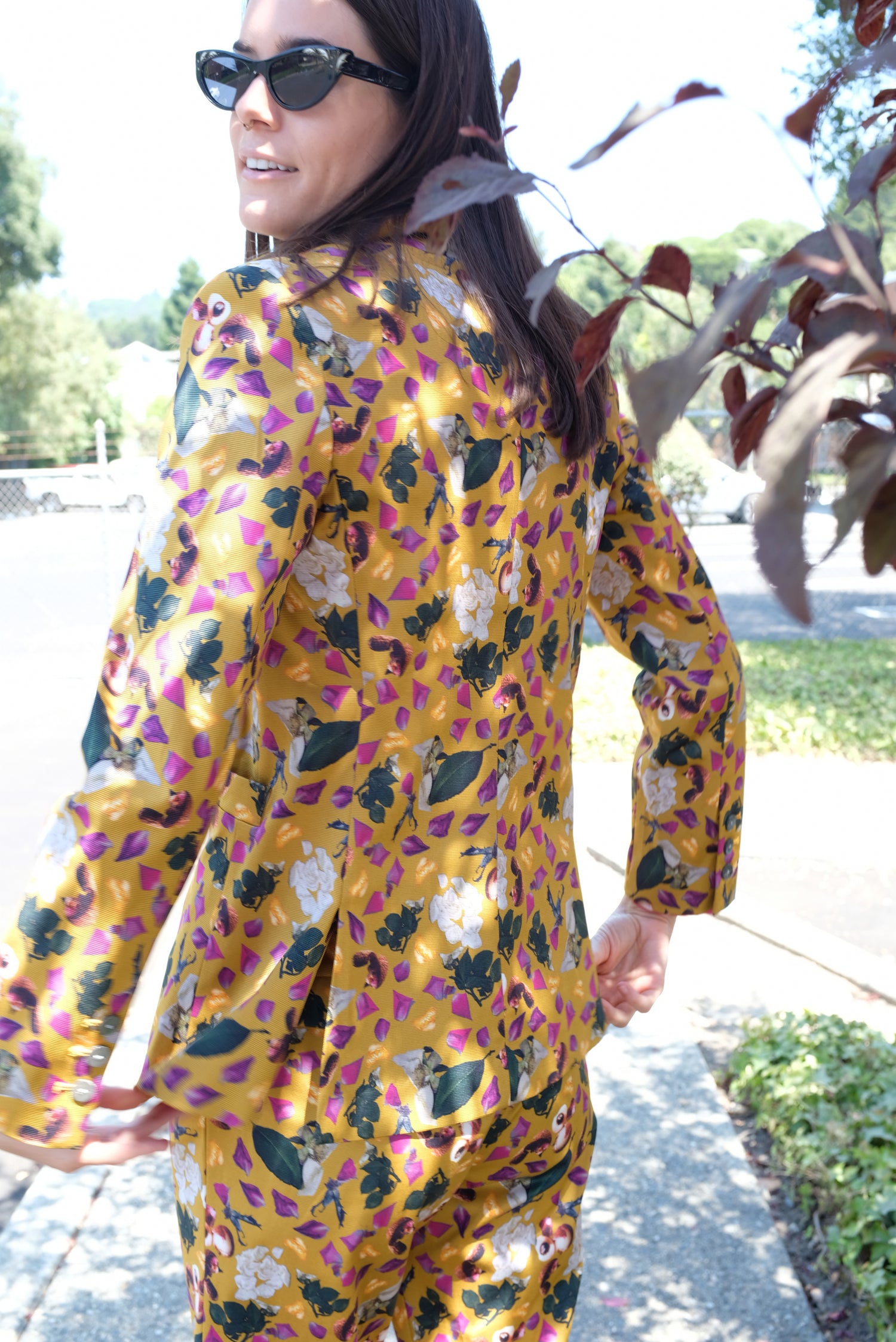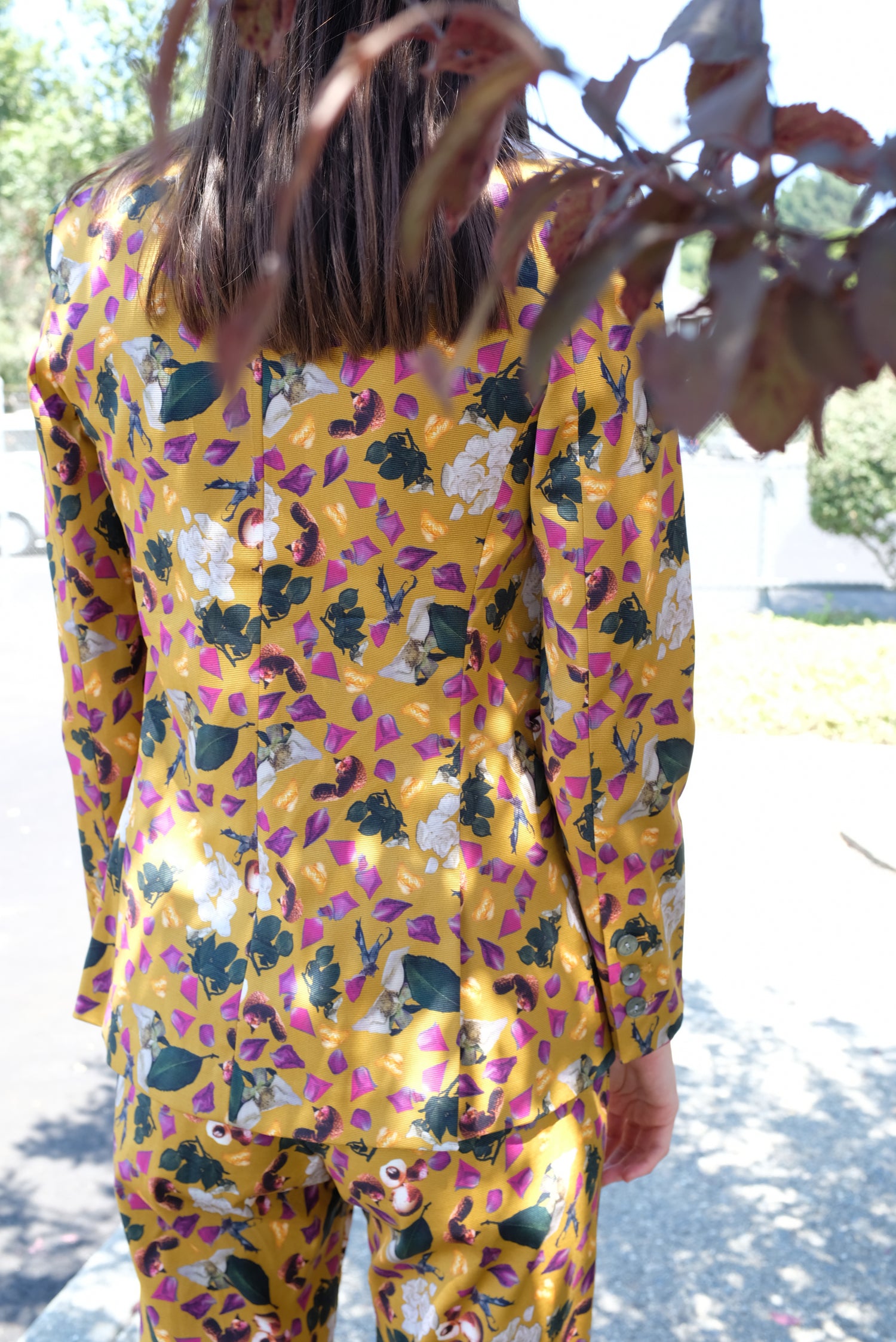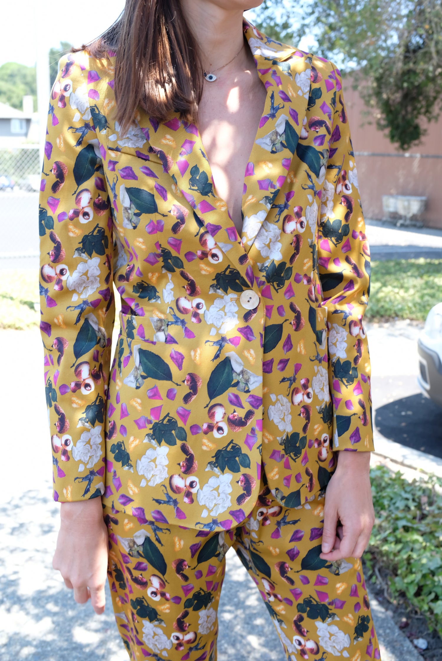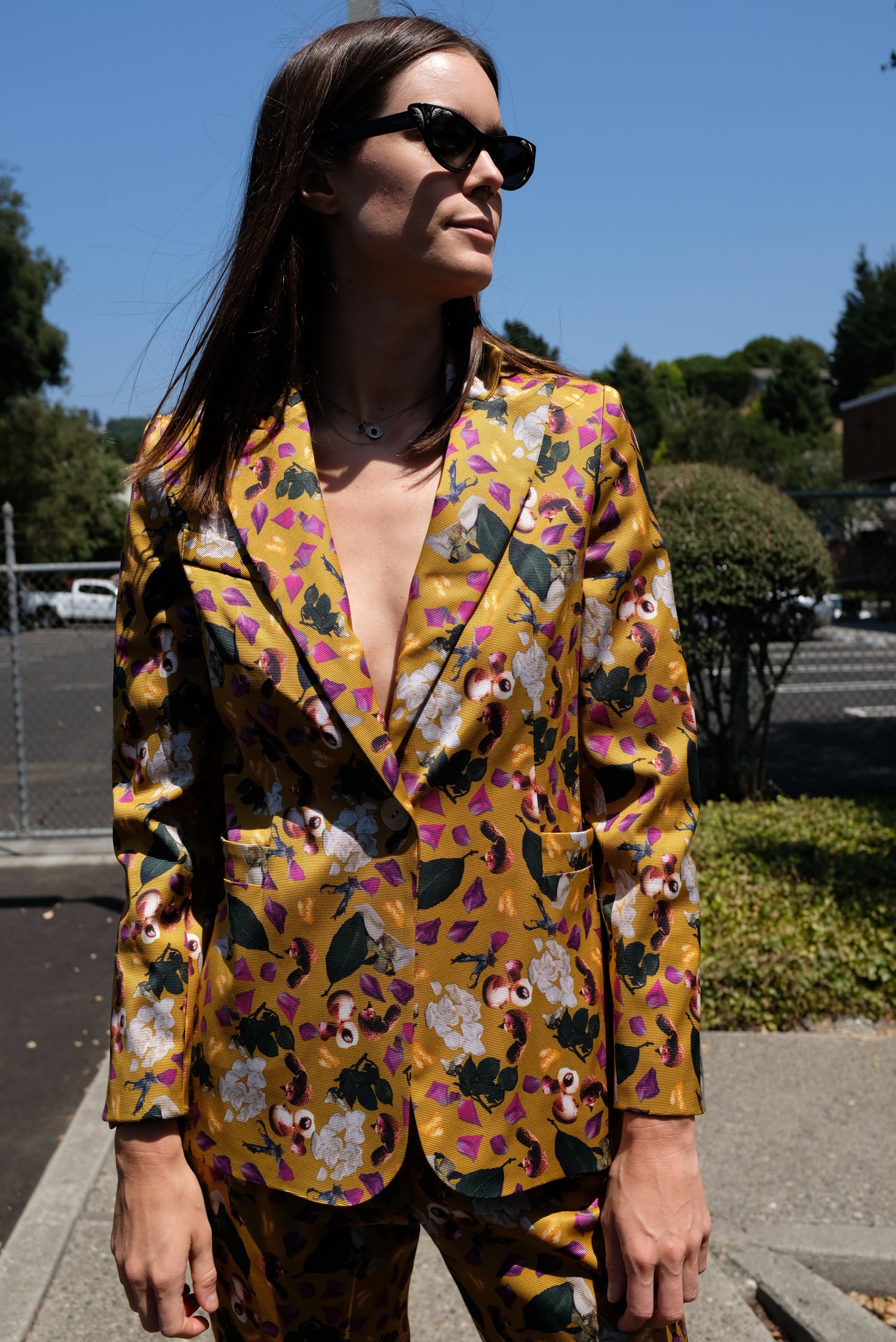Classic peak lapel jacket, punchy Ottoman print embedded with roses and lychees. Features two front pockets, two pleated slits in back. Total length from shoulder to hem of size 4 is 25". 62% Rayon, 35% Cotton, 3% Spandex. Fits true to size.