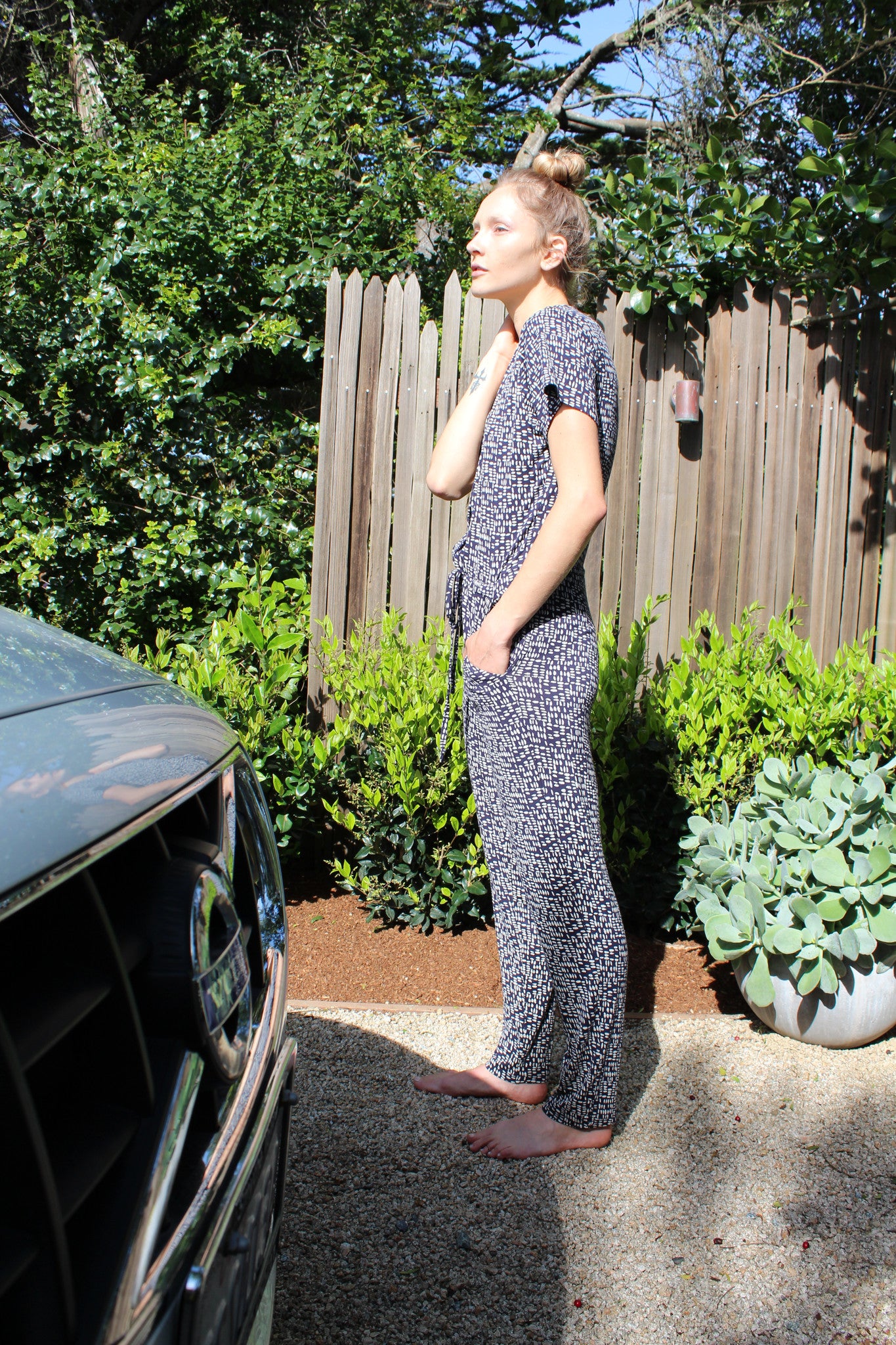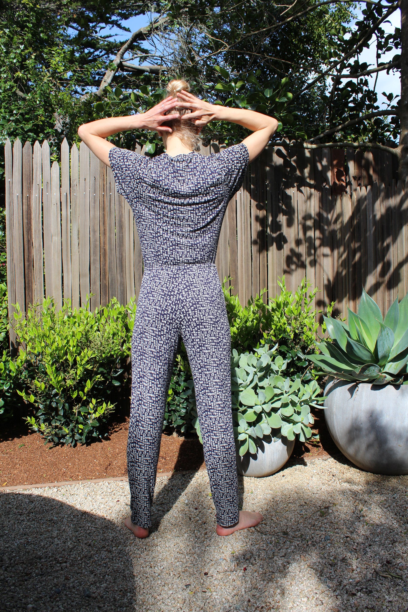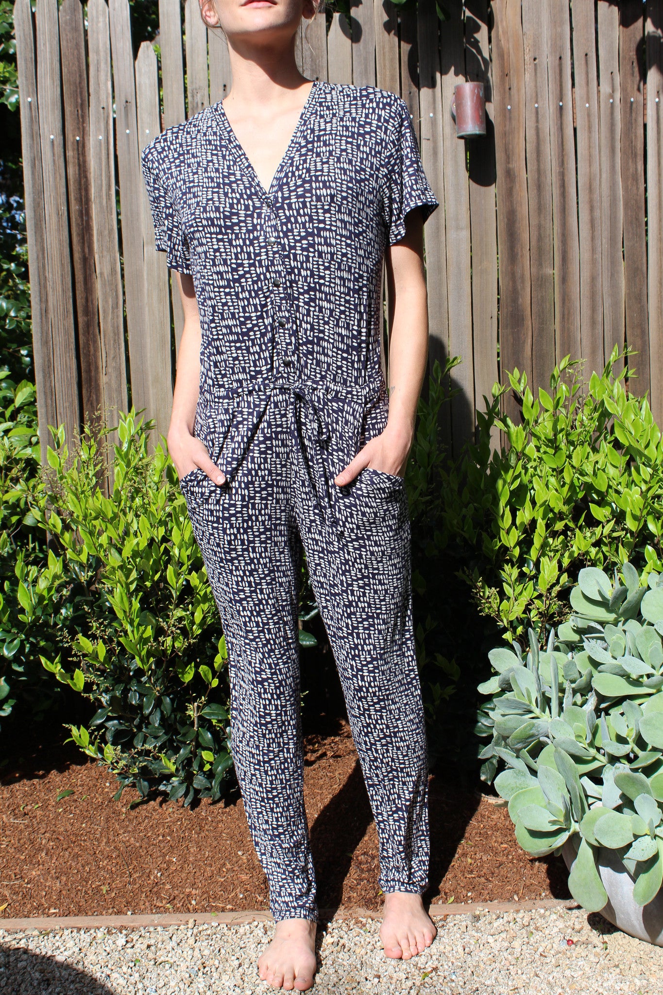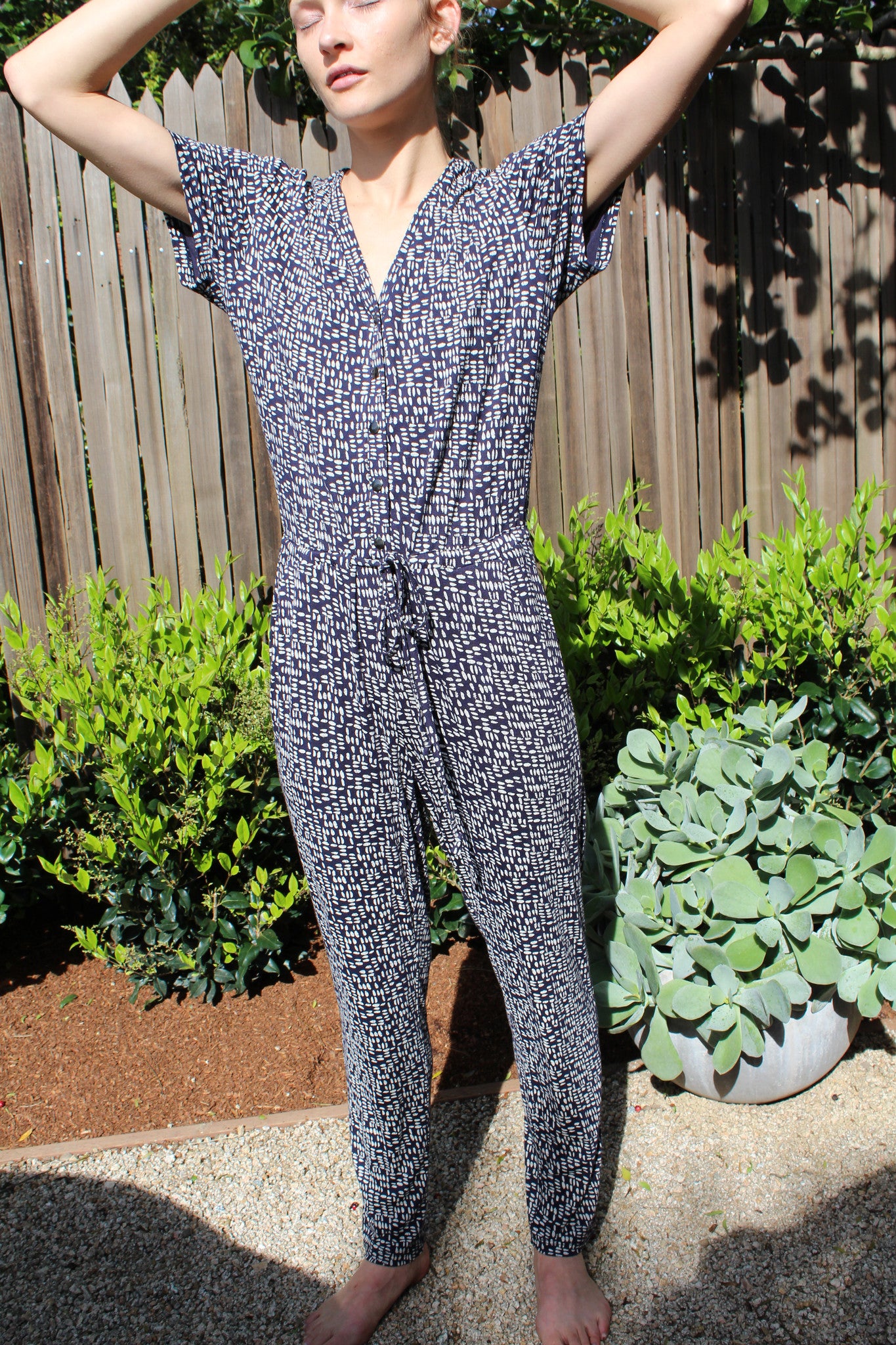 Jersey jumpsuit, that drapes, stretches and feels really good. Short sleeved top, 4 button closure, adjustable tie waist. Loose easy fitting.