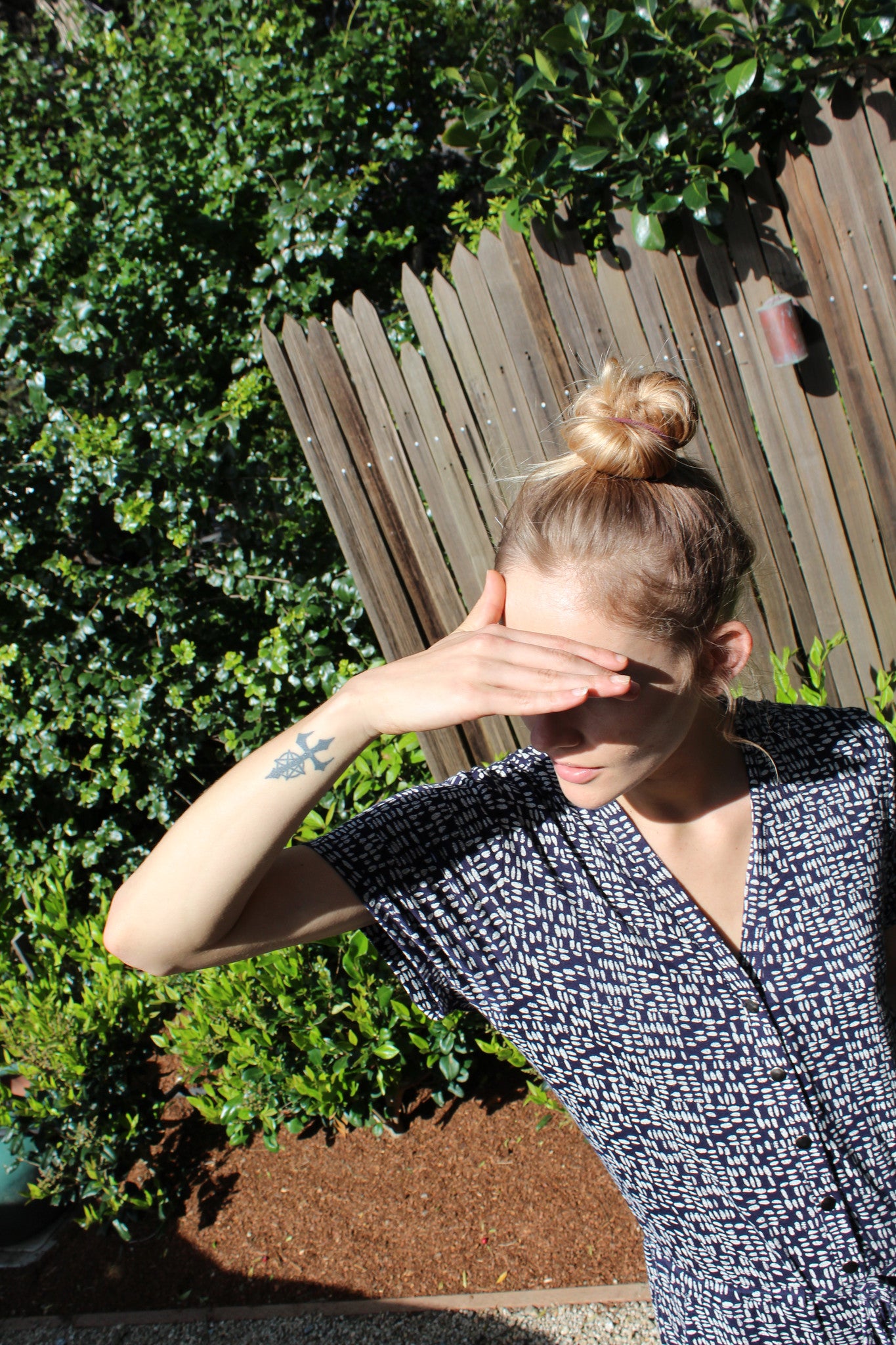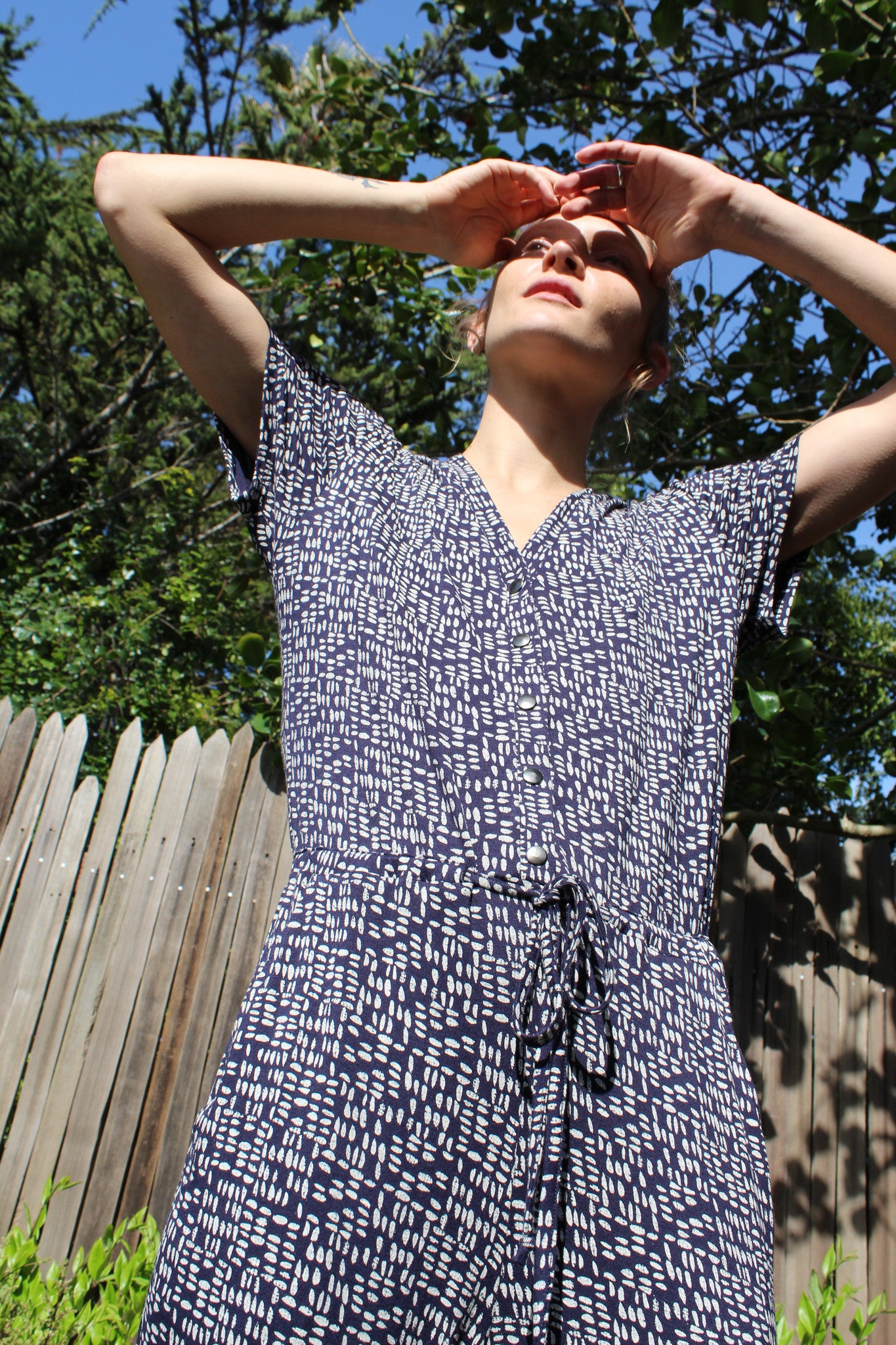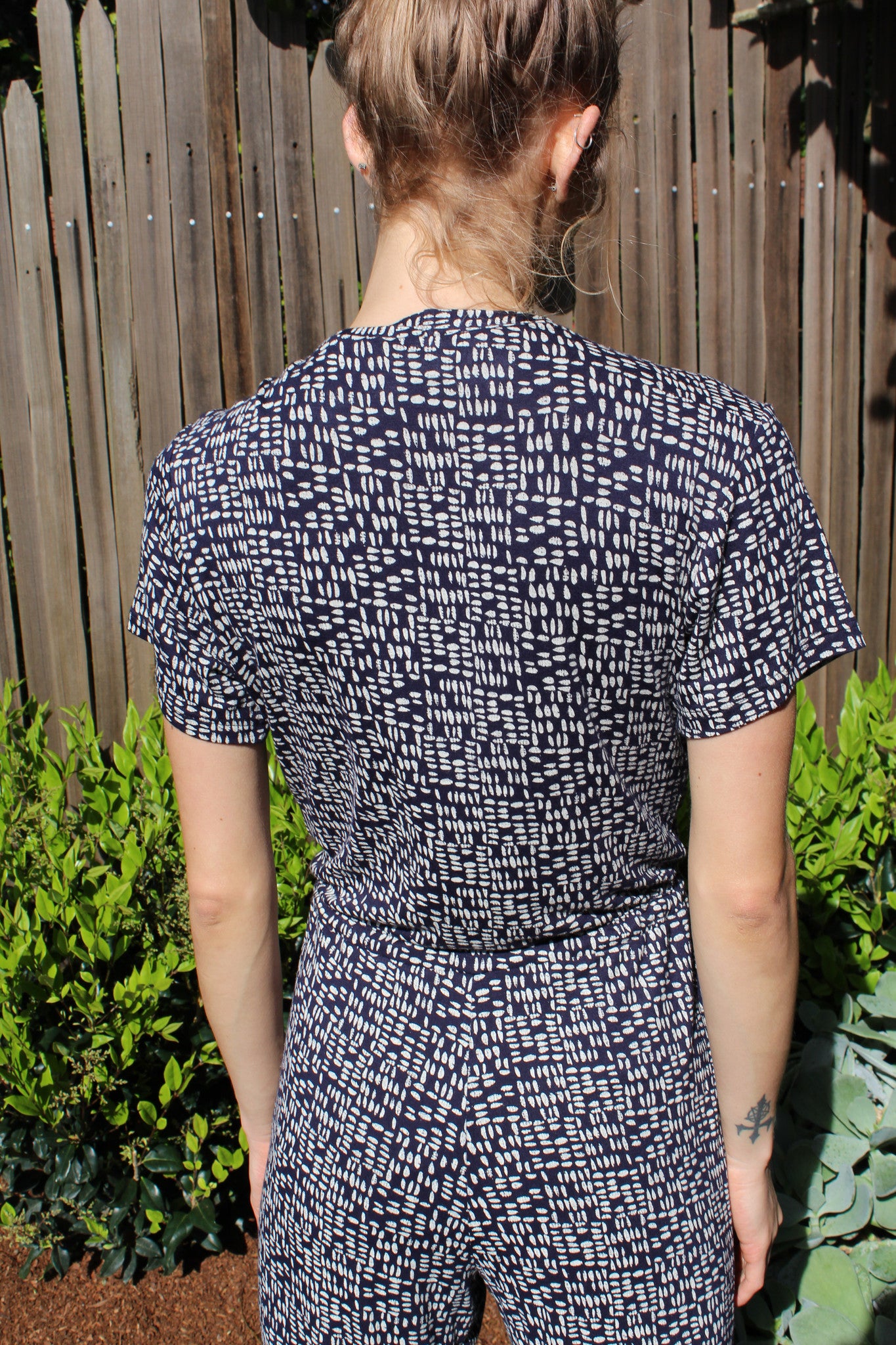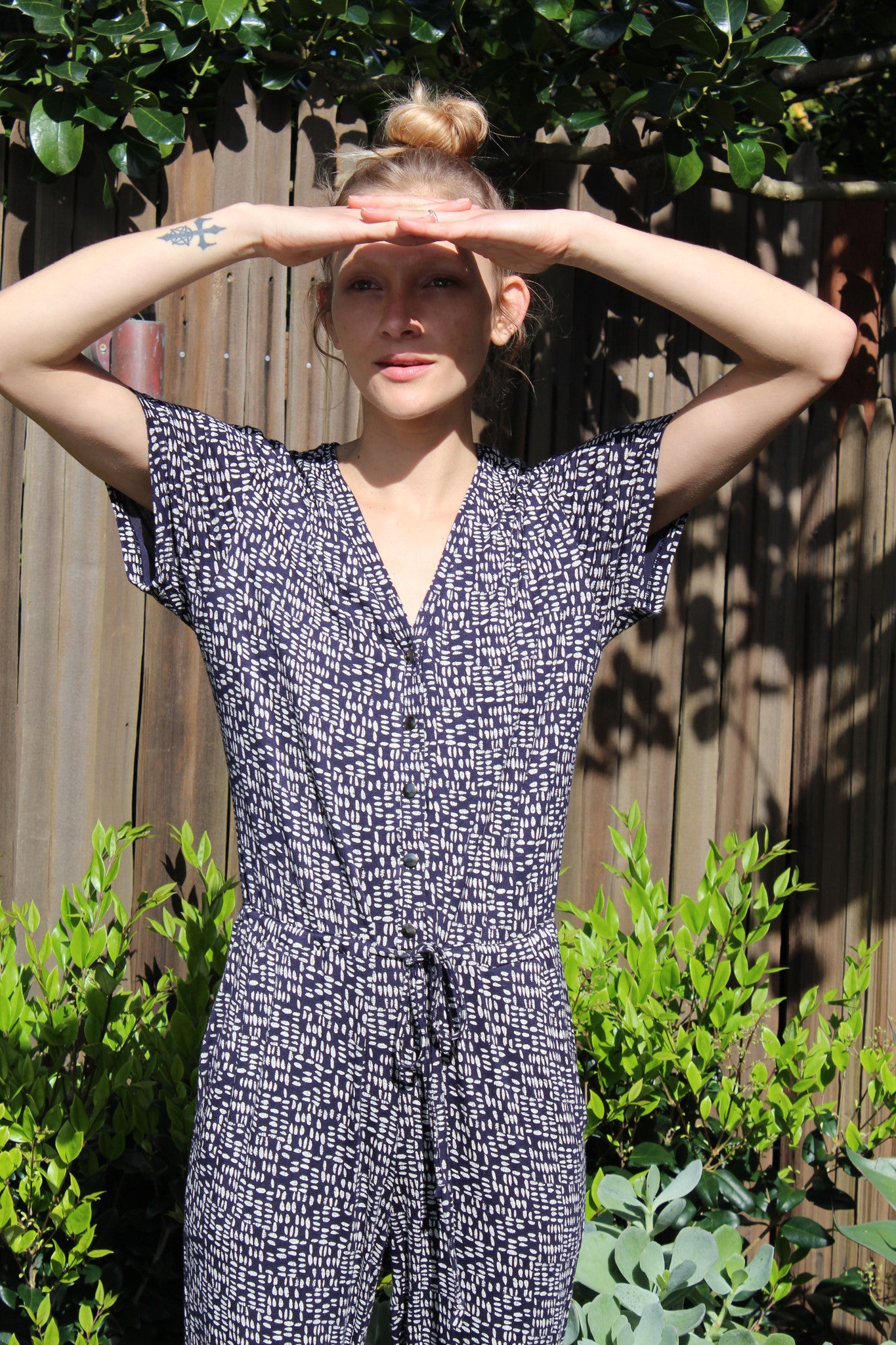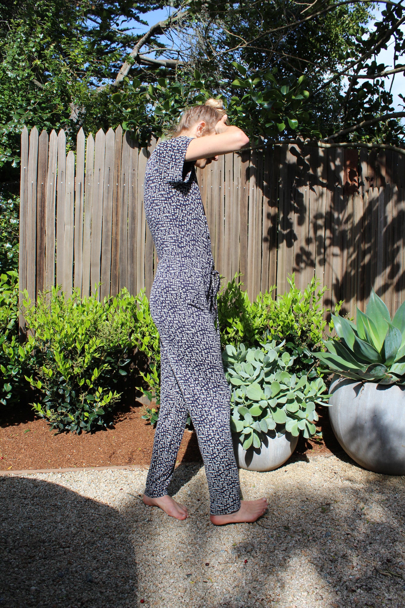 Jersey jumpsuit, that drapes, stretches and feels really good. Short sleeved top, 4 button closure, adjustable tie waist. Loose easy fitting.