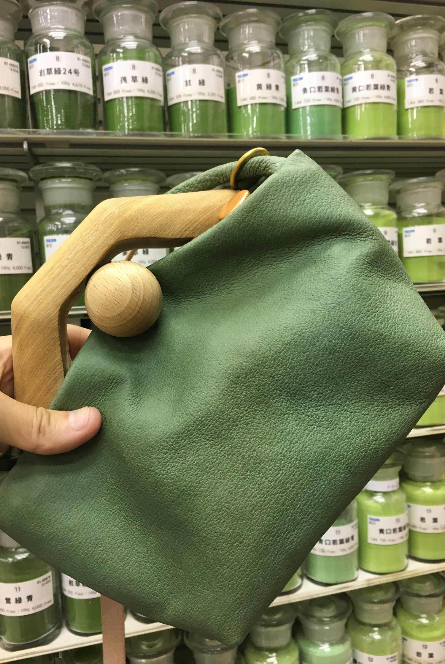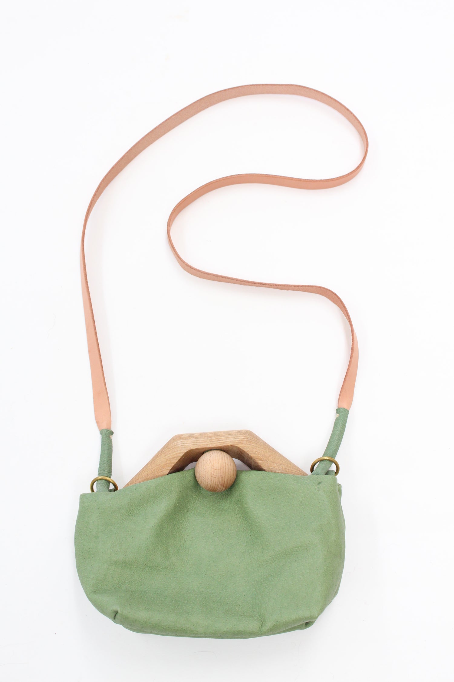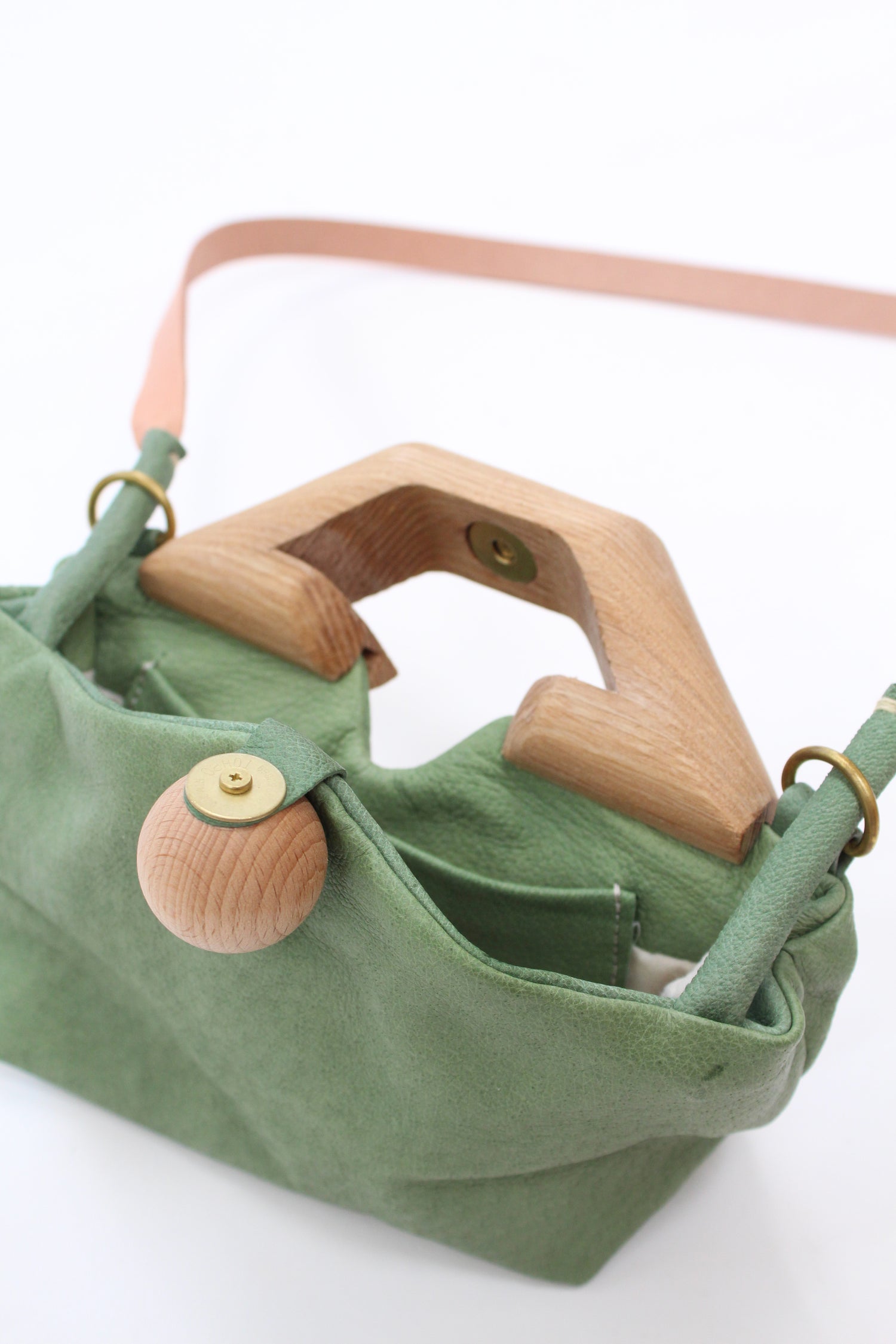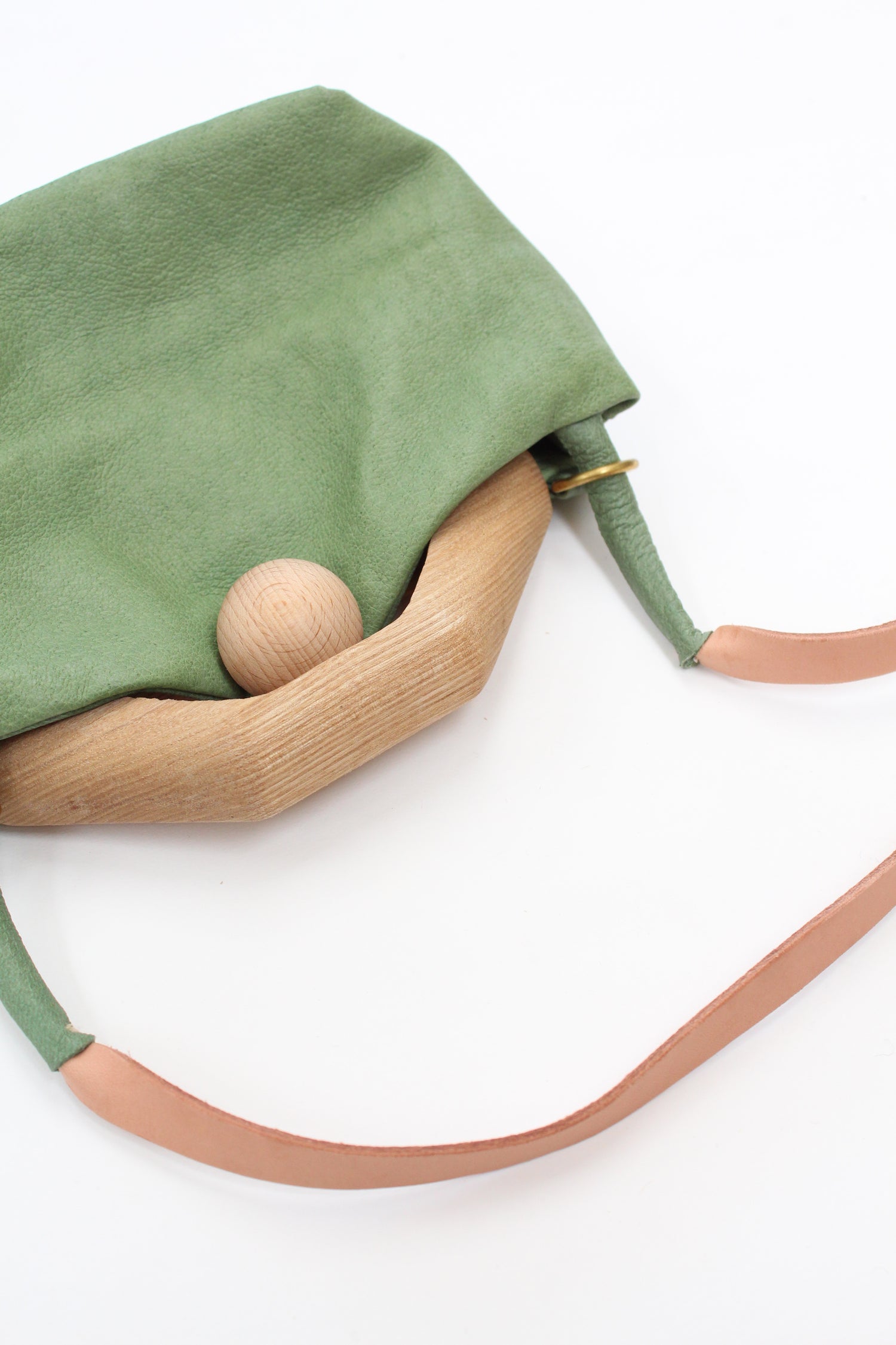 Limited edition, exclusive to Beklina, matcha green leather and natural wood. Buttery leather purse with sculpted wooden handle and ball detail. Leather shoulder strap, magnetic snap closure, inner pocket, cotton inner lining. Dust bag included. Handcrafted in Atami, Japan.