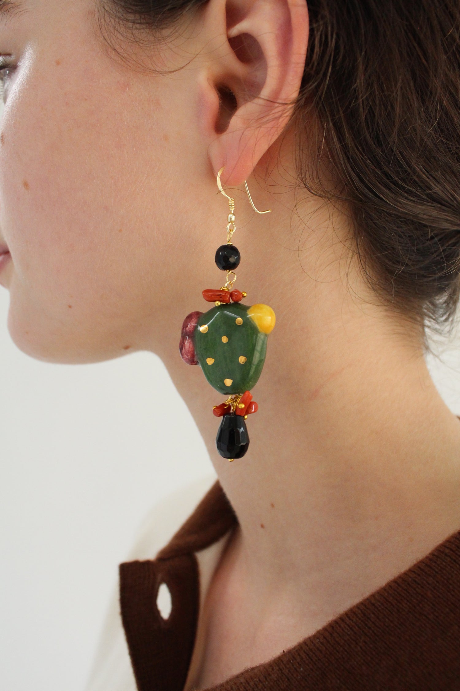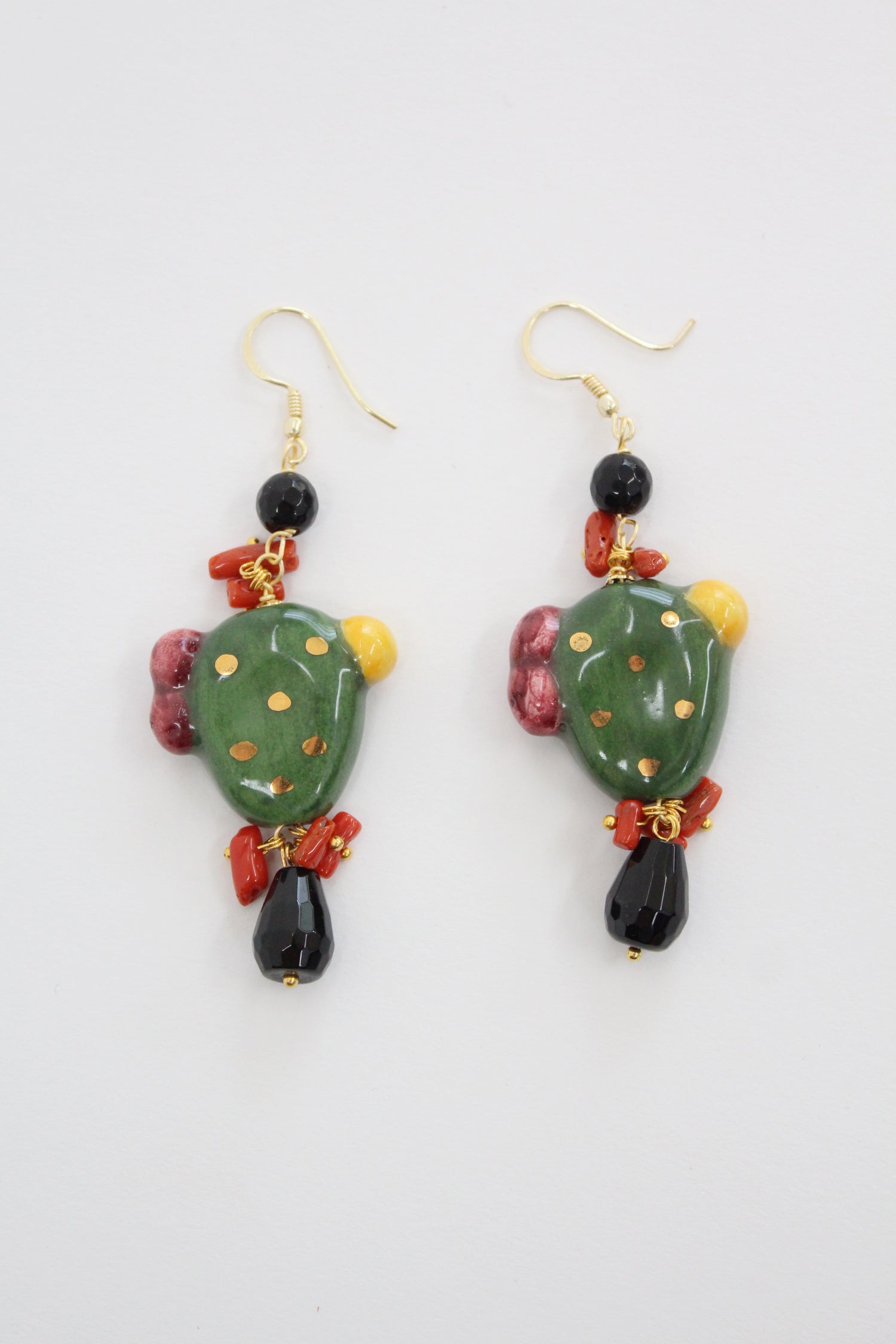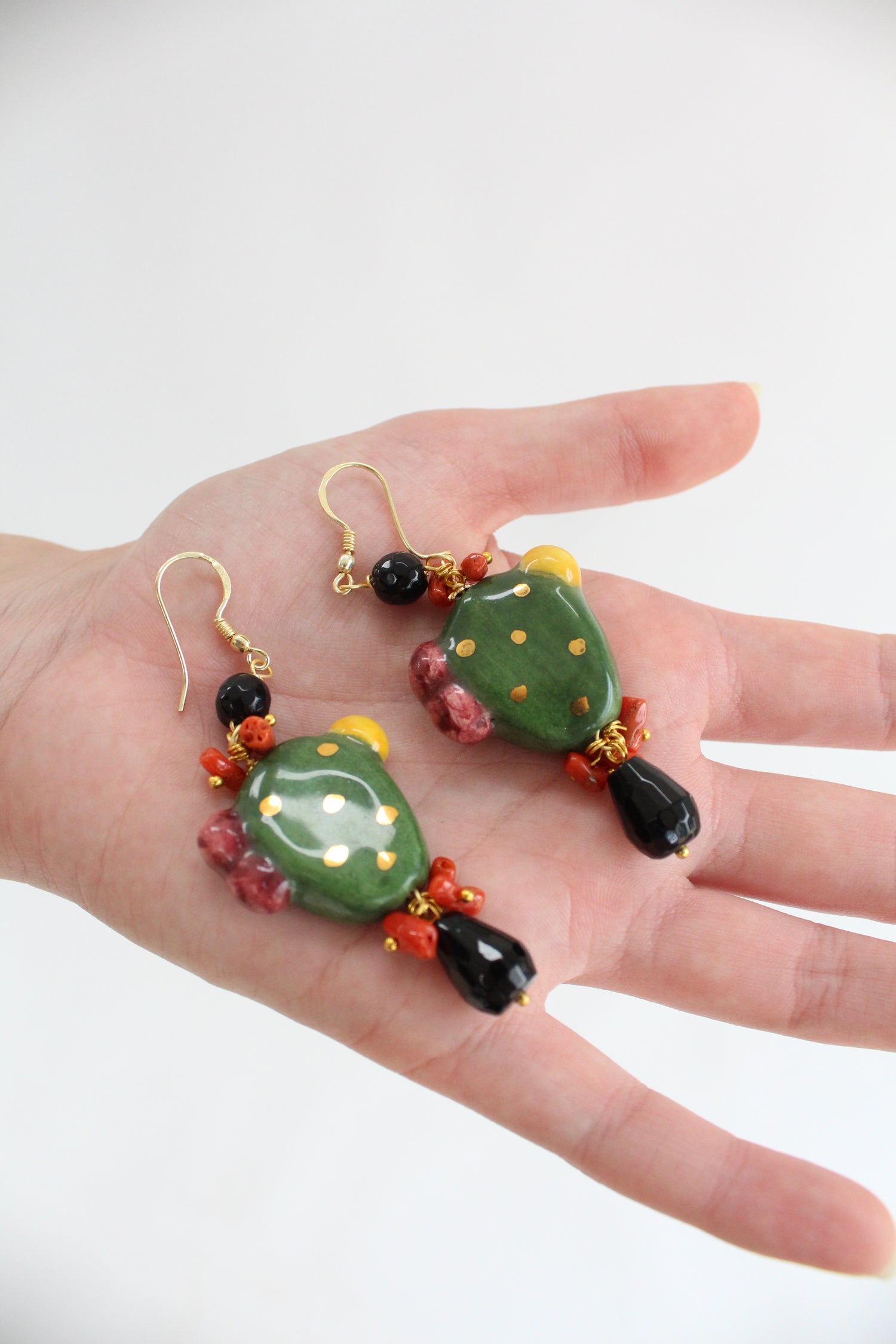 One of a kind, ceramic, 14K gold filled hooks, coral and glass beads. Easy to wear, not heavy. A special gift for someone who has it all.