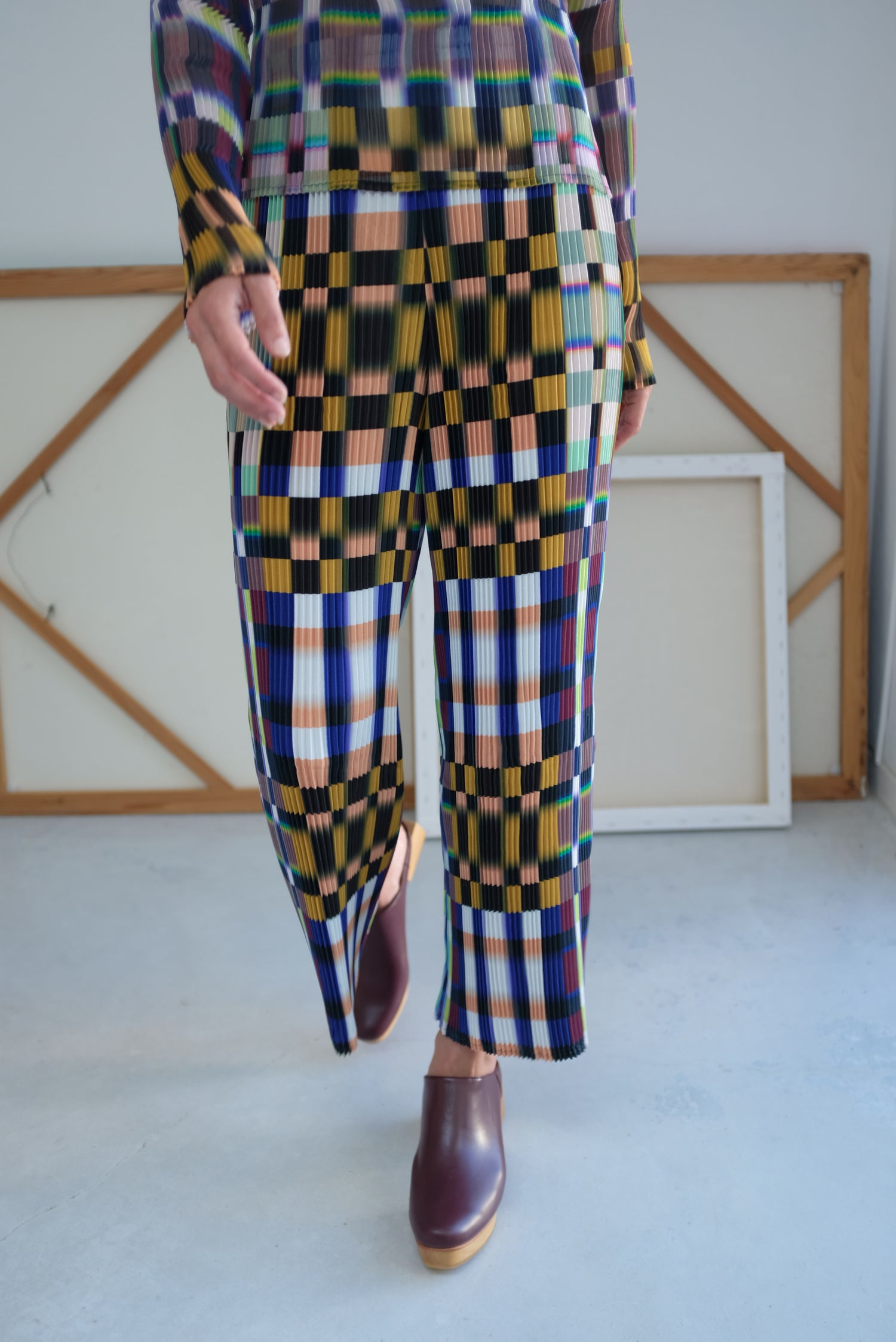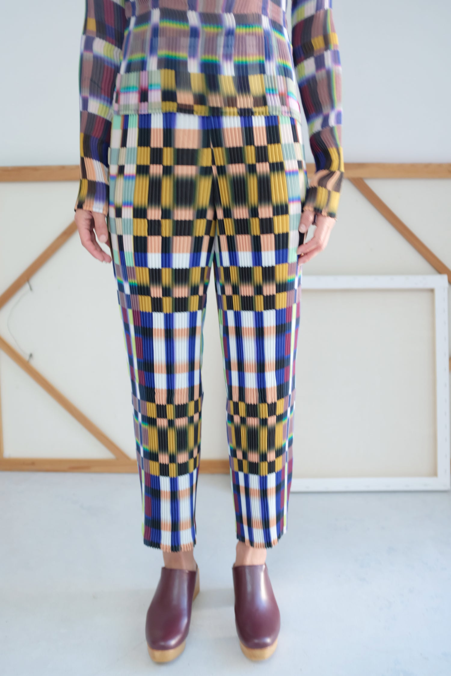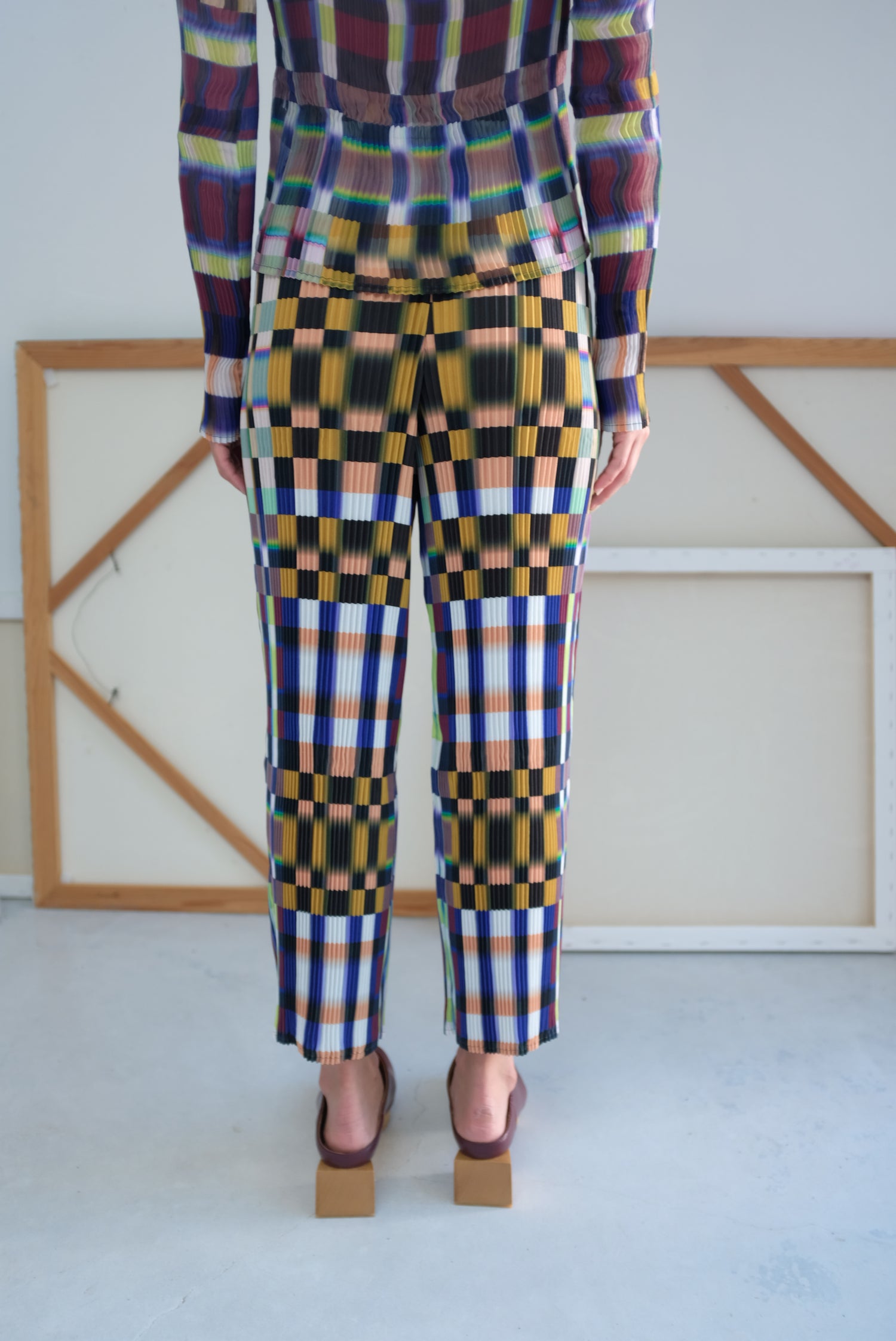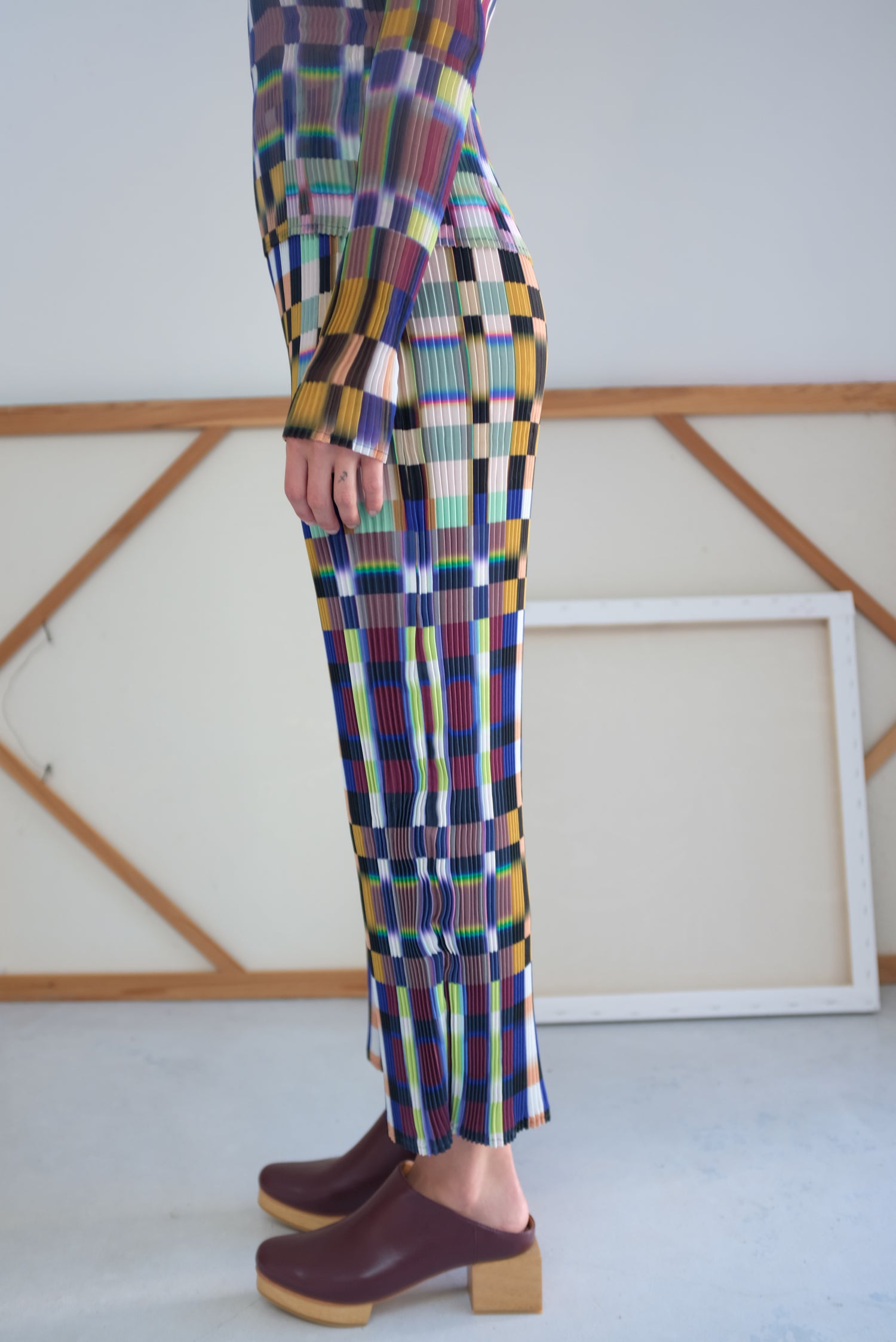 Beautiful hand dyed trouser. Hand pleated using arashi shibori technique. Pattern placement, pleating and measurements vary as each pant is handmade individually. Straight leg and elastic high-waist band. One size fits most. 100% PES Chiffon.