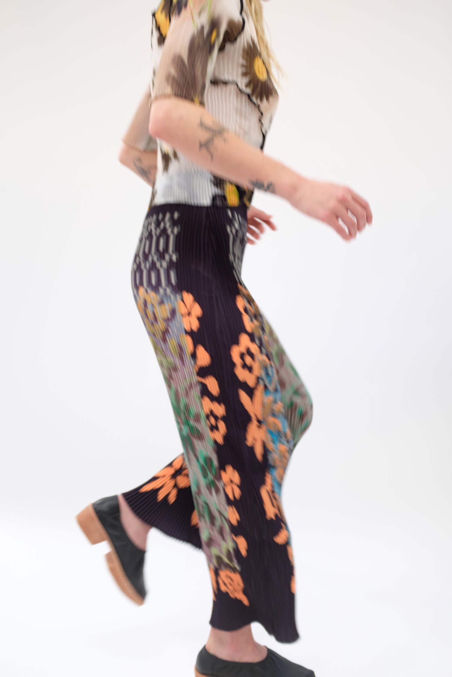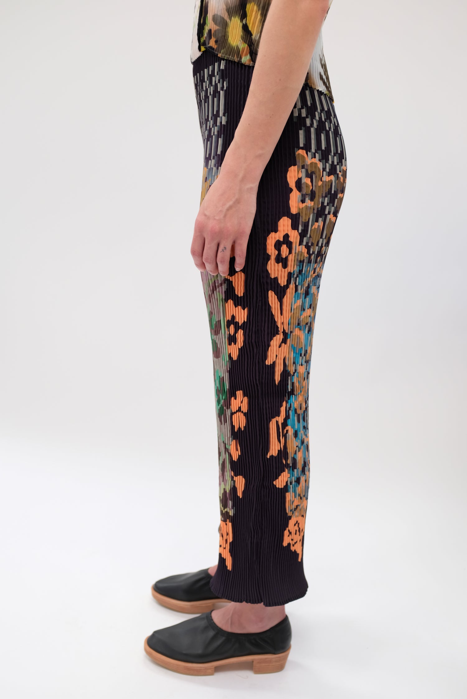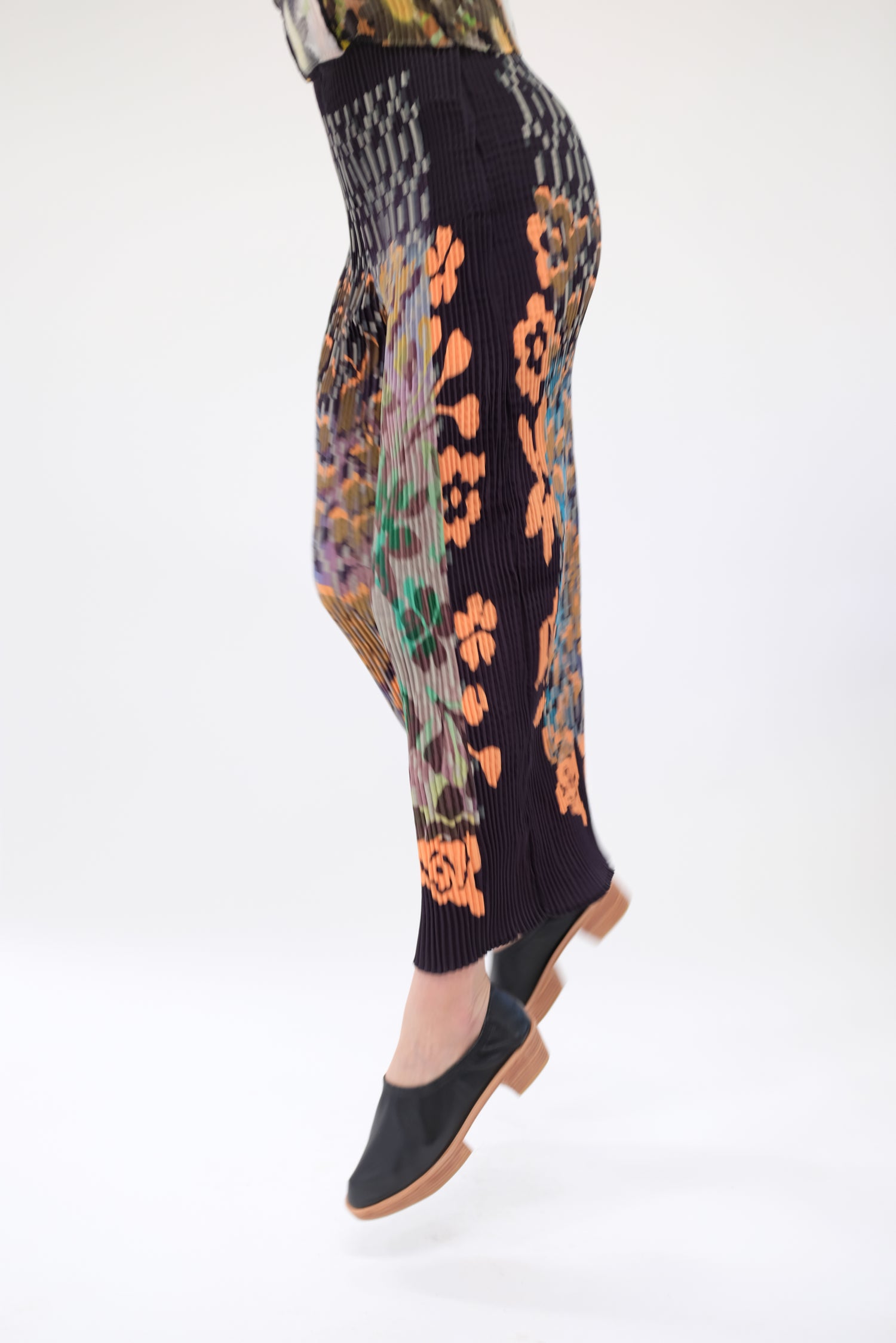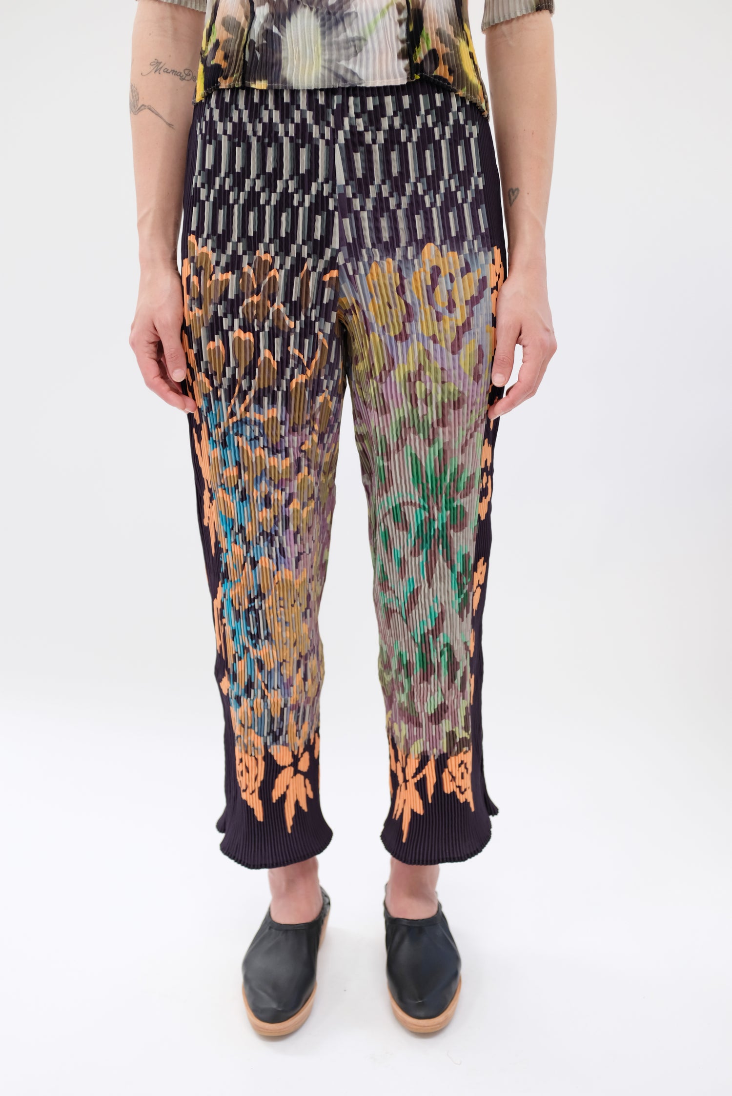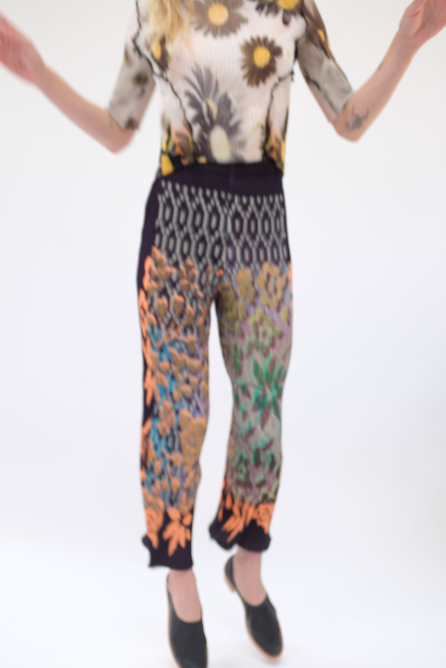 Beautiful hand dyed trouser. Hand pleated using arashi shibori technique. Pattern placement, pleating and measurements vary as each pant is handmade individually. Slightly flared hem and elastic high-waist band. One size fits most. 100% PES Chiffon.