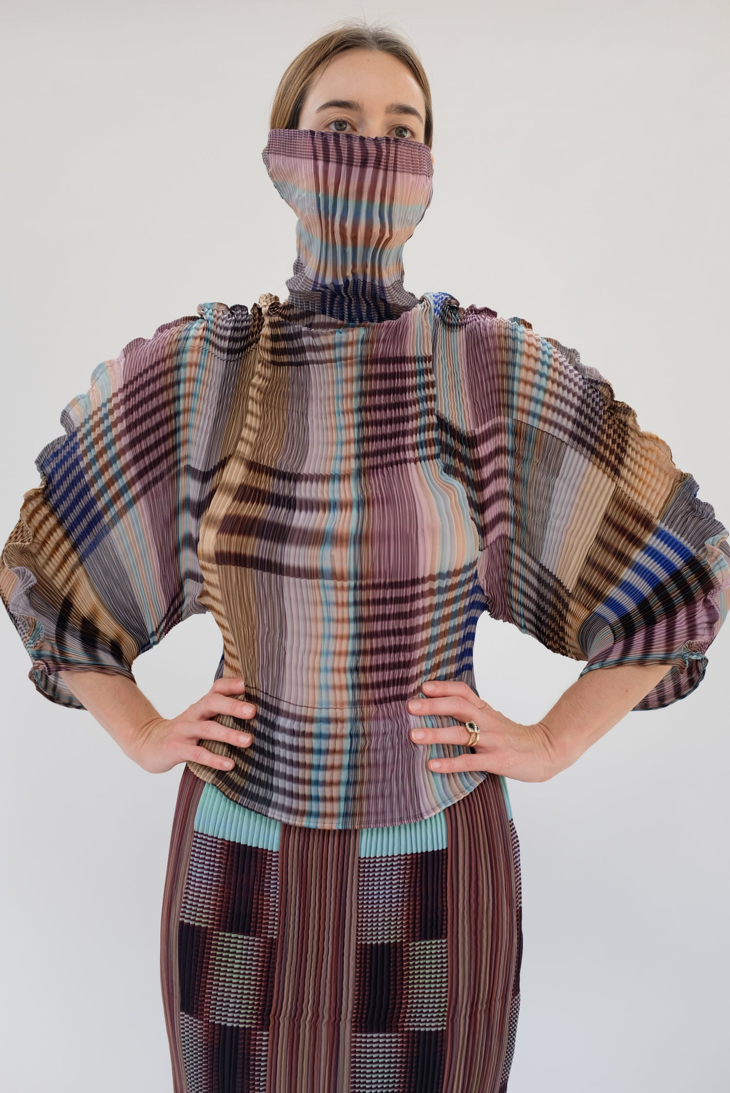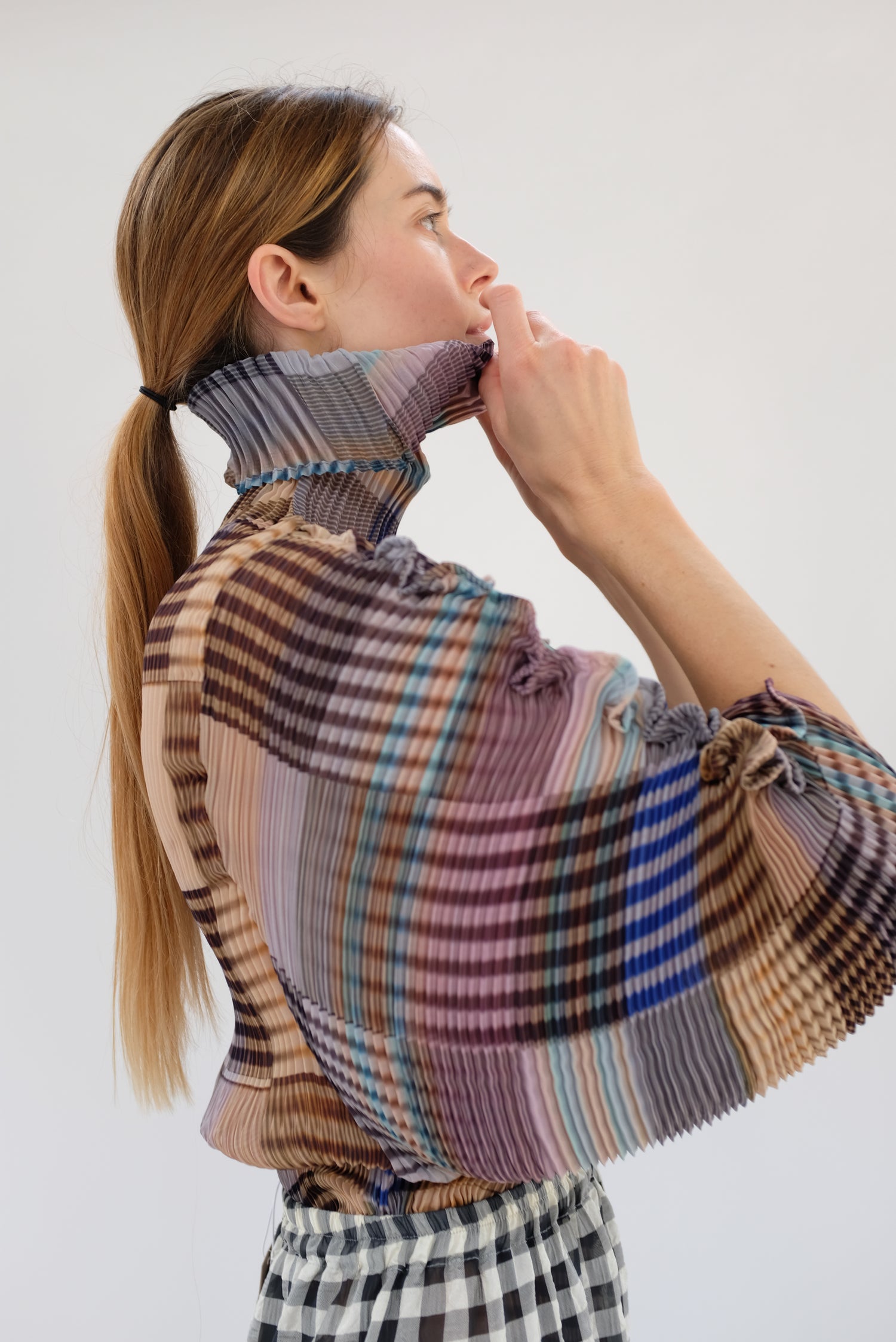 Beautiful hand dyed turtleneck top,. Hand pleated using arashi shibori technique. Pattern placement, pleating and measurements vary as each top is handmade individually. Long wide sleeves, slightly sheer. One size fits most. 100% PES Chiffon.