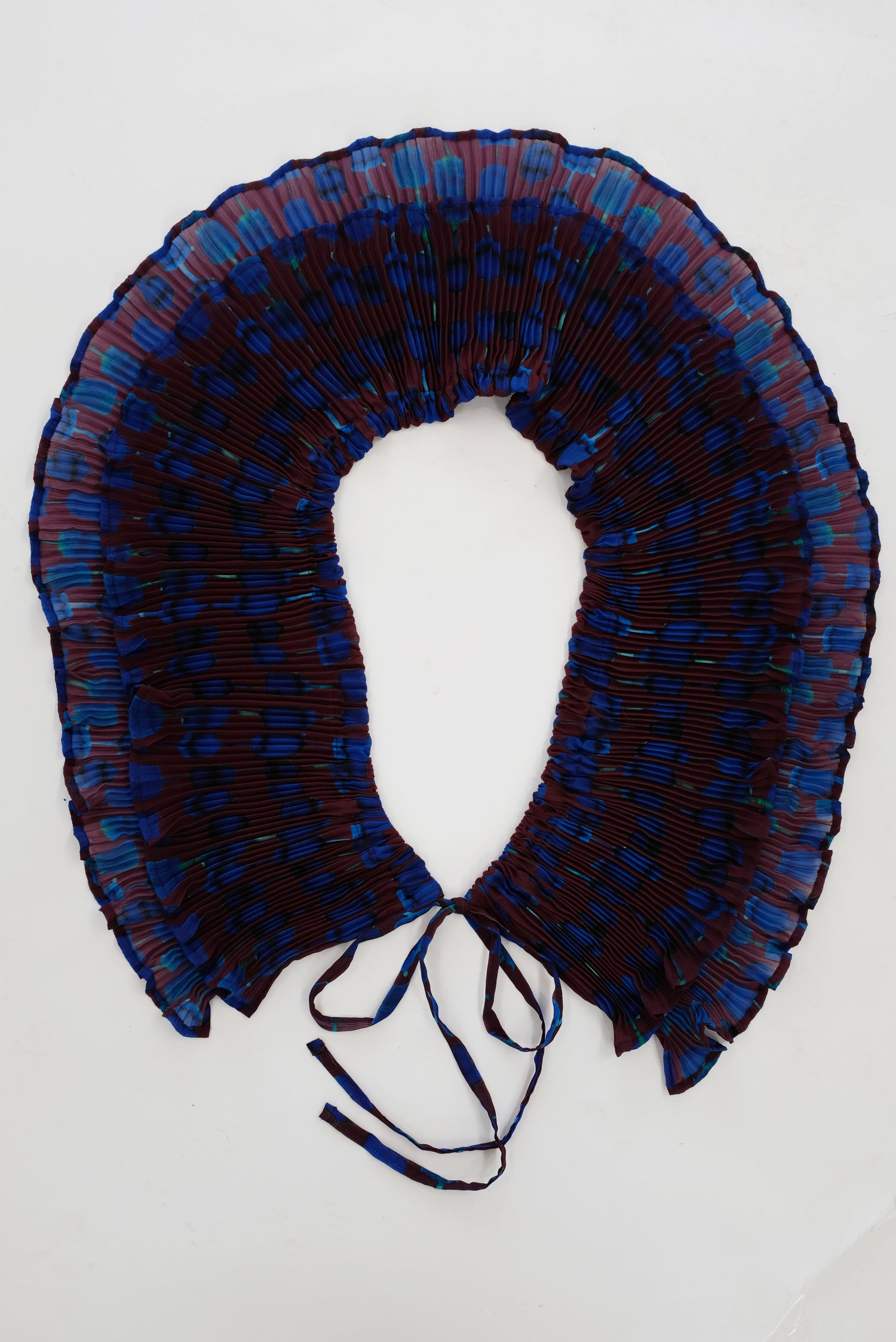 Pleated tie collar. Adjustable. Pattern placement, hand pleating and measurements slightly vary as each skirt is handmade individually. One size fits most. 100% recycled poly chiffon