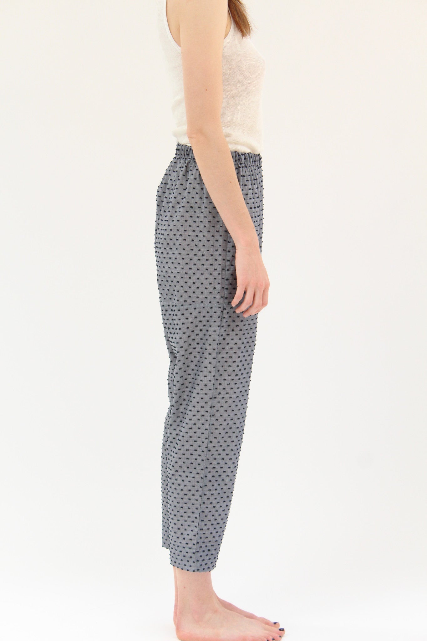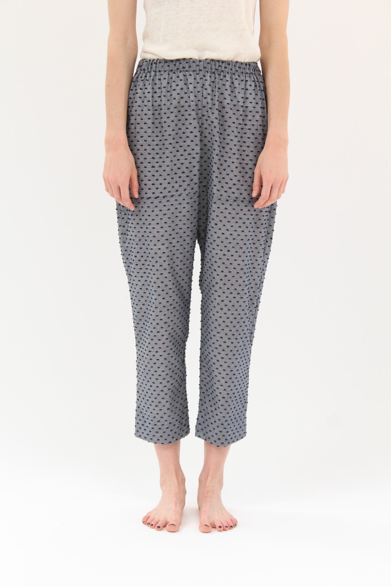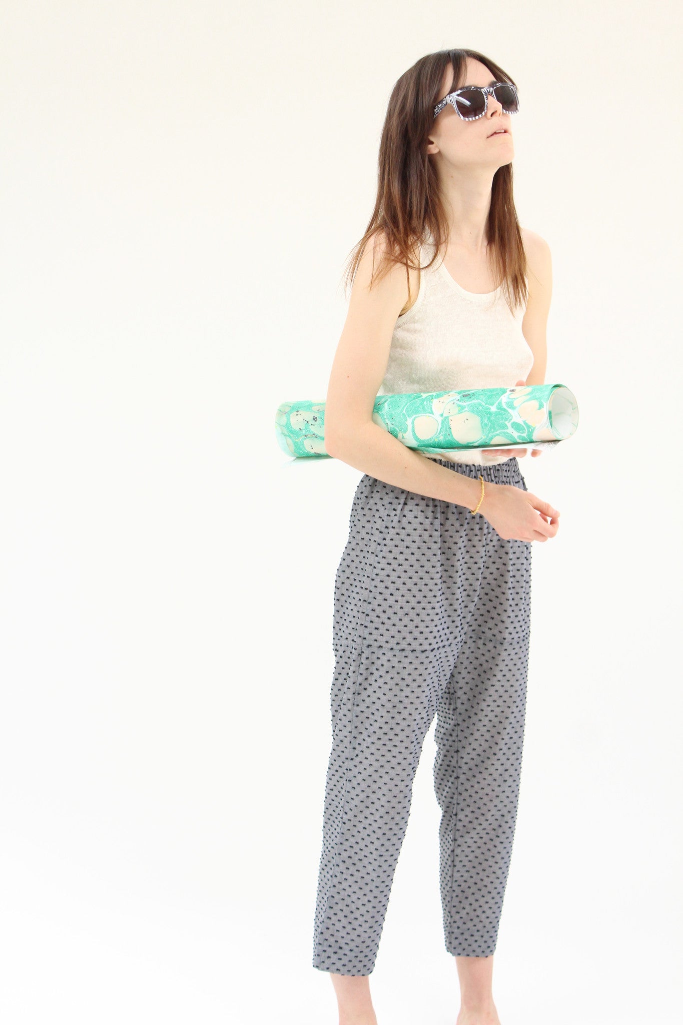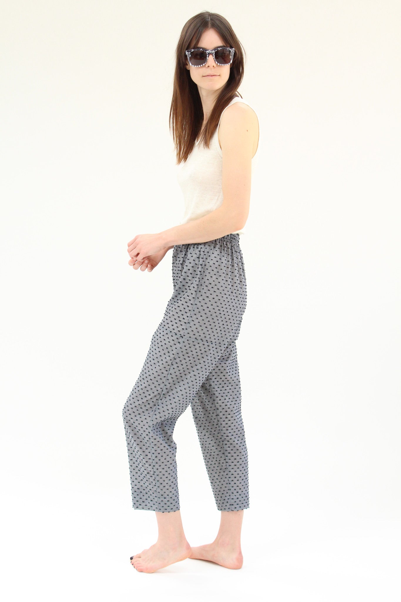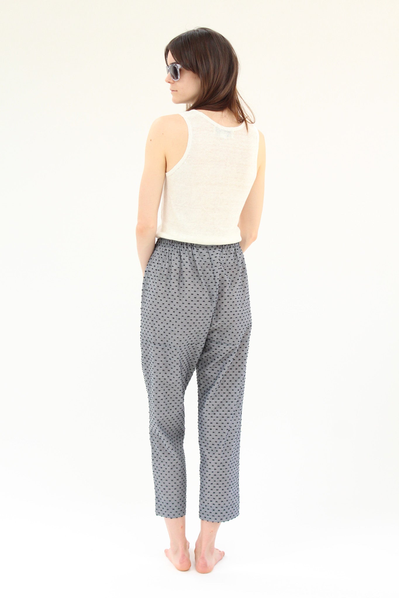 Best selling pants in new fabric that is so good! Washed lightweight cotton with tuffs of black, elastic waist, crazy comfortable. Slightly cropped. To be wore just below true waist but work a little higher or a little lower. Loose drape fit. Model is wearing a small/medium and she is 5 9" Total length 34 1/2" Inseam 27"