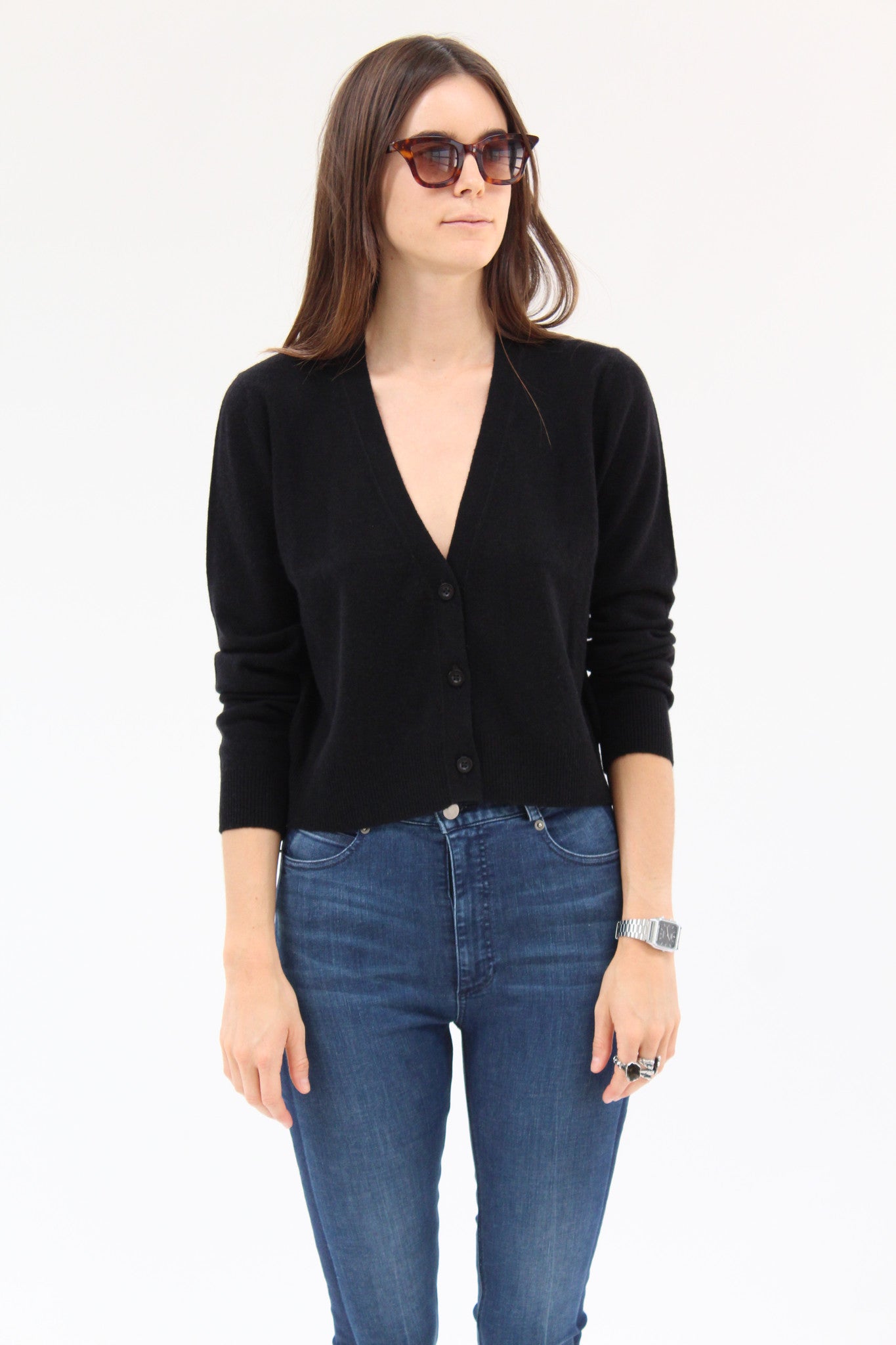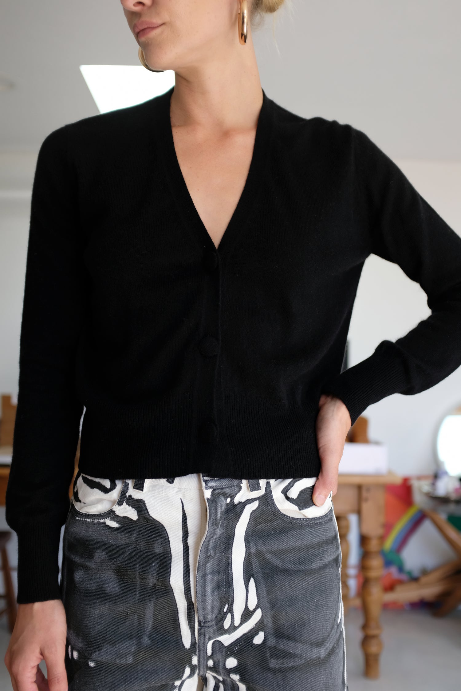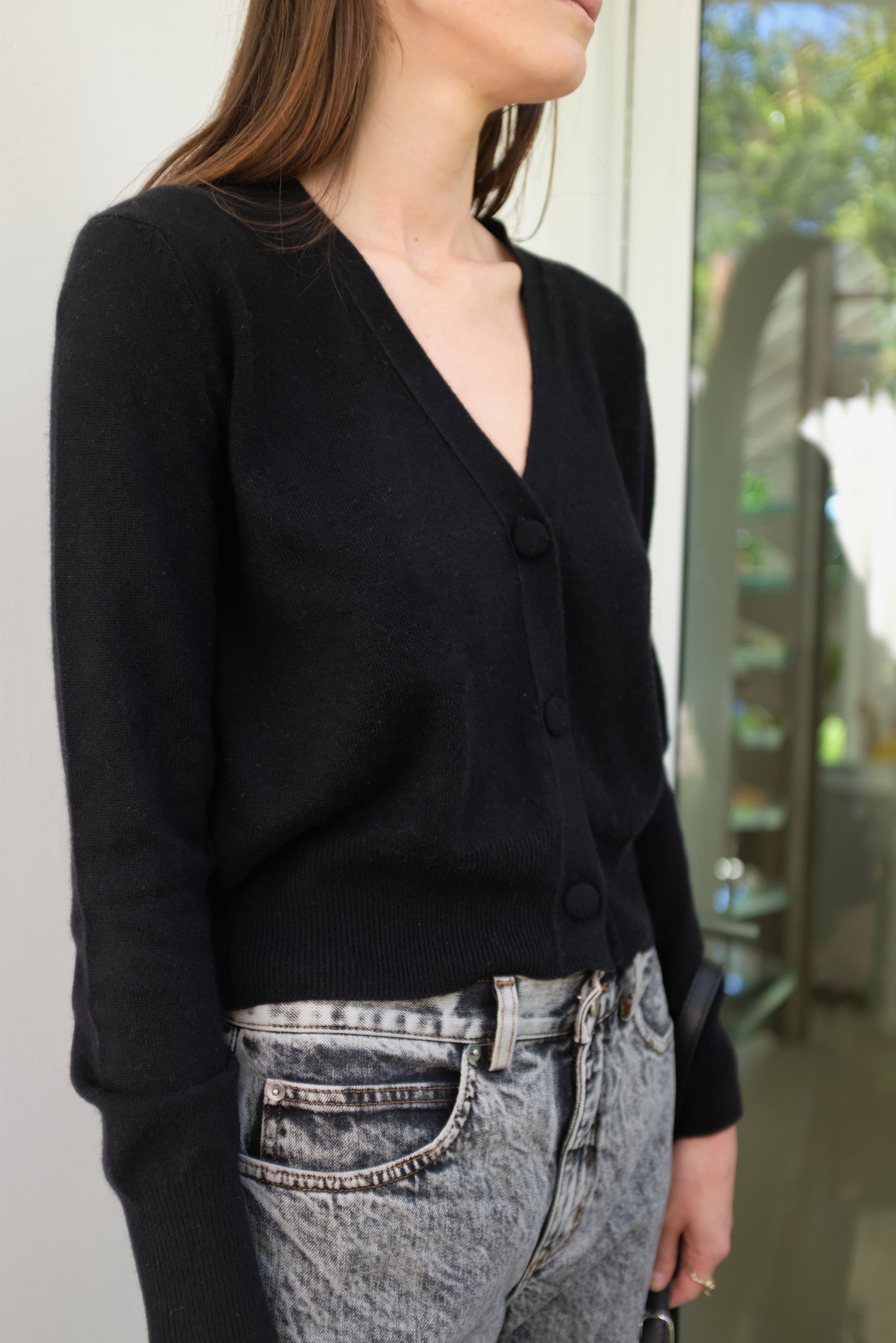 Best selling cardigan. 100% cashmere. Classic v-neck cardigan, slightly cropped, cashmere covered buttons down front. Medium weight, not sheer, wear as a laying piece or on it's own, solo. Size up for a less cropped look, and down for a more cropped look. Exclusive to Beklina.