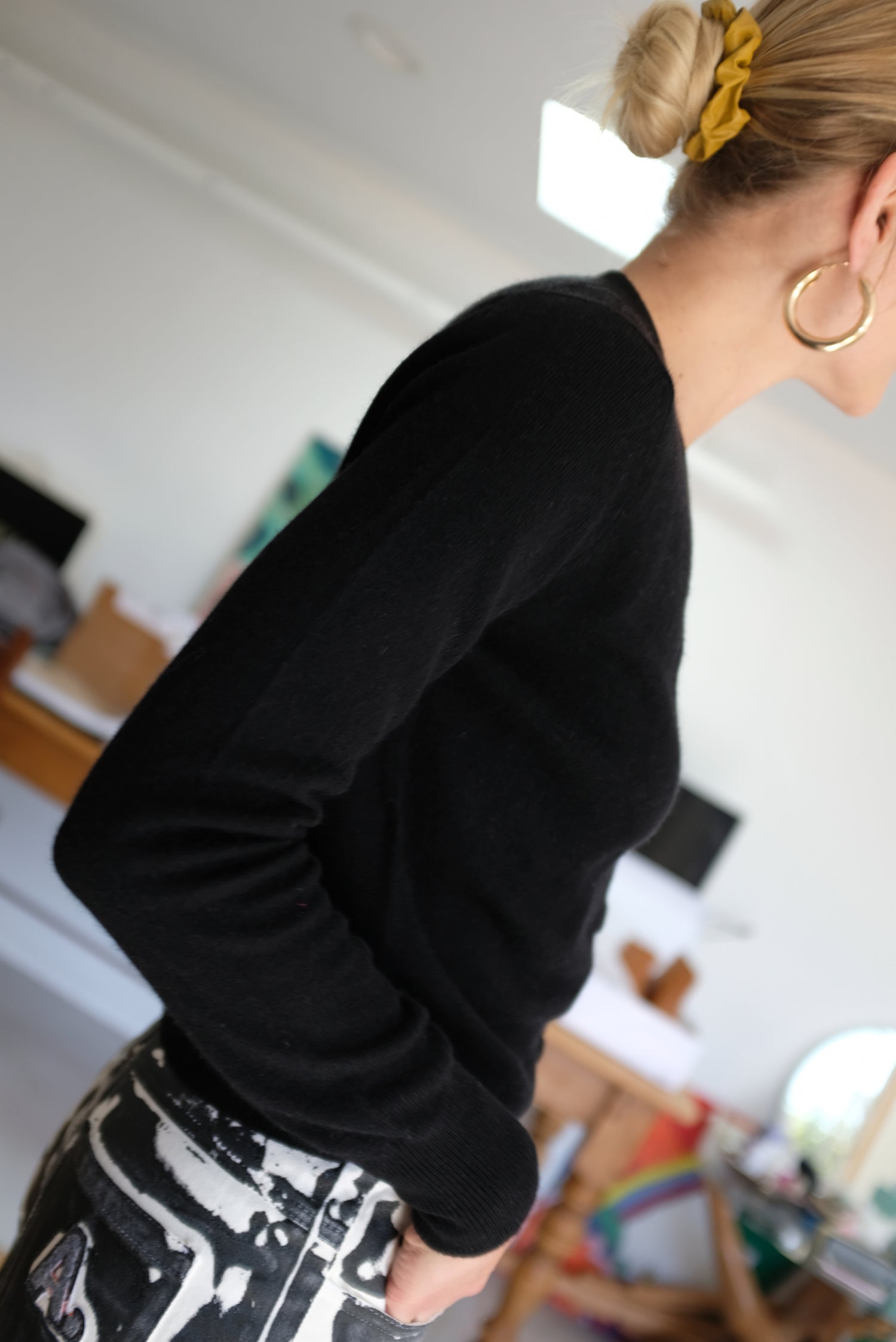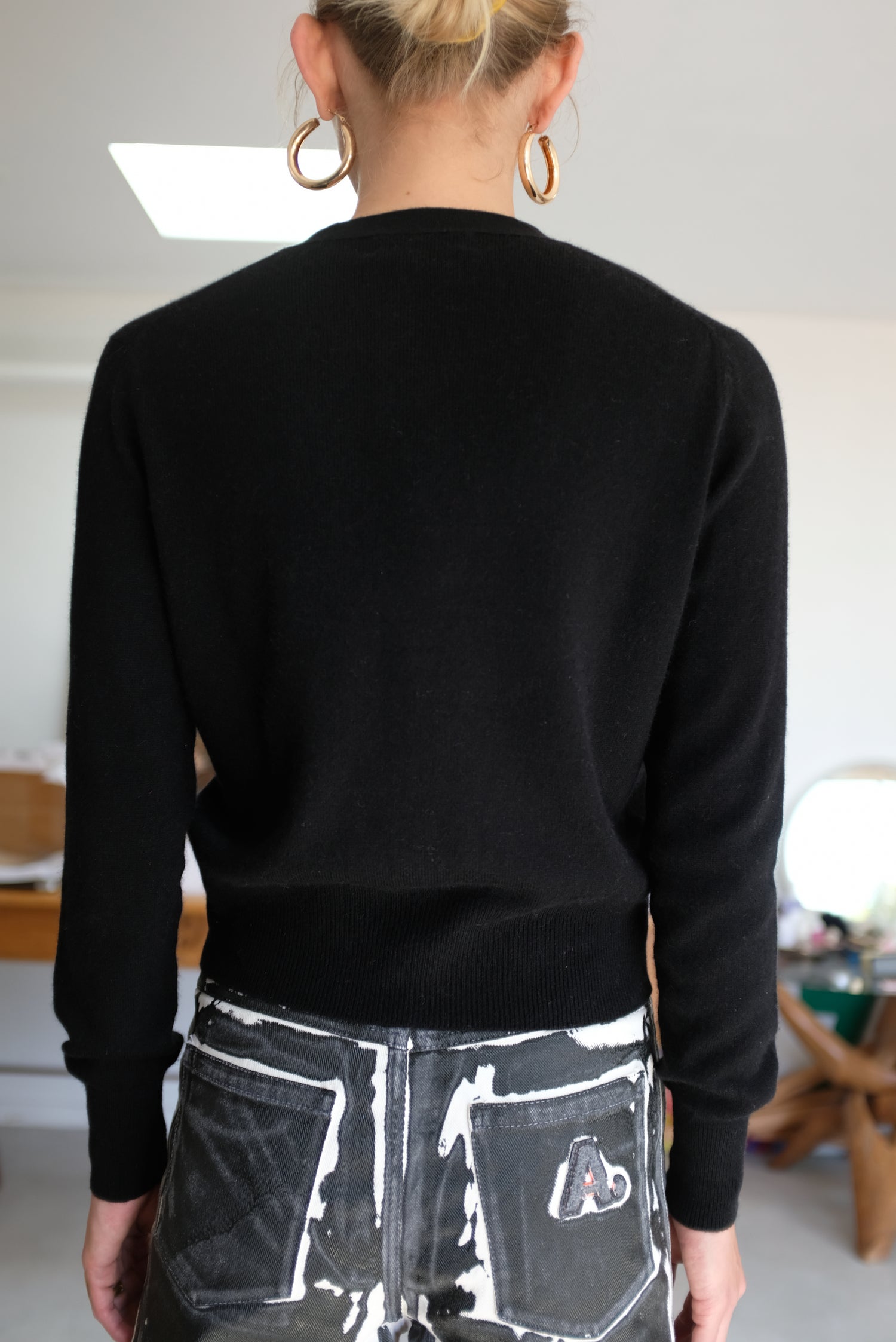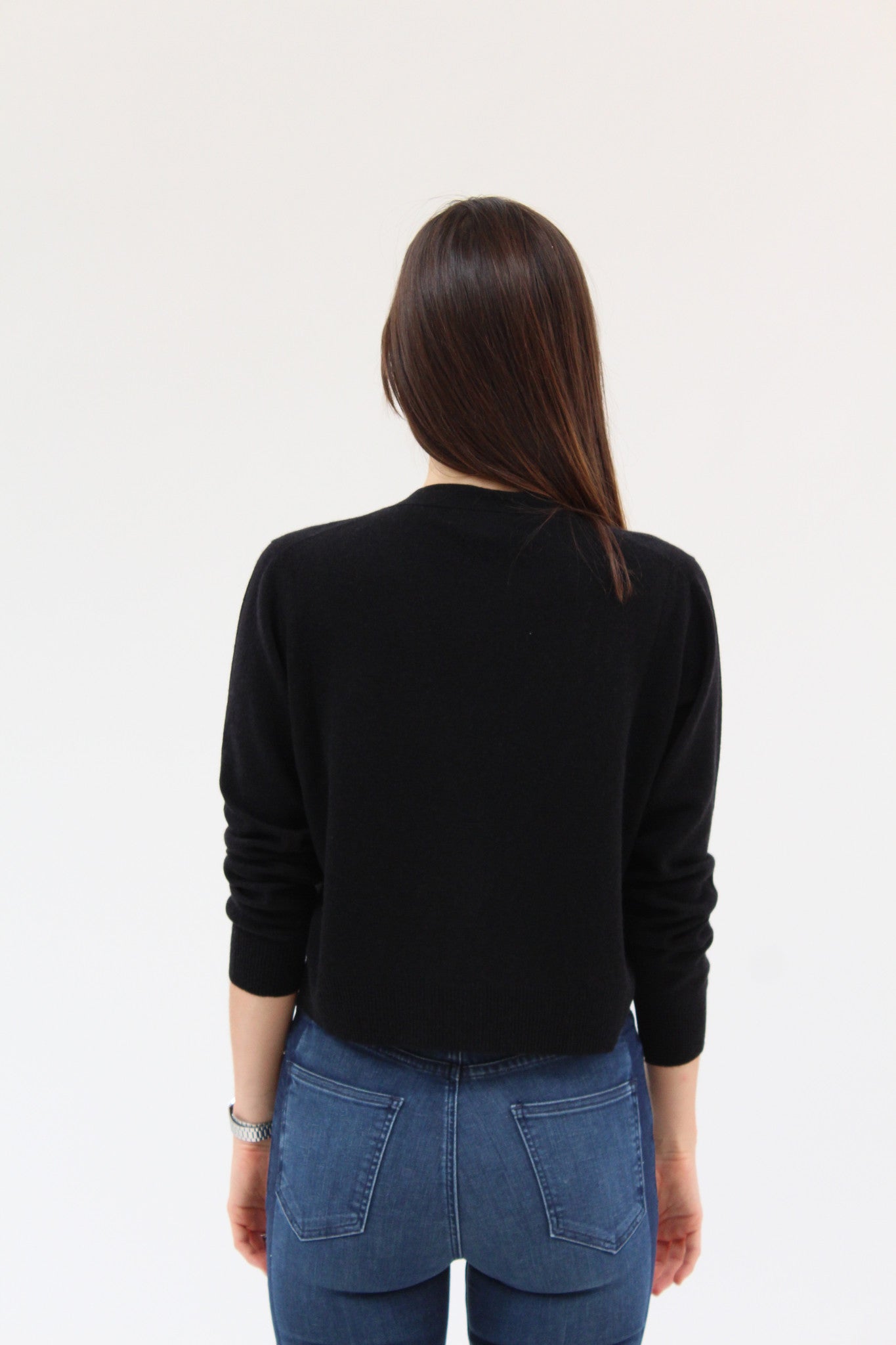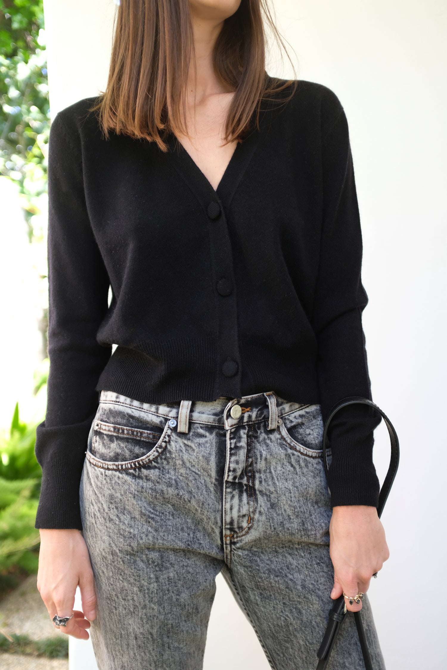 Best selling cardigan. 100% cashmere. Classic v-neck cardigan, slightly cropped, cashmere covered buttons down front. Medium weight, not sheer, wear as a laying piece or on it's own, solo. Size up for a less cropped look, and down for a more cropped look. Exclusive to Beklina.