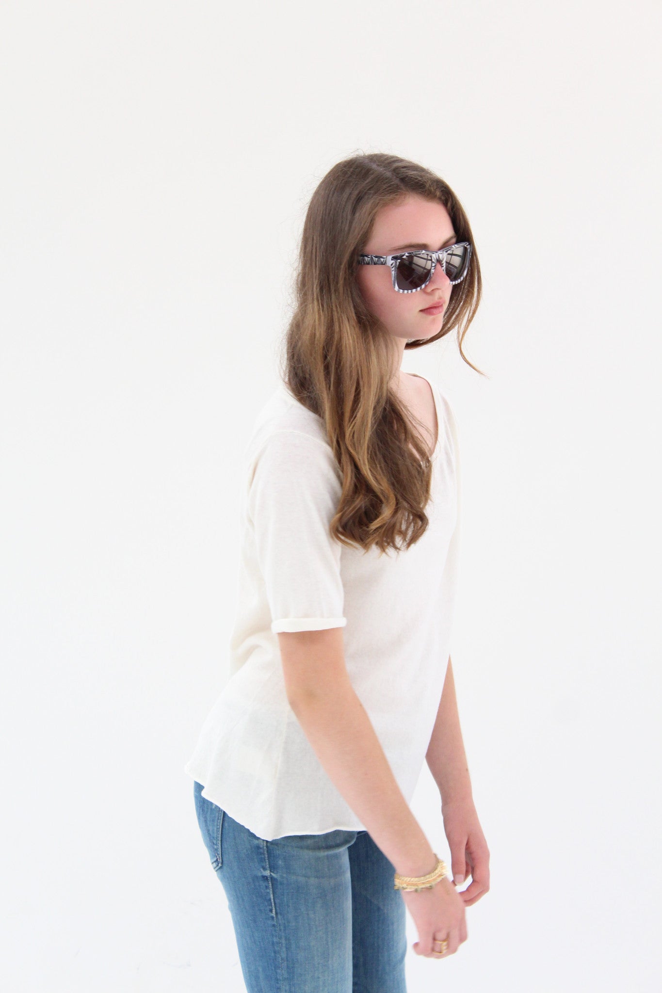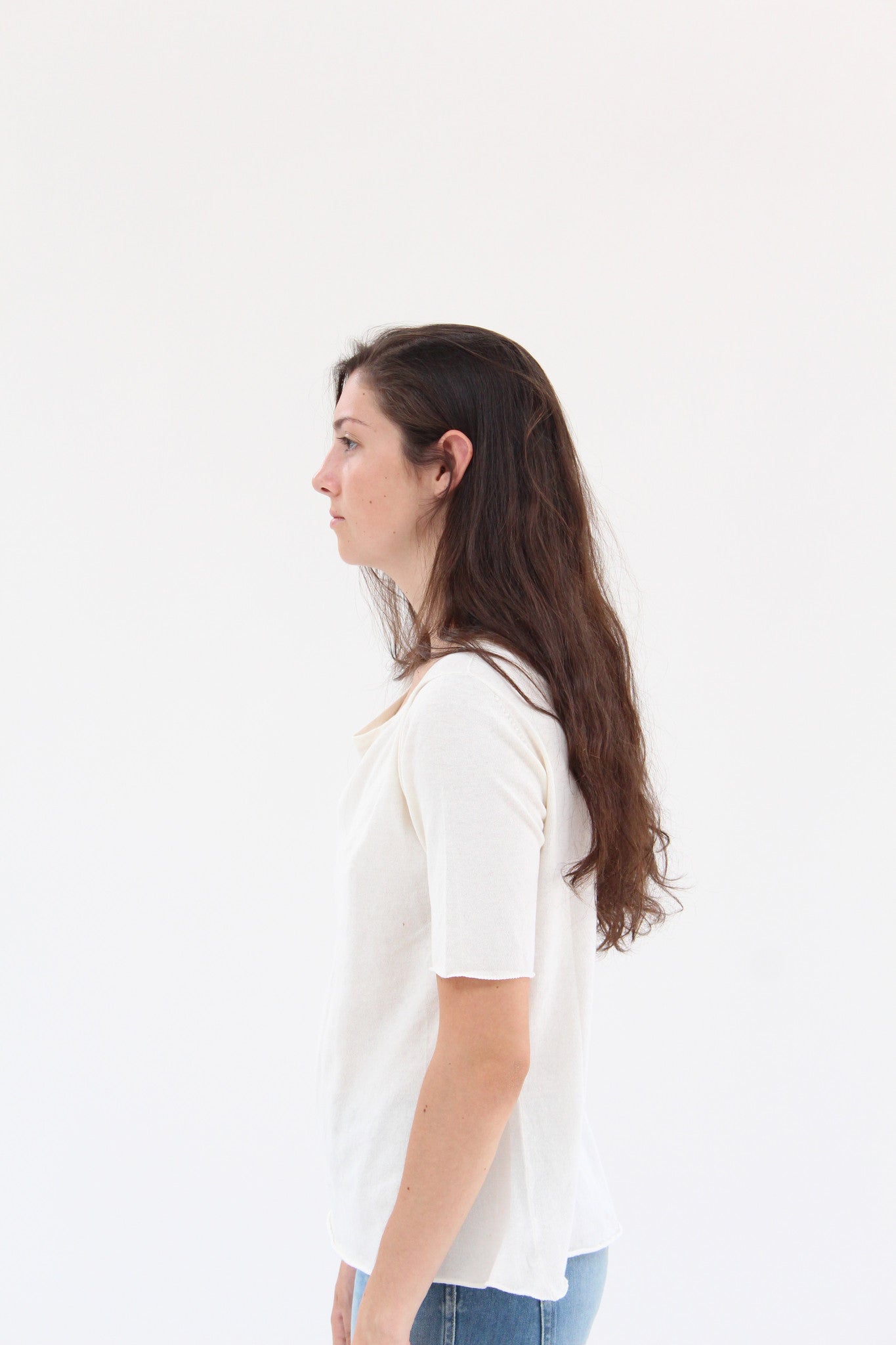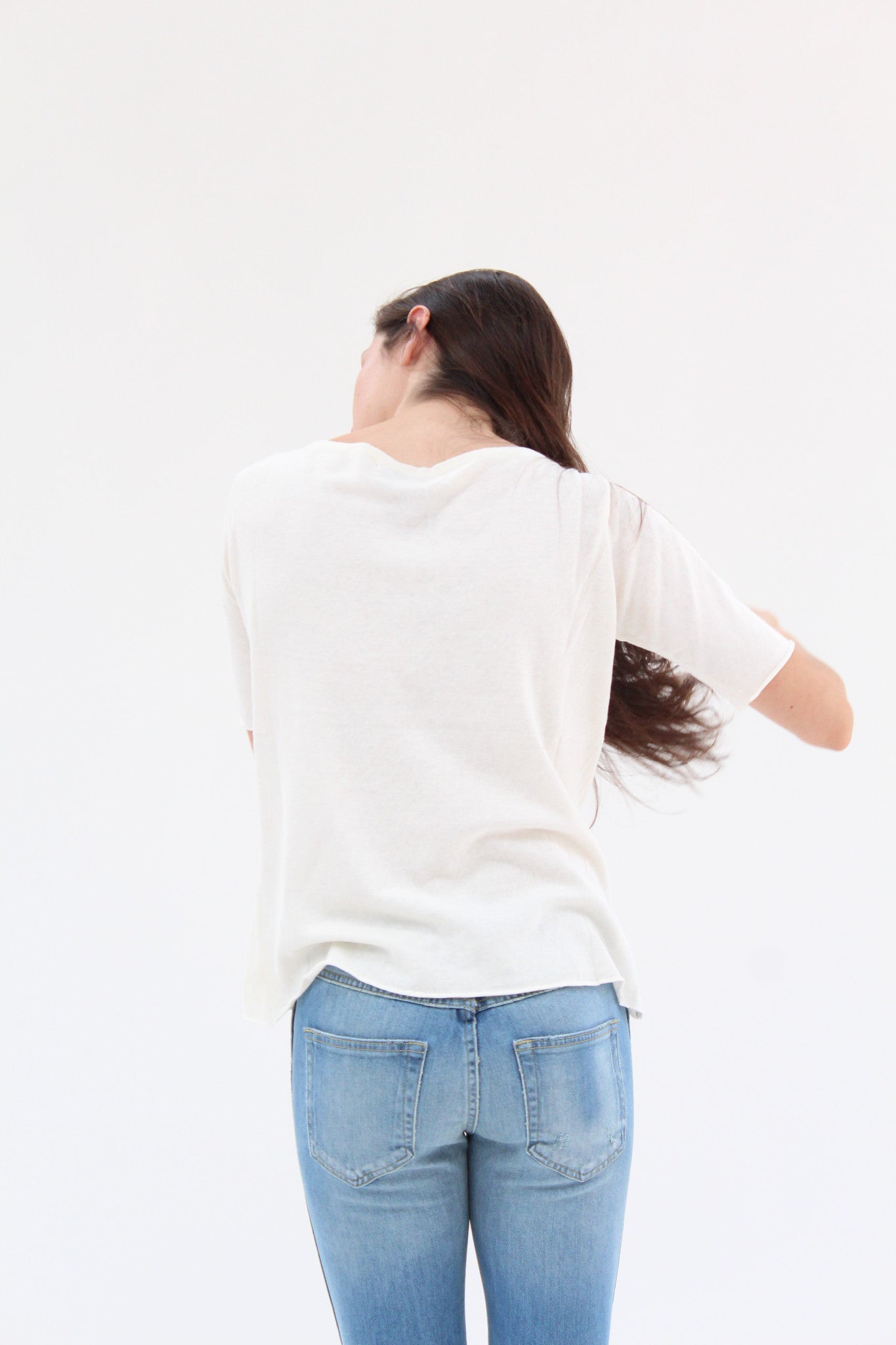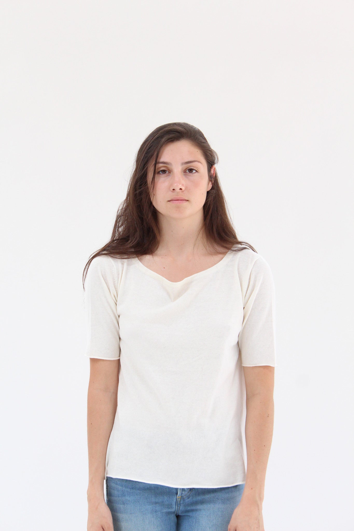 100% Cotton, ultra soft, loose fitting light weight, not sheer, sweater knit t-shirt. Wide boat neck.