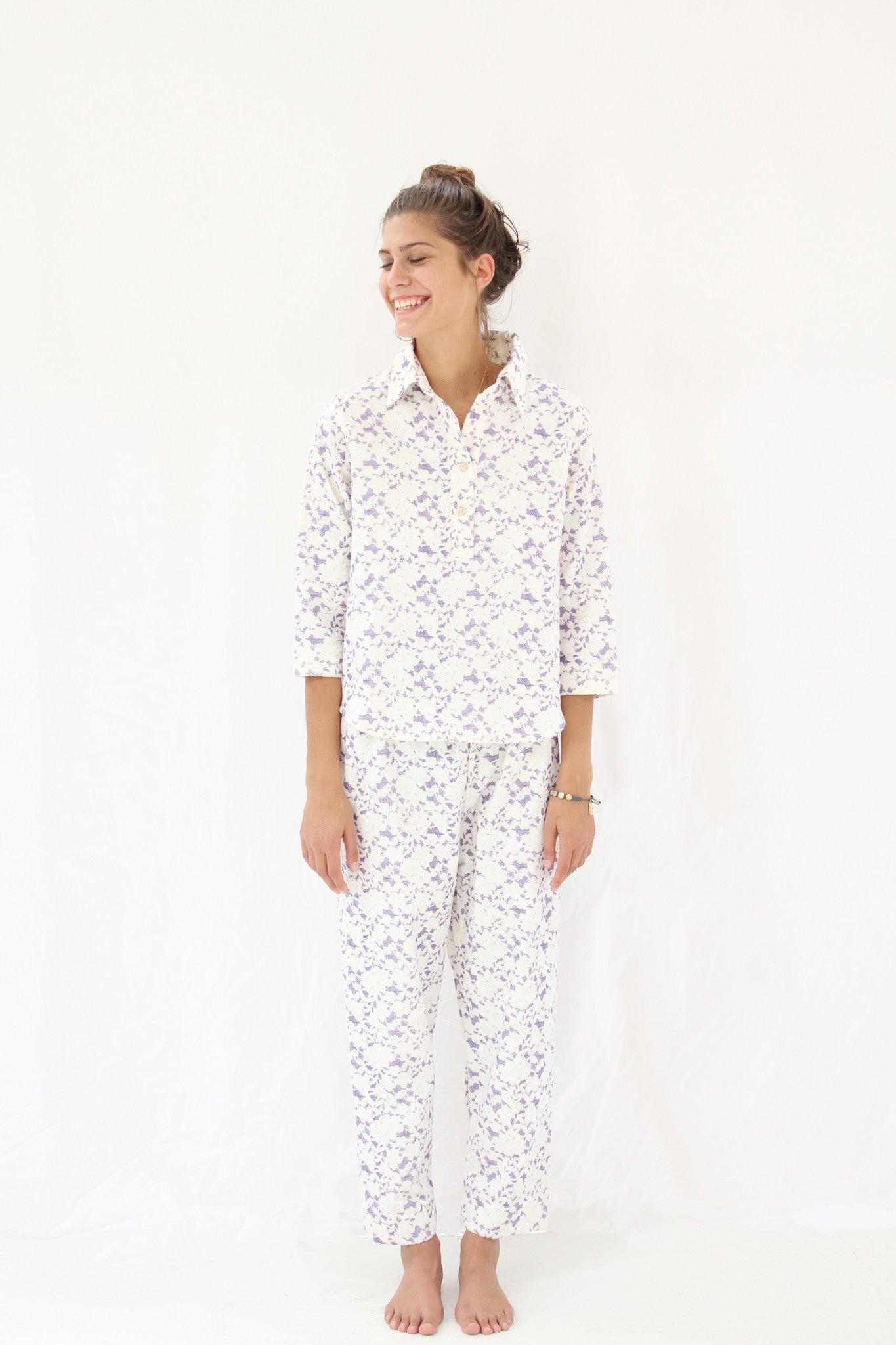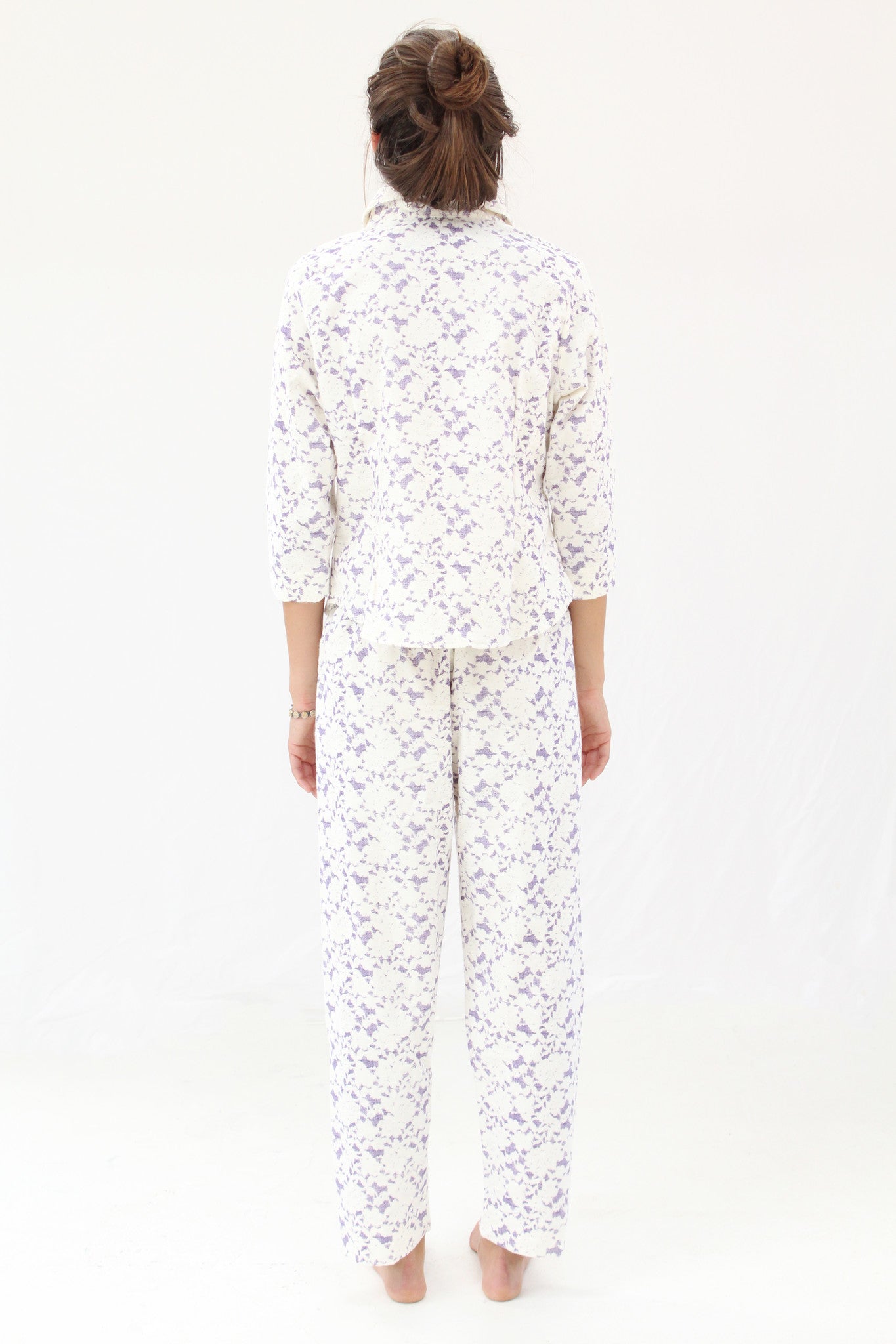 100% organic cotton soft flannel pj's that get cozier and cozier with each washing. Lace print. Warm full of love pj's, feels like sleeping wrapped in cotton balls. French seams, gentle elastic waist, sold as a set.