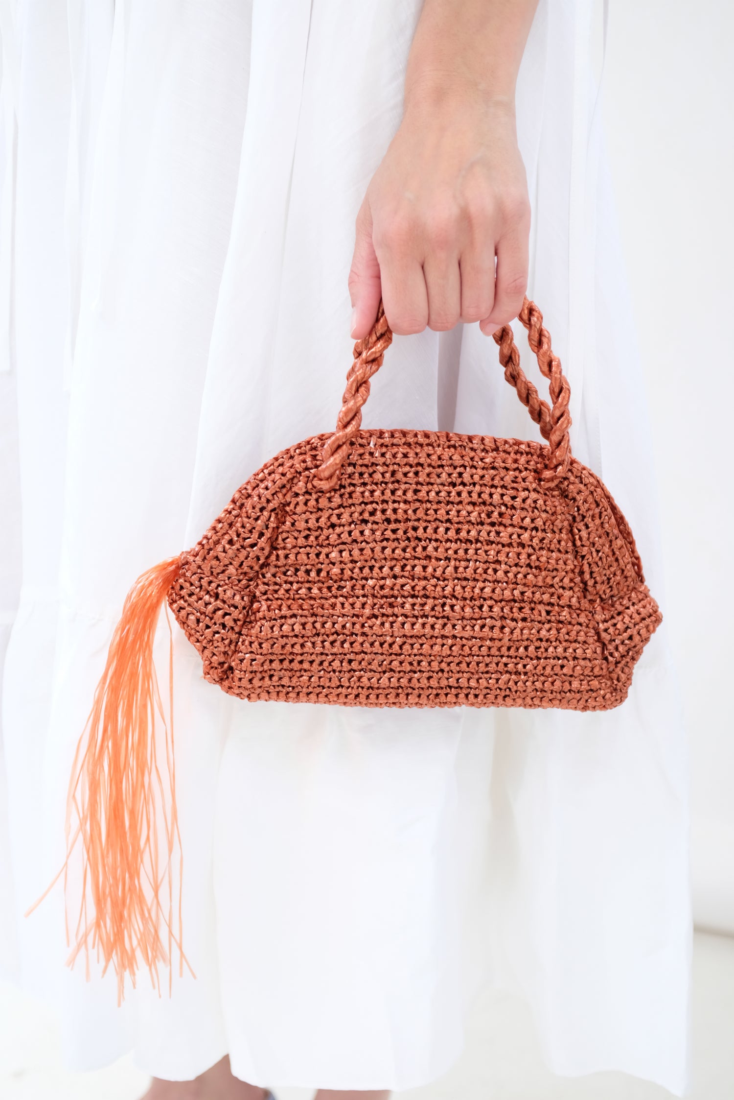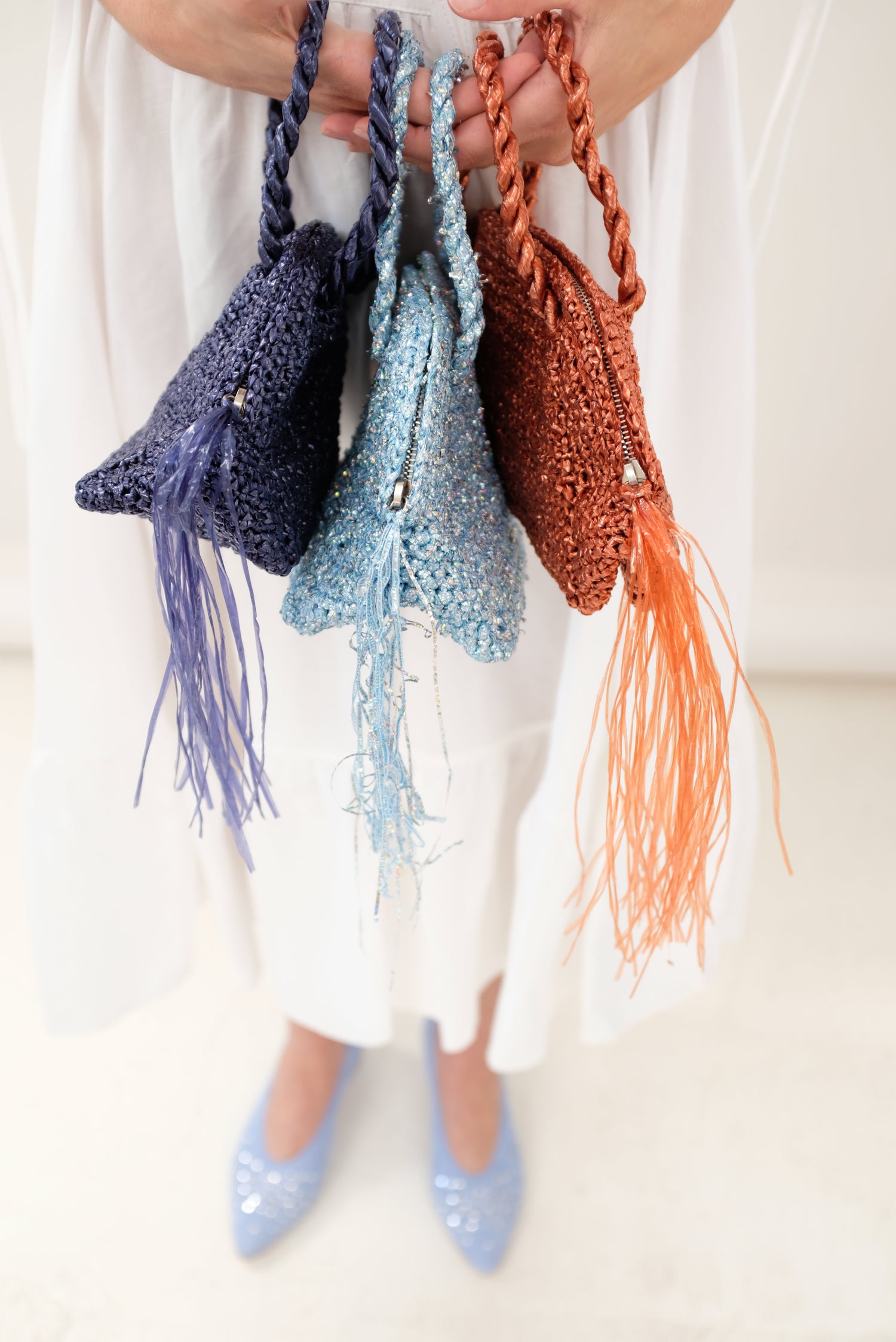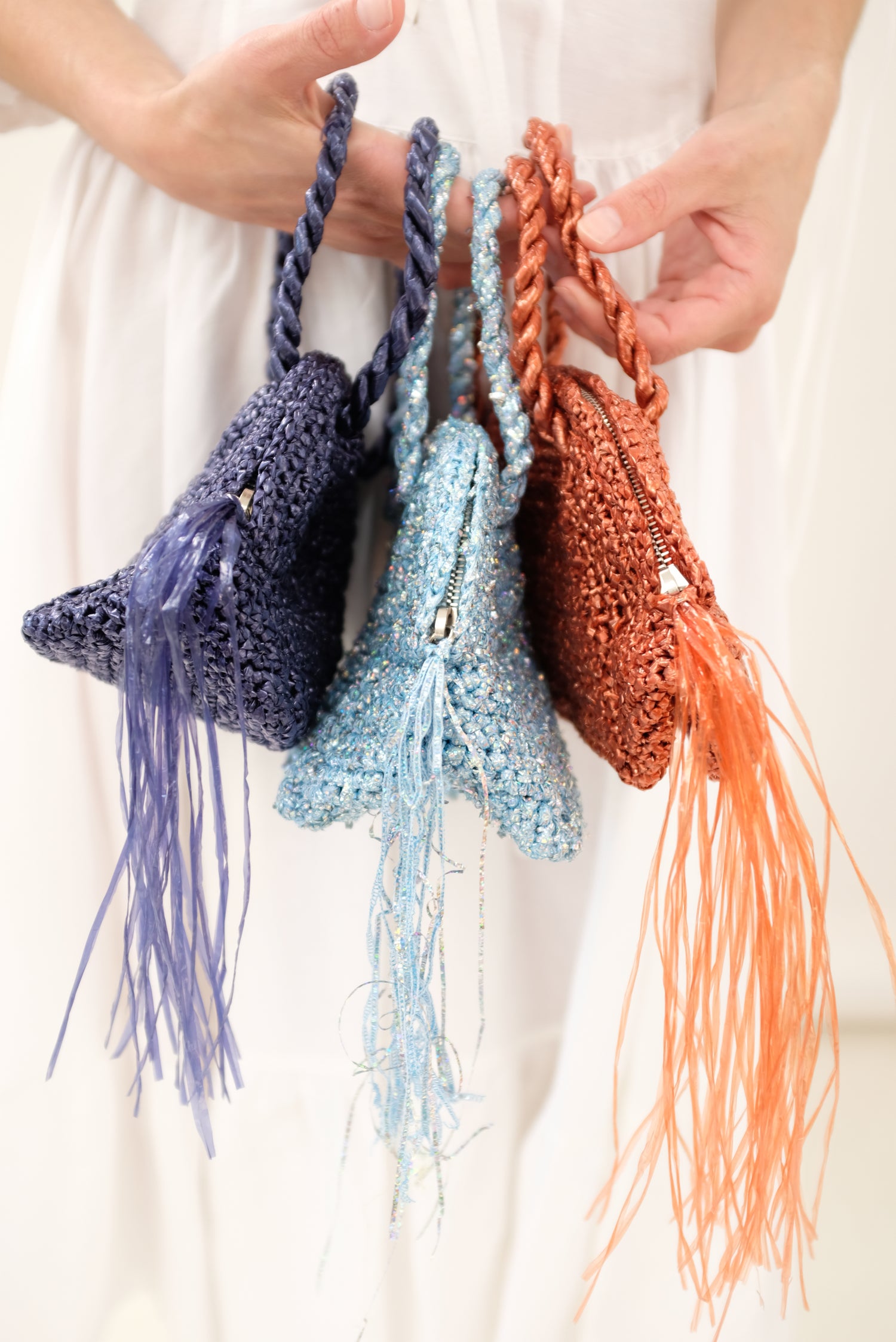 Small half-moon woven handbag in metallic sparkle. Top zipper closure with tassel detail. 100% Polyester.