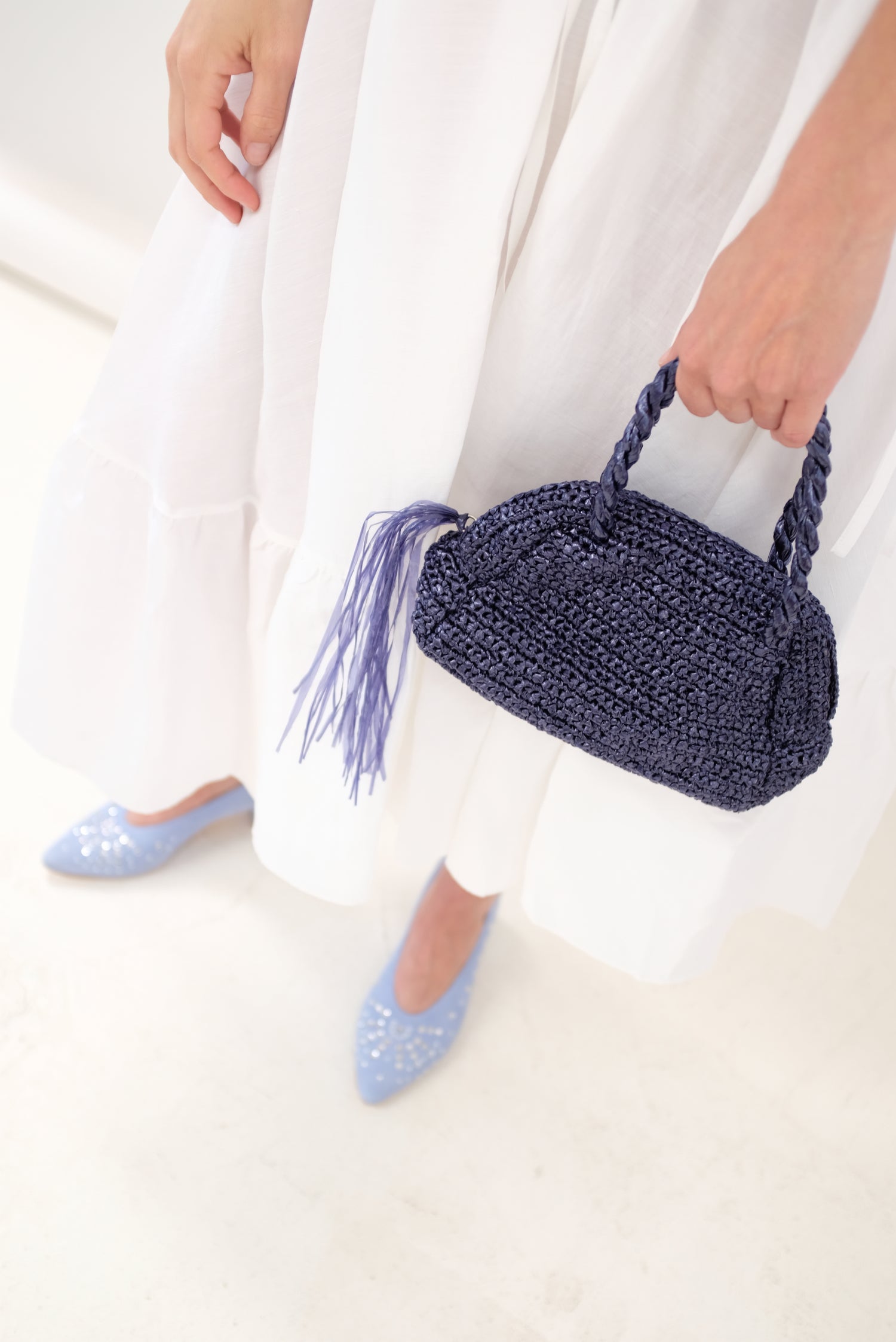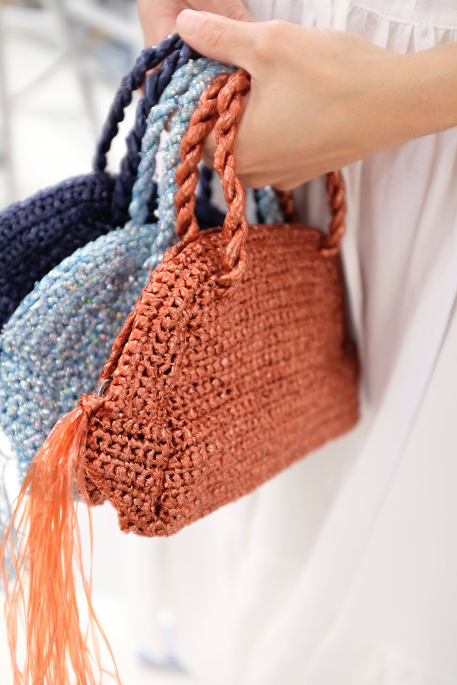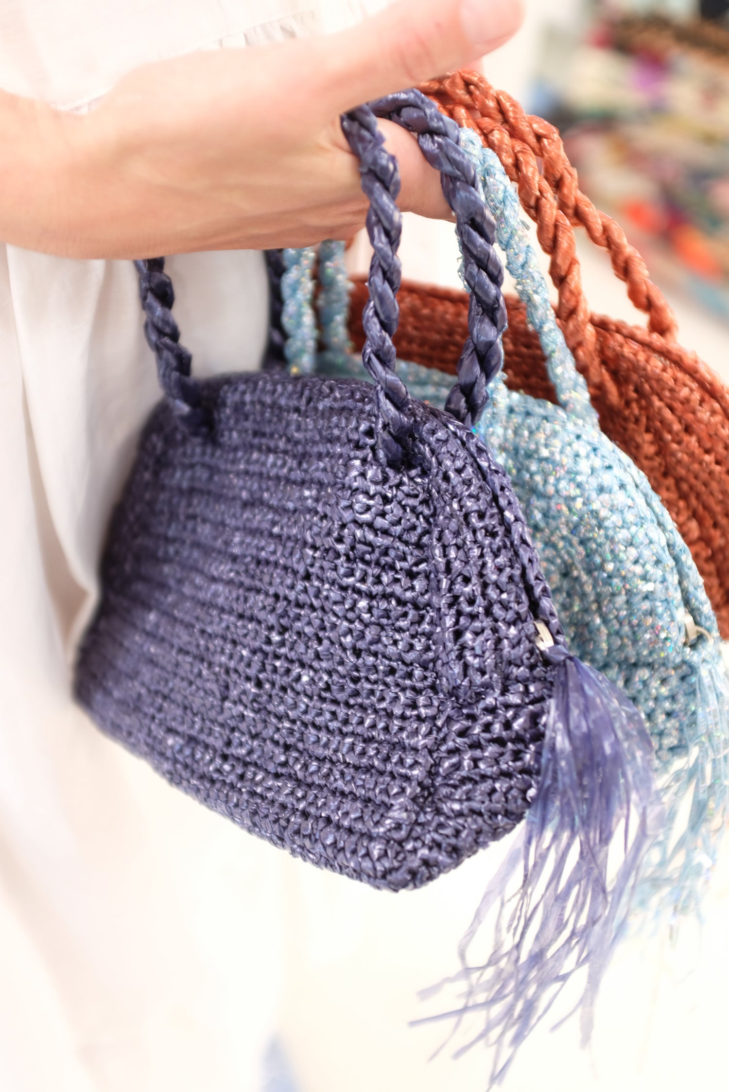 Small half-moon woven handbag in metallic sparkle. Top zipper closure with tassel detail. 100% Polyester.