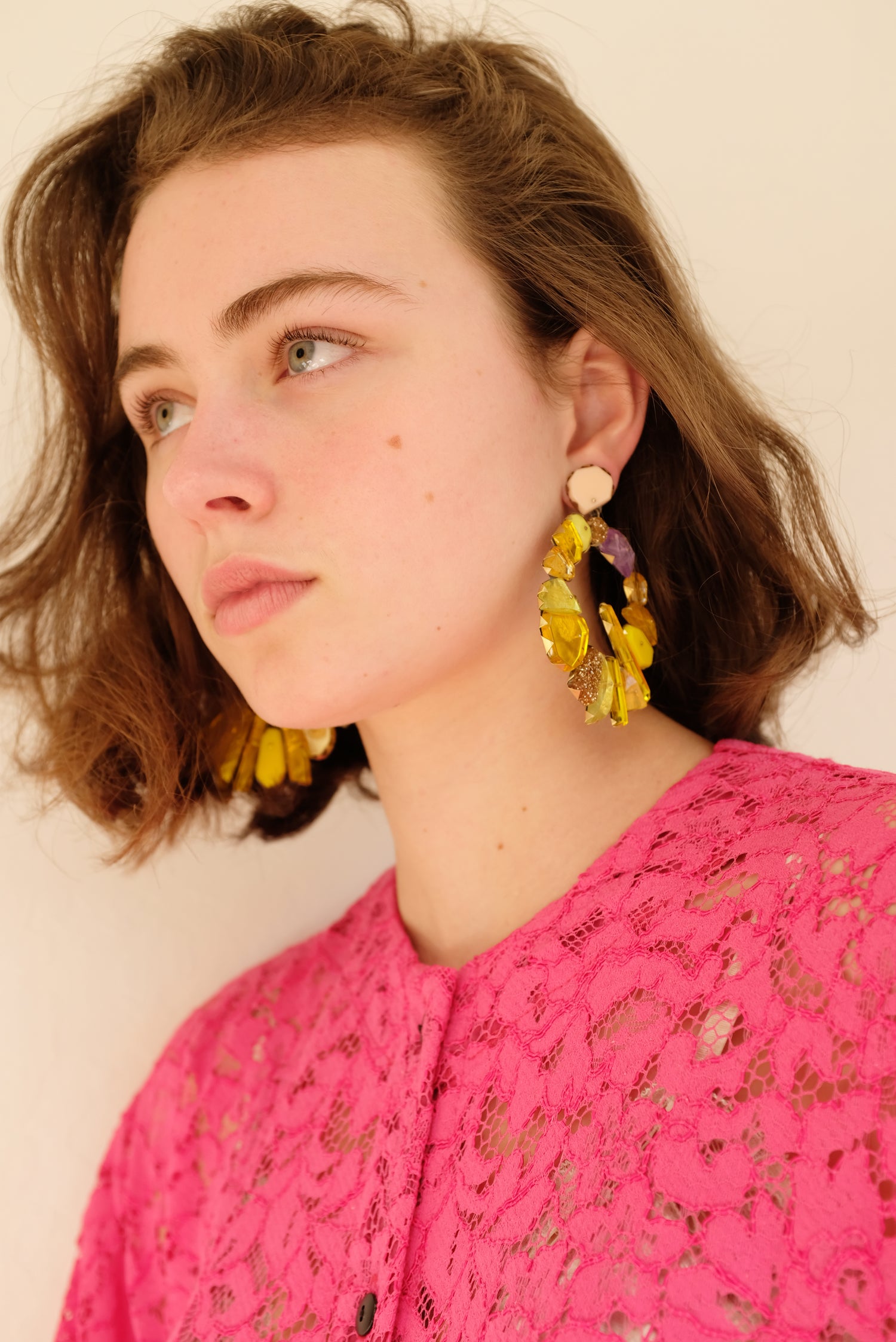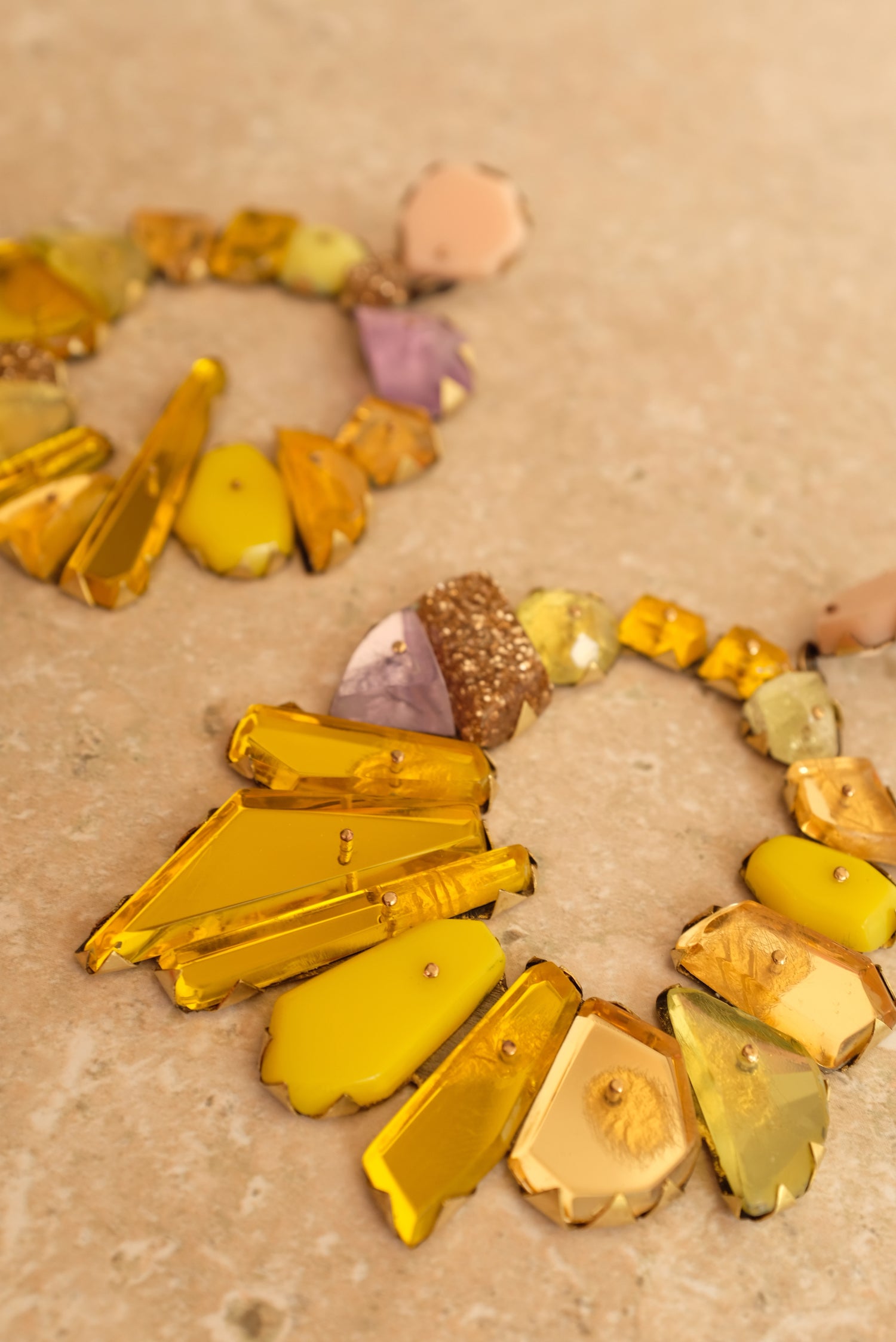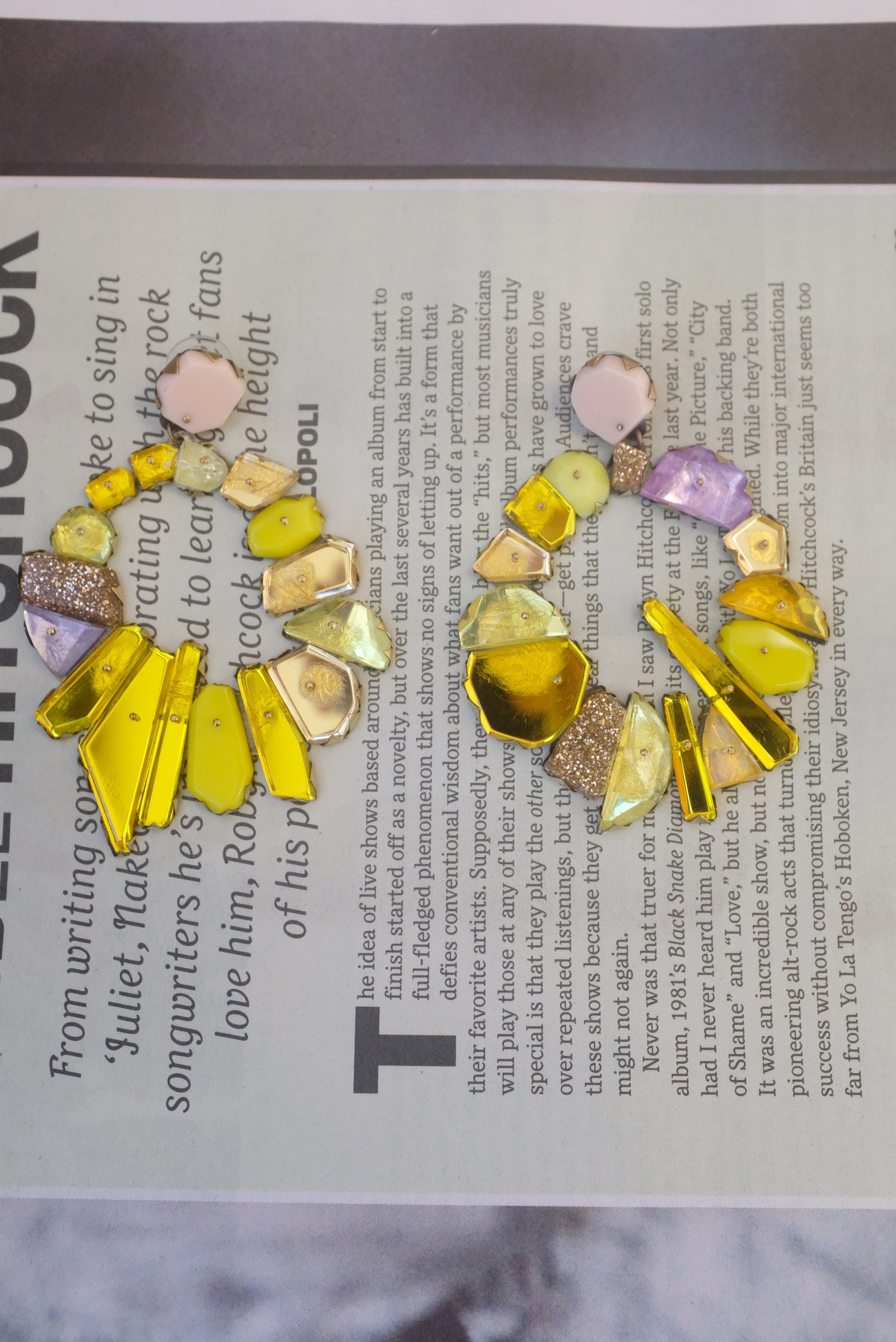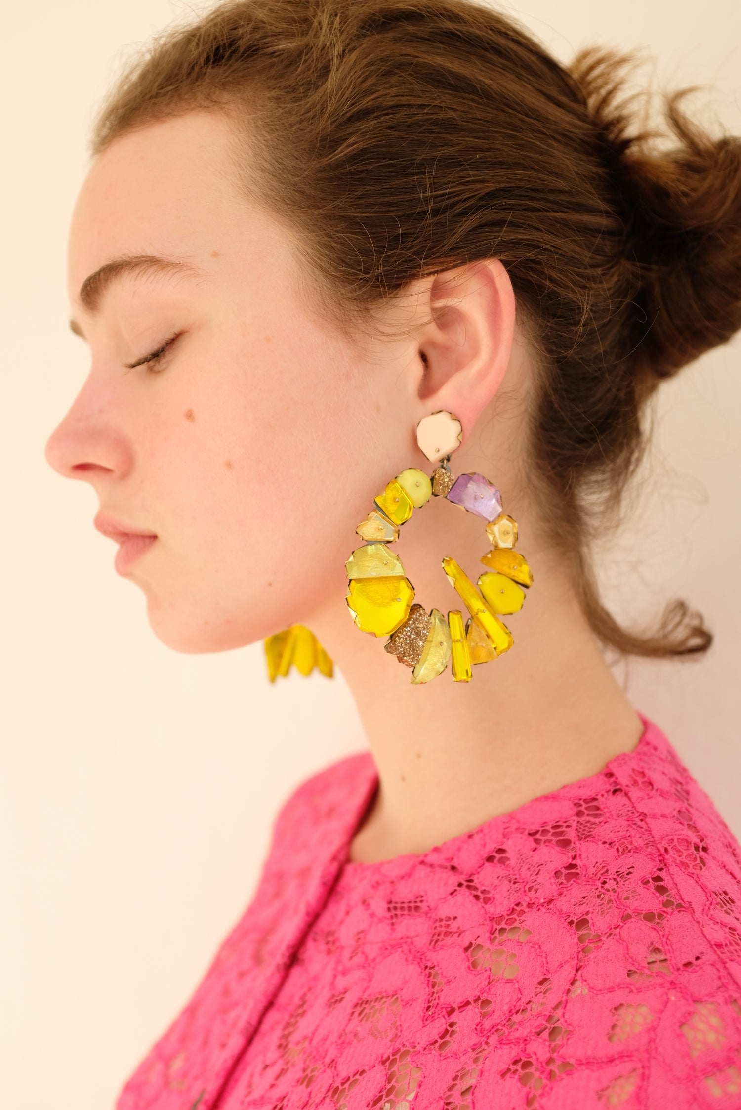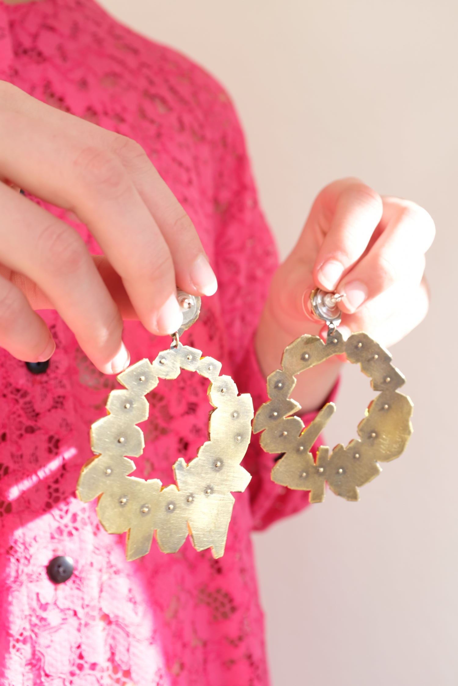 Each is one of a kind, works of art, collectable, and signed by the artist. Materials include hand sanded plexiglass, brass, sterling silver, fine silver, and found objects. Gems are set in brass frames, backed in fine silver with a sterling silver ear post.