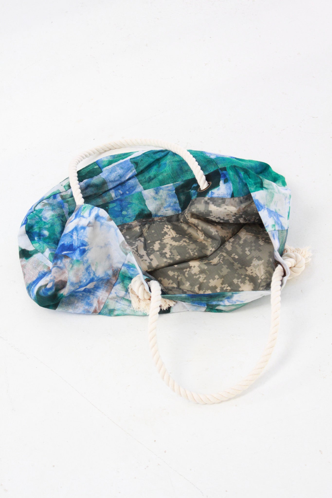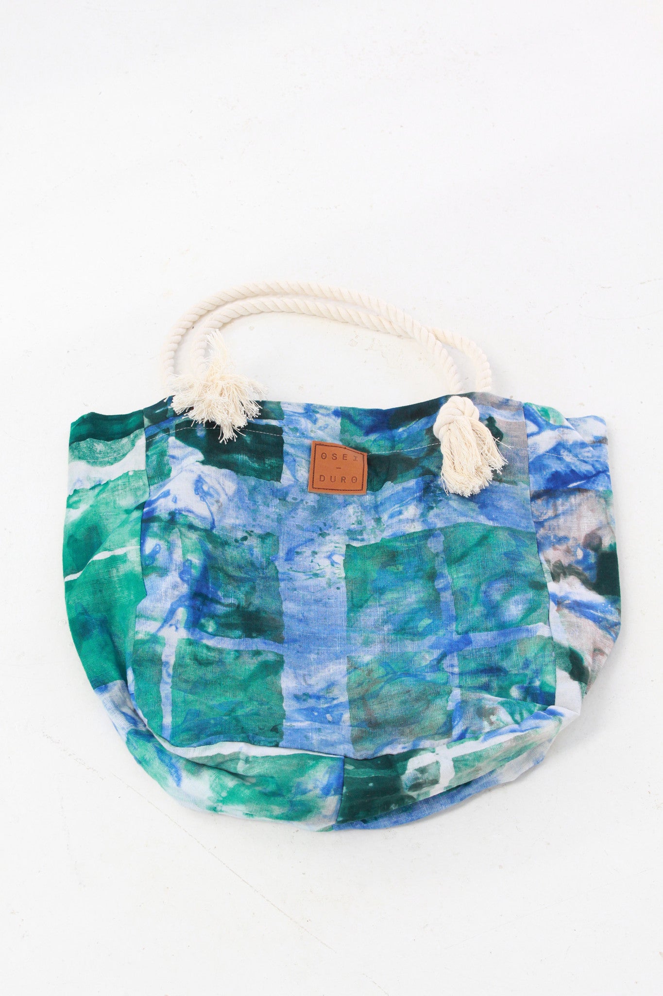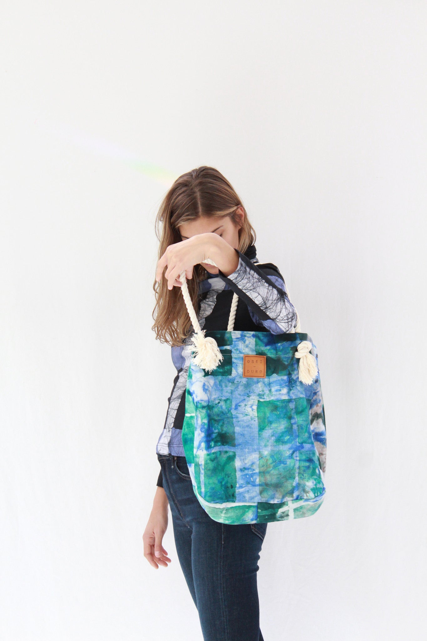 100% linen hand dyed exterior, lined, thick cotton cording. Aprox 16" x 20" -generously sized and holds a laptop.