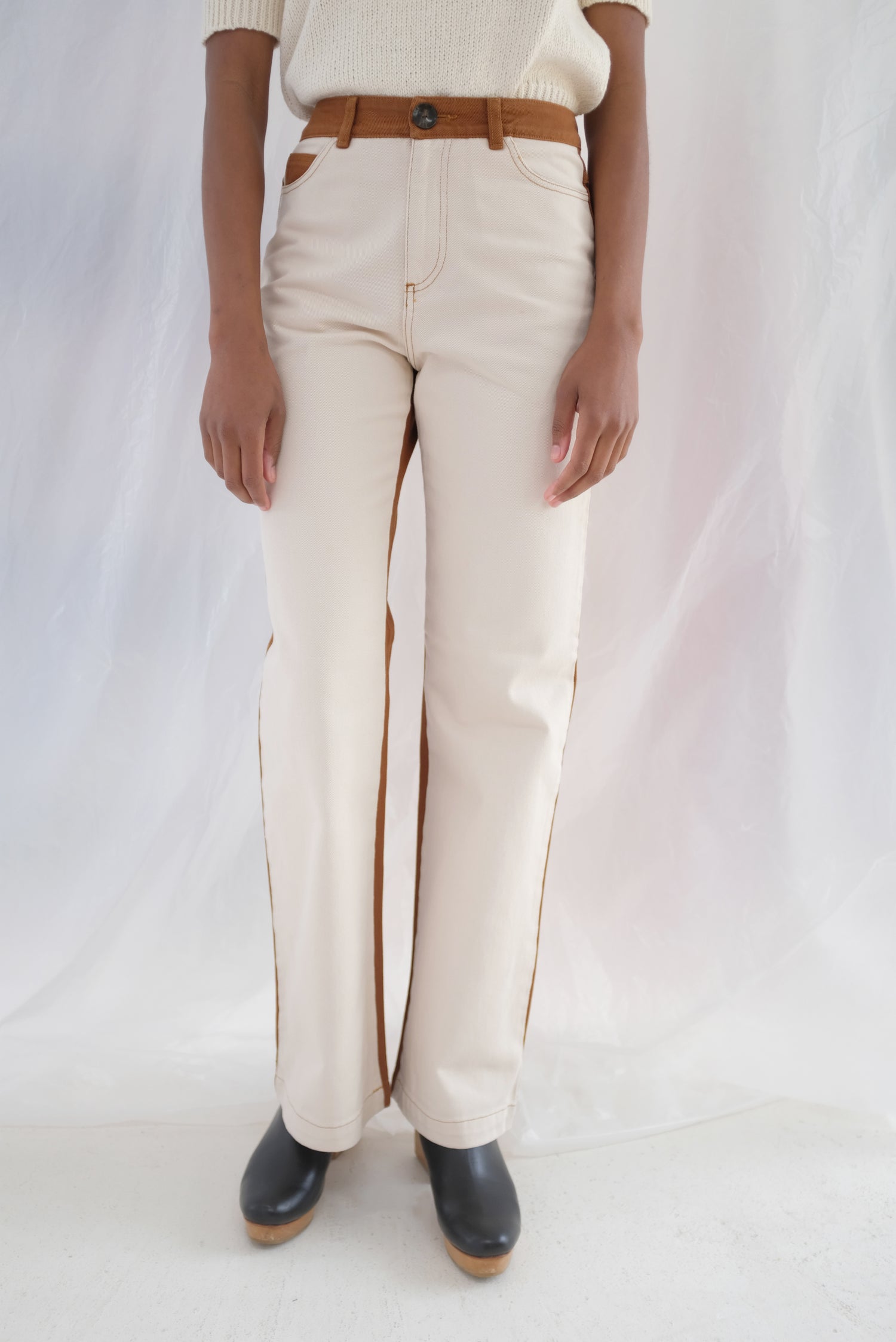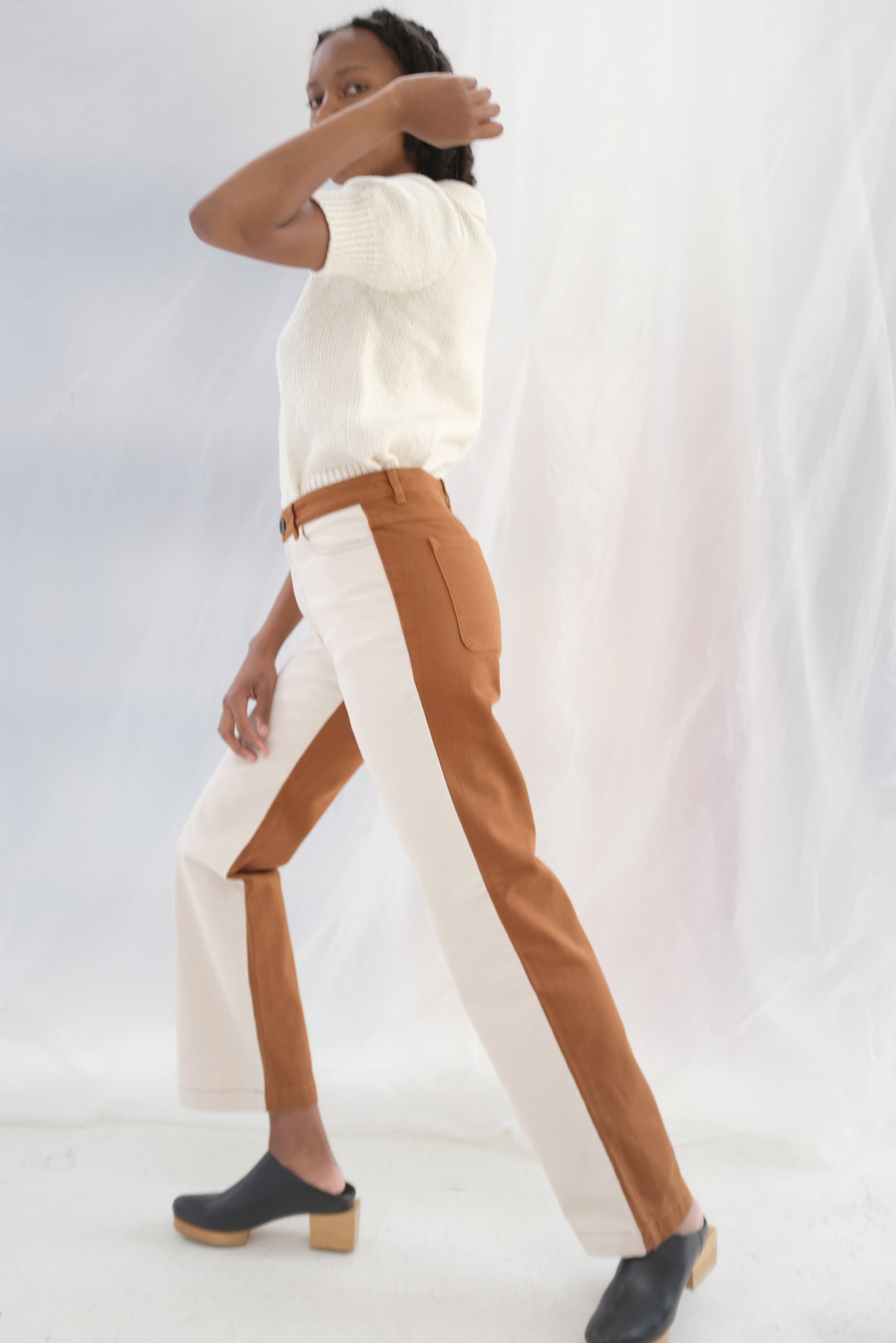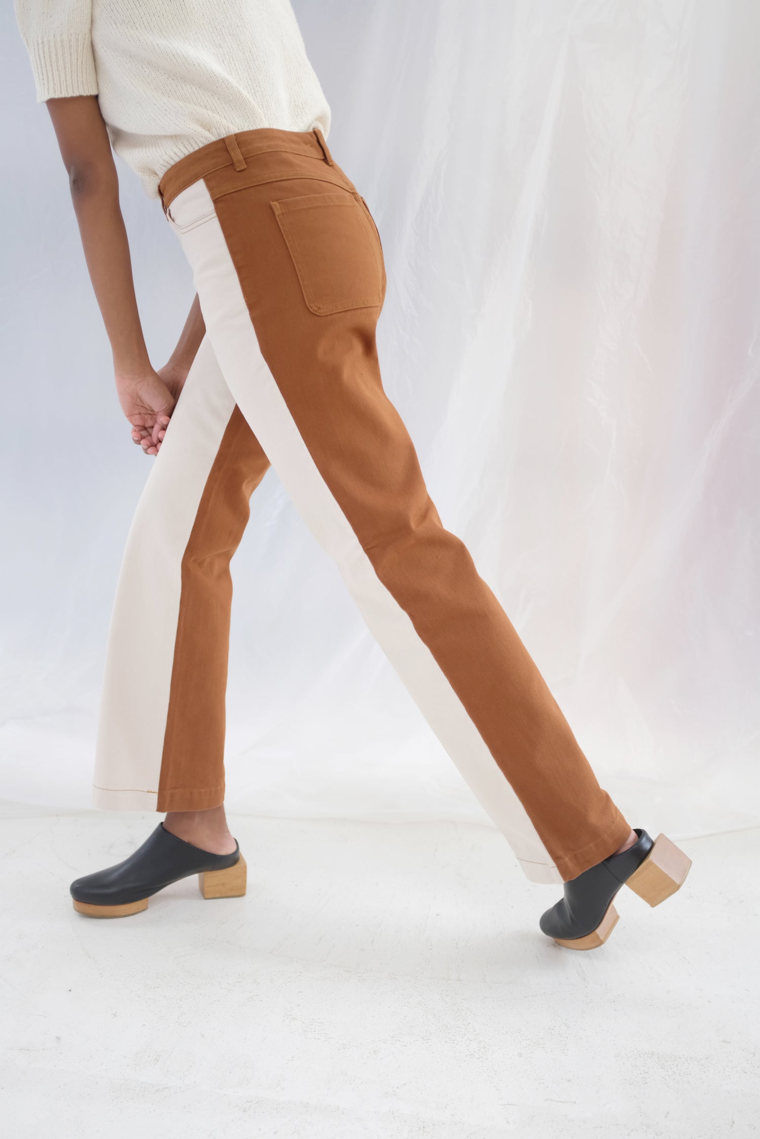 High waisted, 5 pocket, two tone pant. Straight leg. 100% cotton.