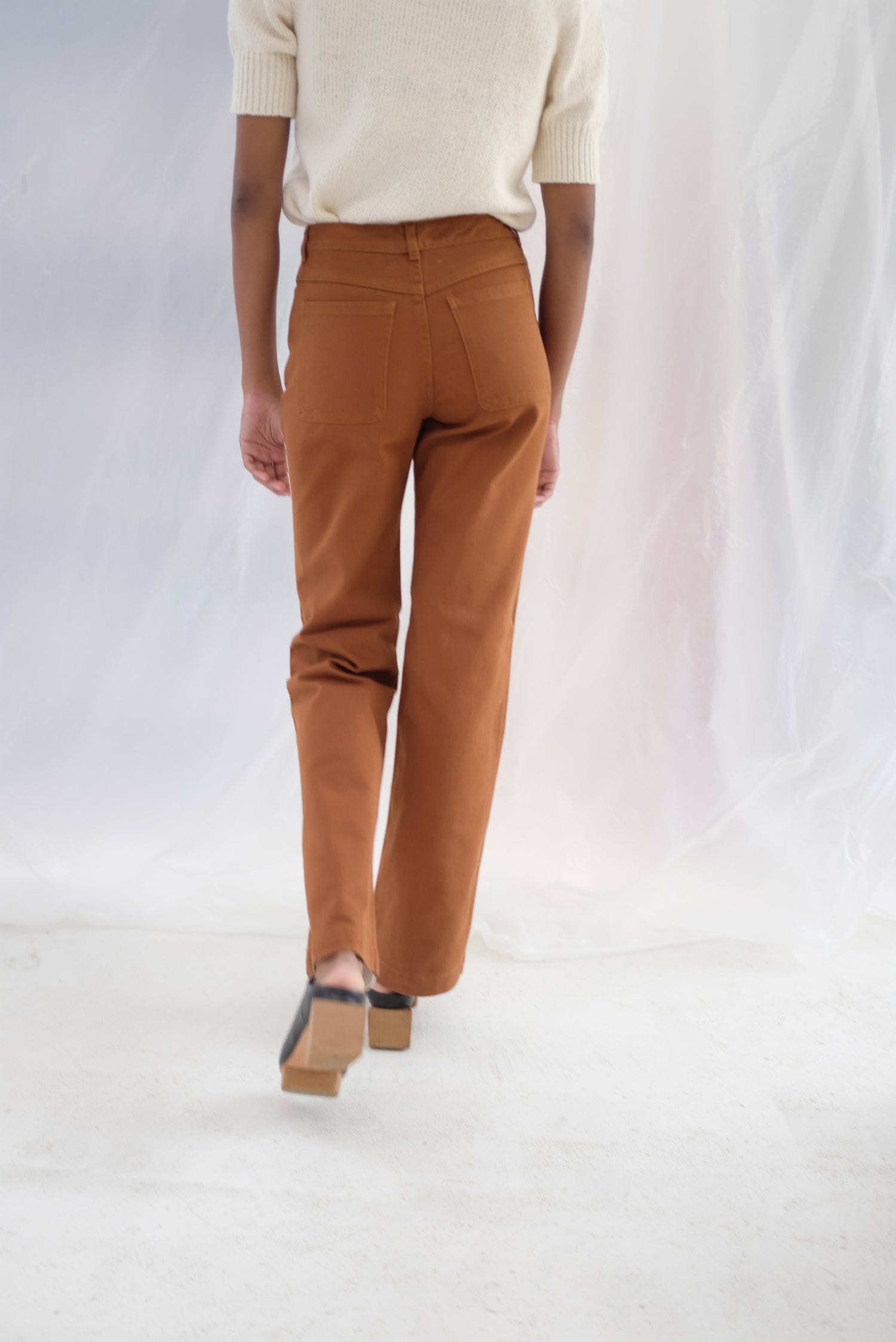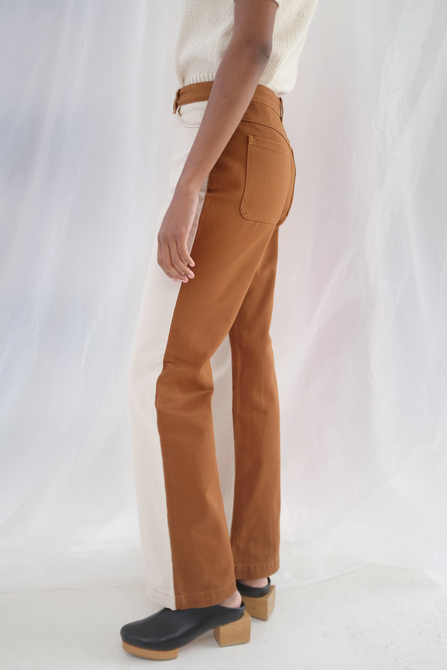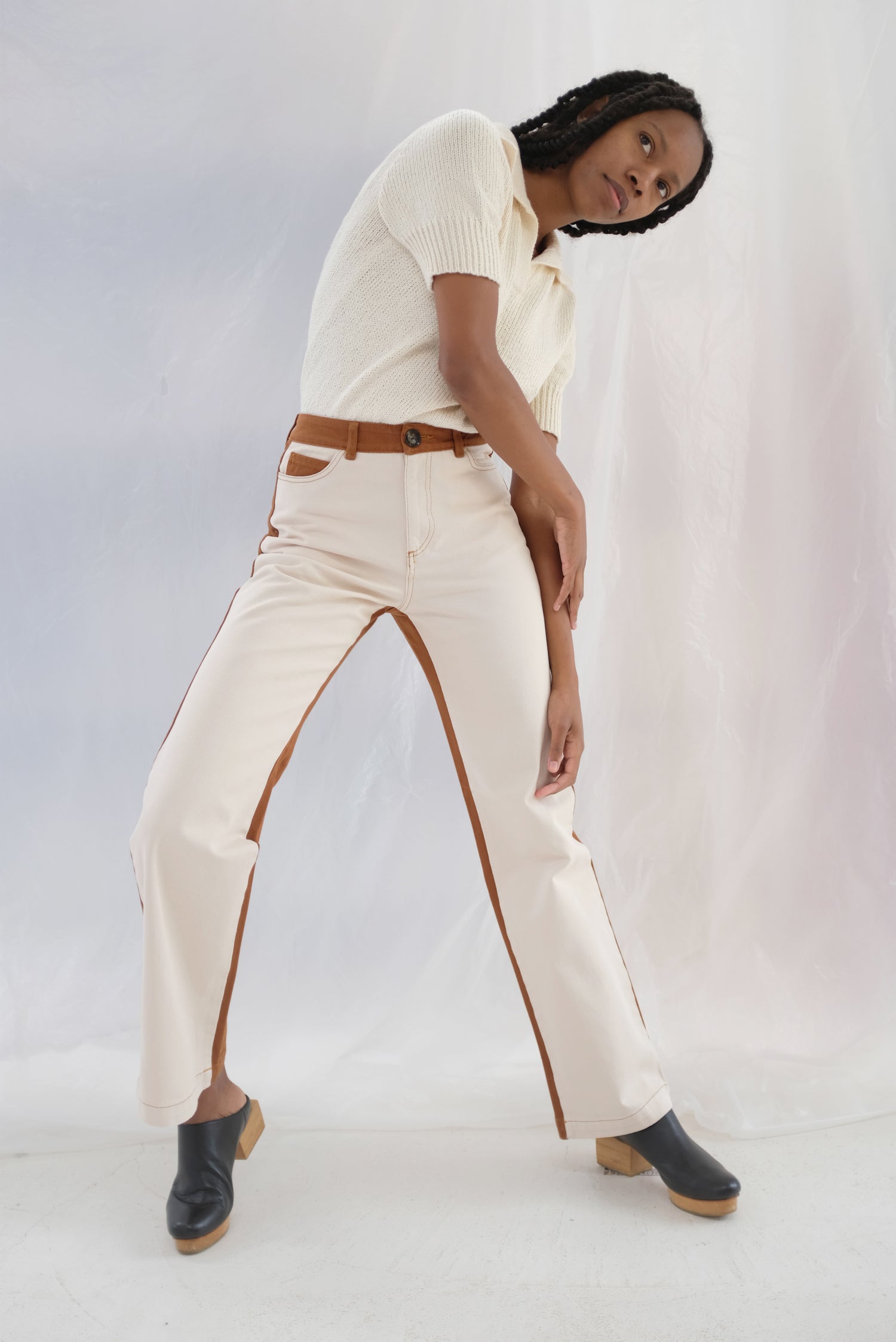 High waisted, 5 pocket, two tone pant. Straight leg. 100% cotton.
