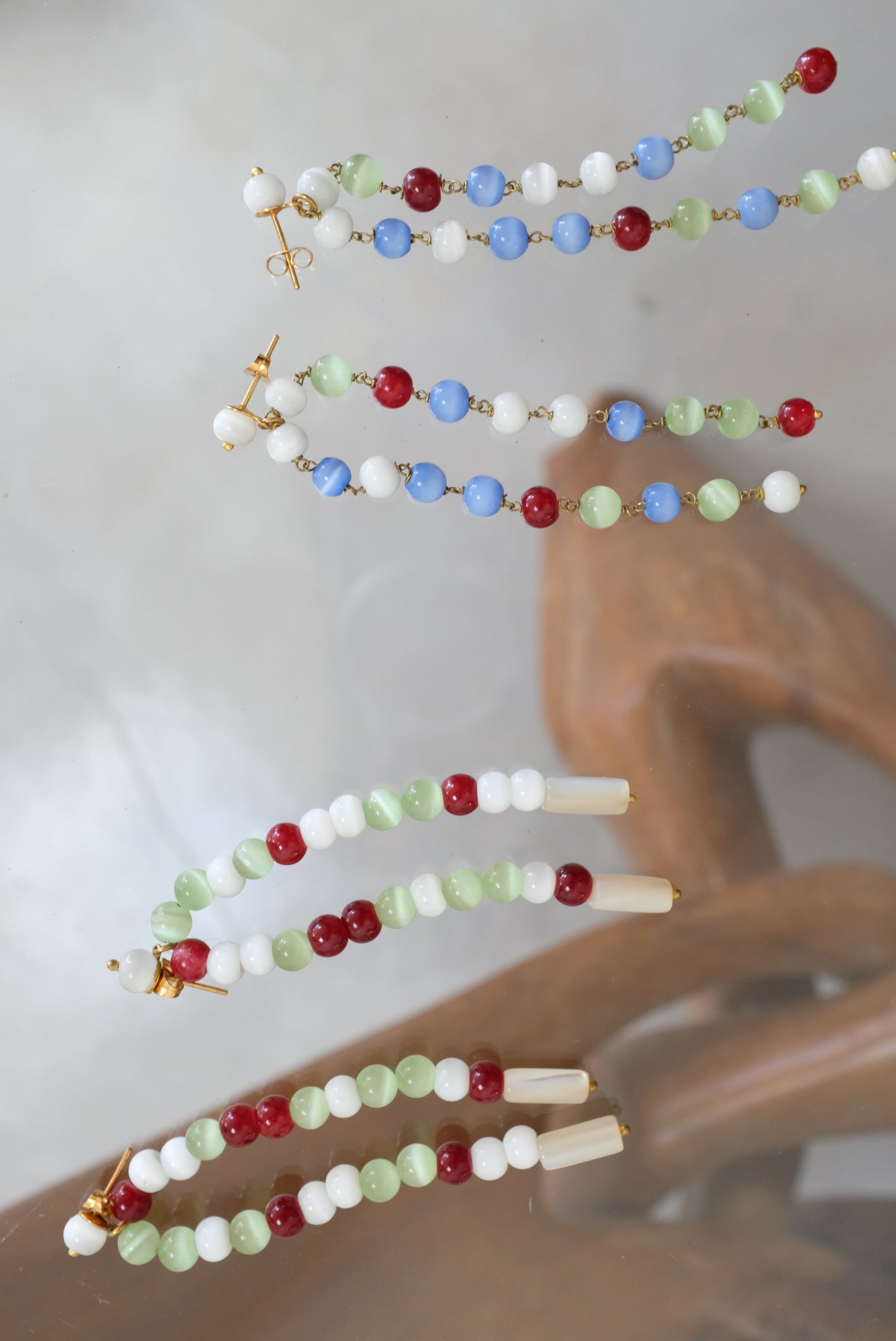 Dangling multi-coloured stone earrings with anti-allergic, nickel-free brass. 90% stone, 10% nickel-free brass.