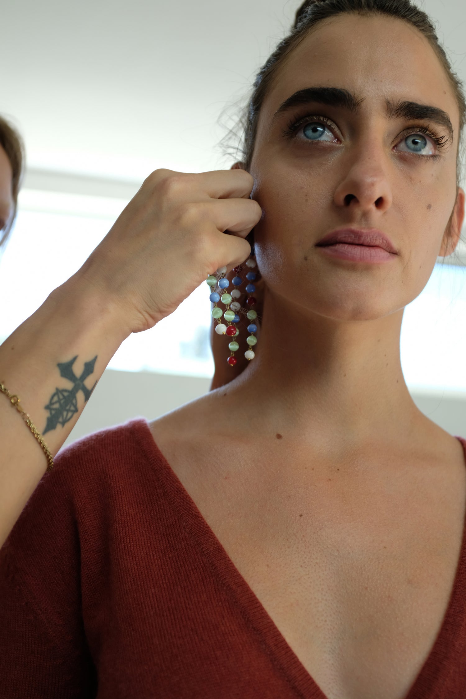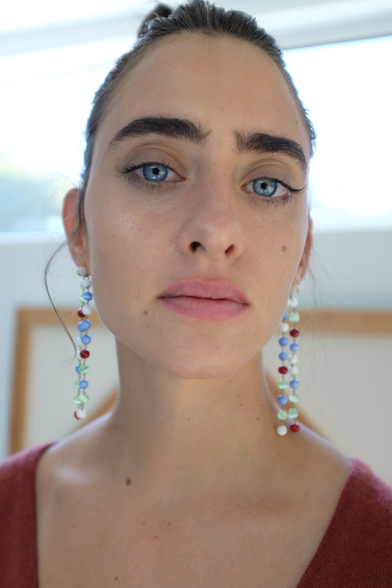 Dangling multi-coloured stone earrings with anti-allergic, nickel-free brass. 90% stone, 10% nickel-free brass.