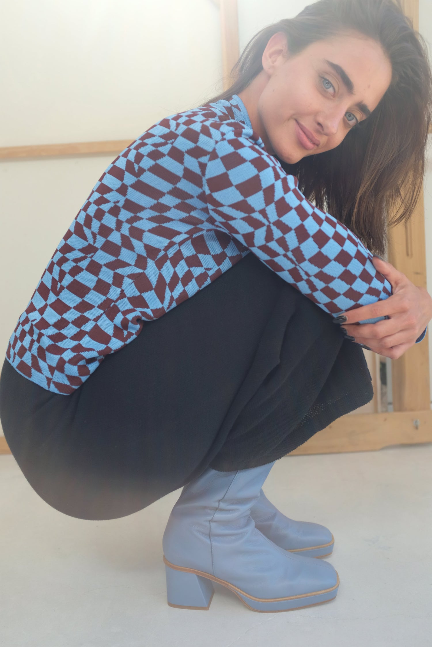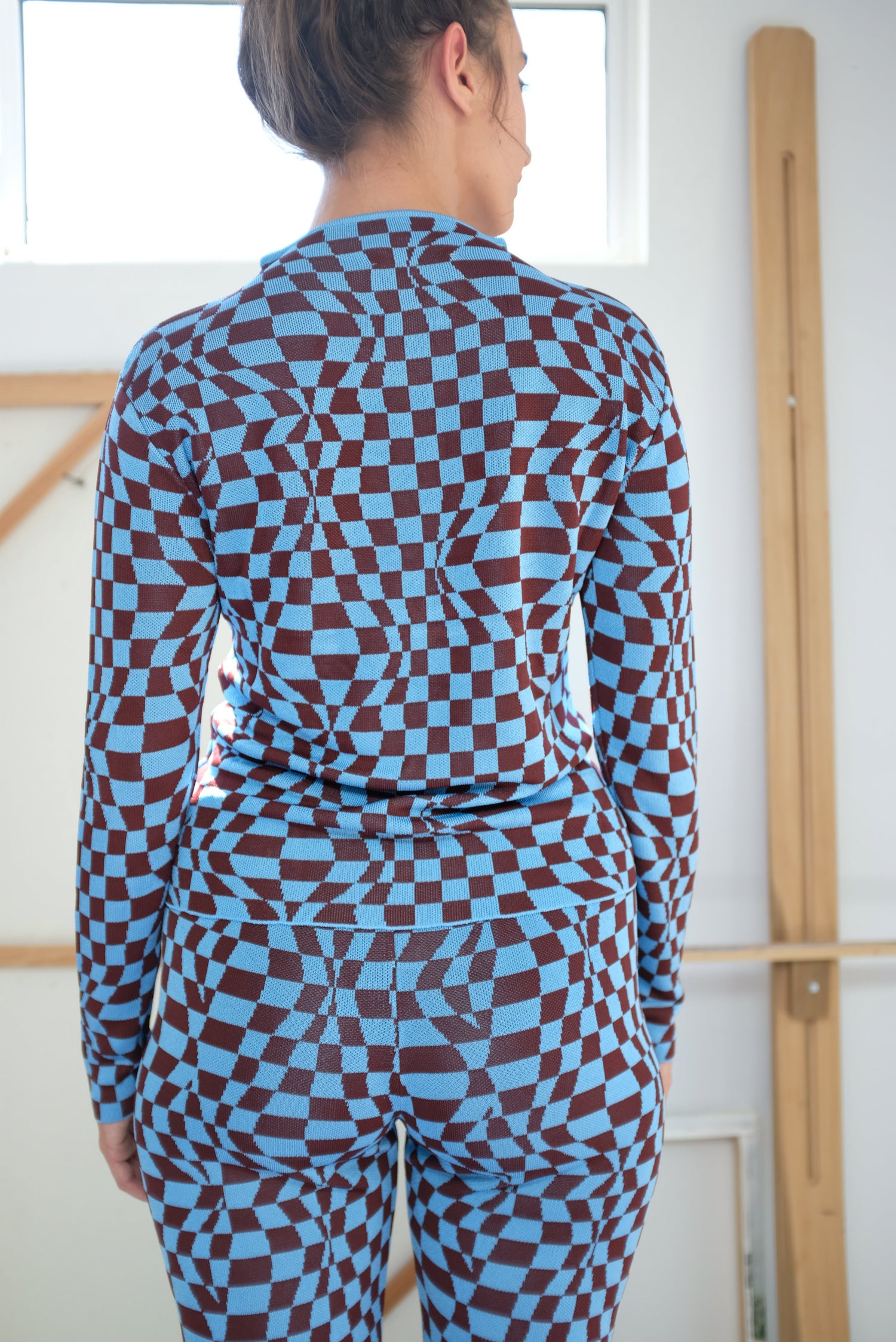 Long-sleeved knit top in psychedelic check print. Mock-neck. 100% Viscose. Stretchy and wonderful.