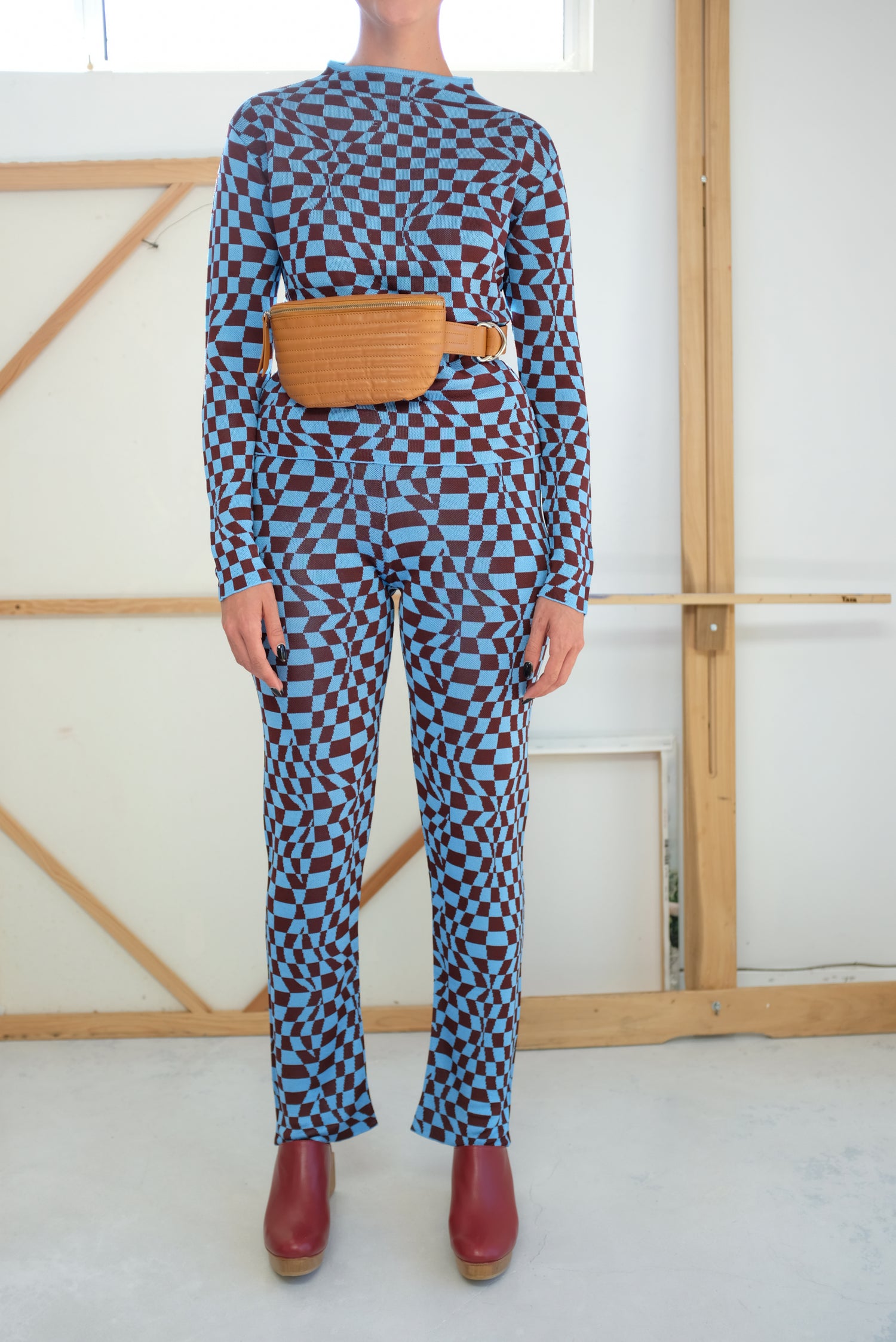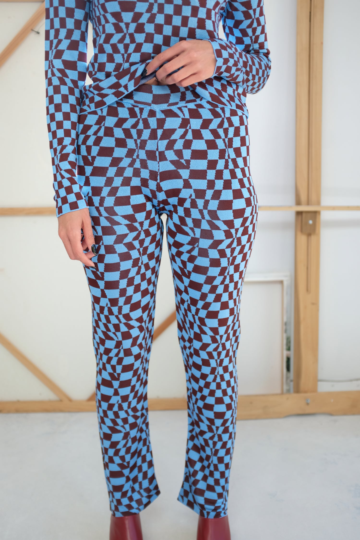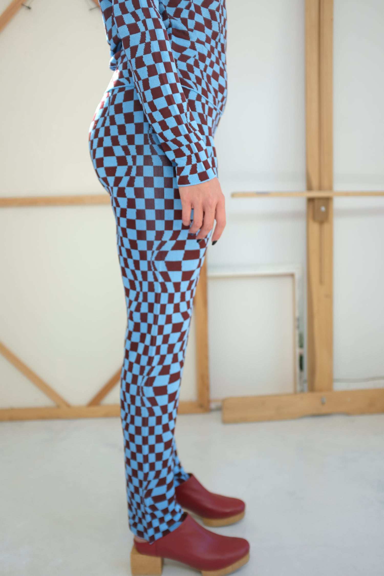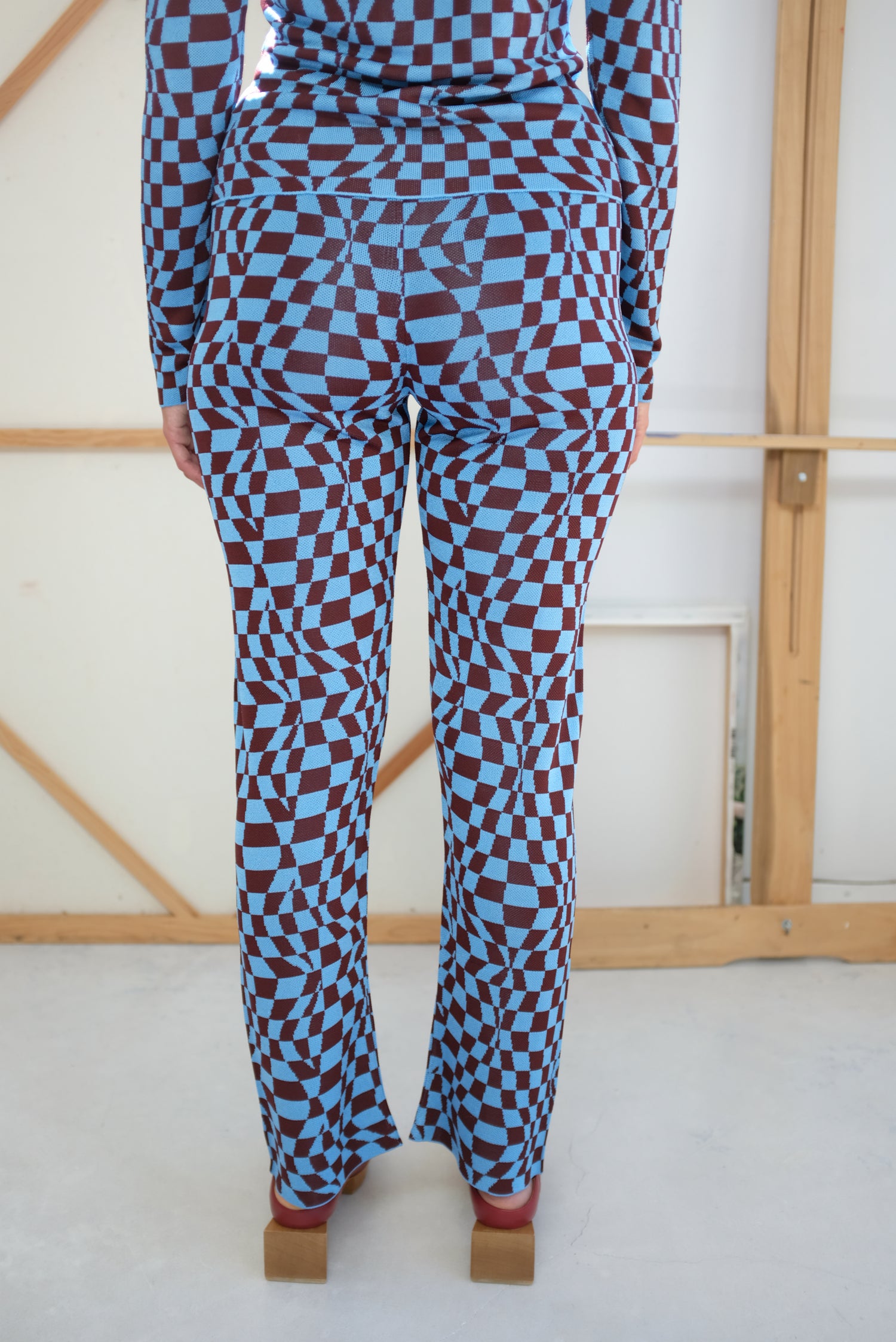 Knit pants in psychedelic check print. Elastic waist, straight leg. 100% Viscose. Stretchy and a nice medium weight.