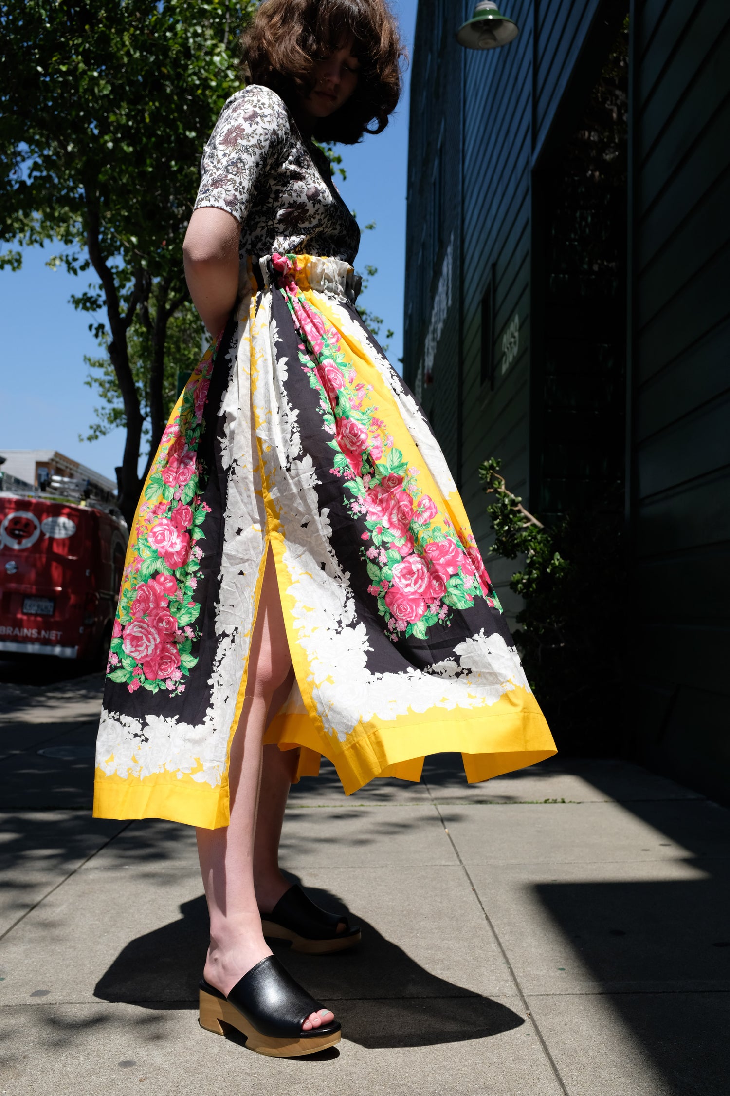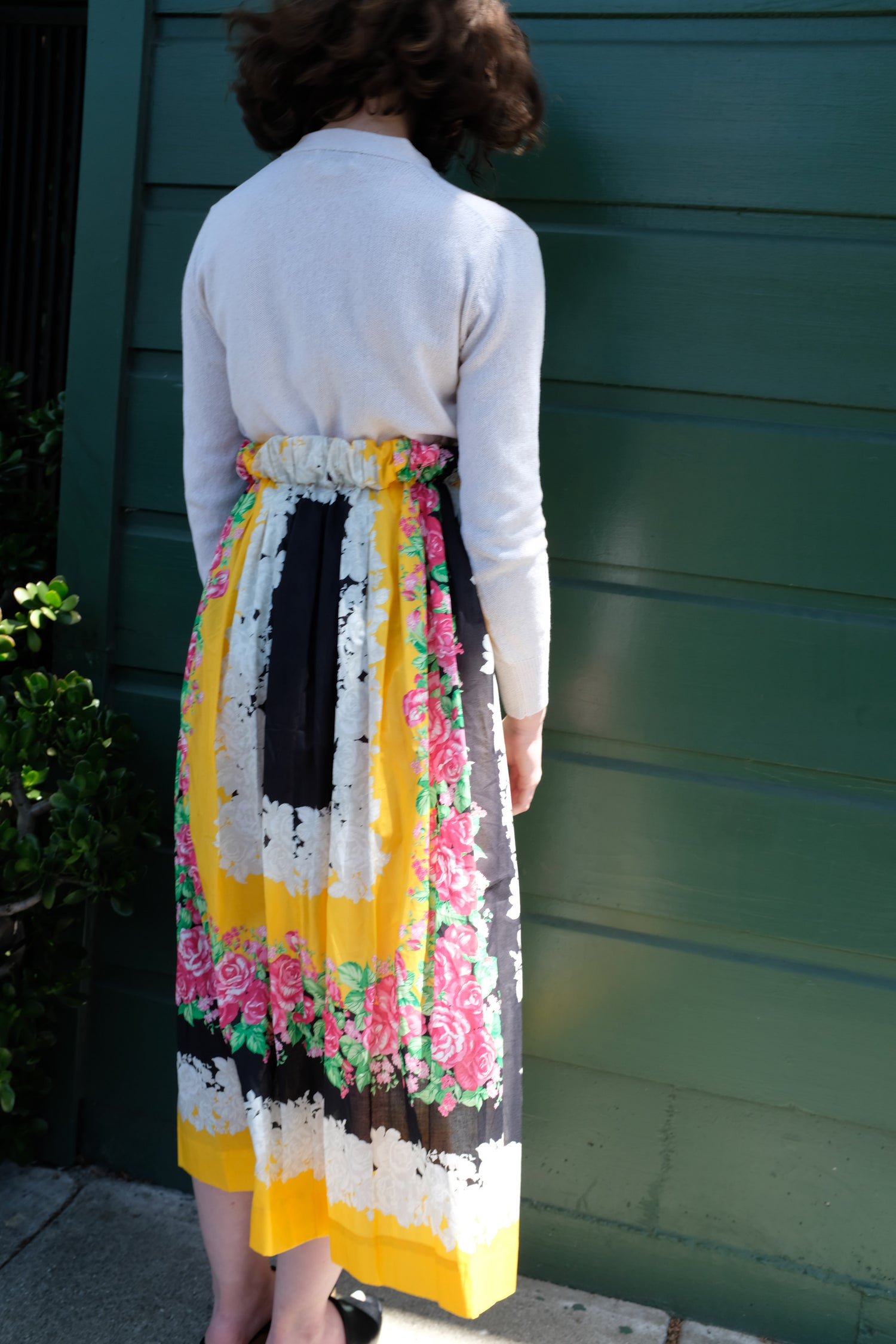 A-line midi length skirt in Yellow Foulard floral print, pleated ruched elastic waistband, button placket closure at front, side slits, slip pockets at side waist. Unlined and breezy printed foulard cotton voile, smooth and durable fabric with a clean, fresh hand feel. 100% Italian Cotton.