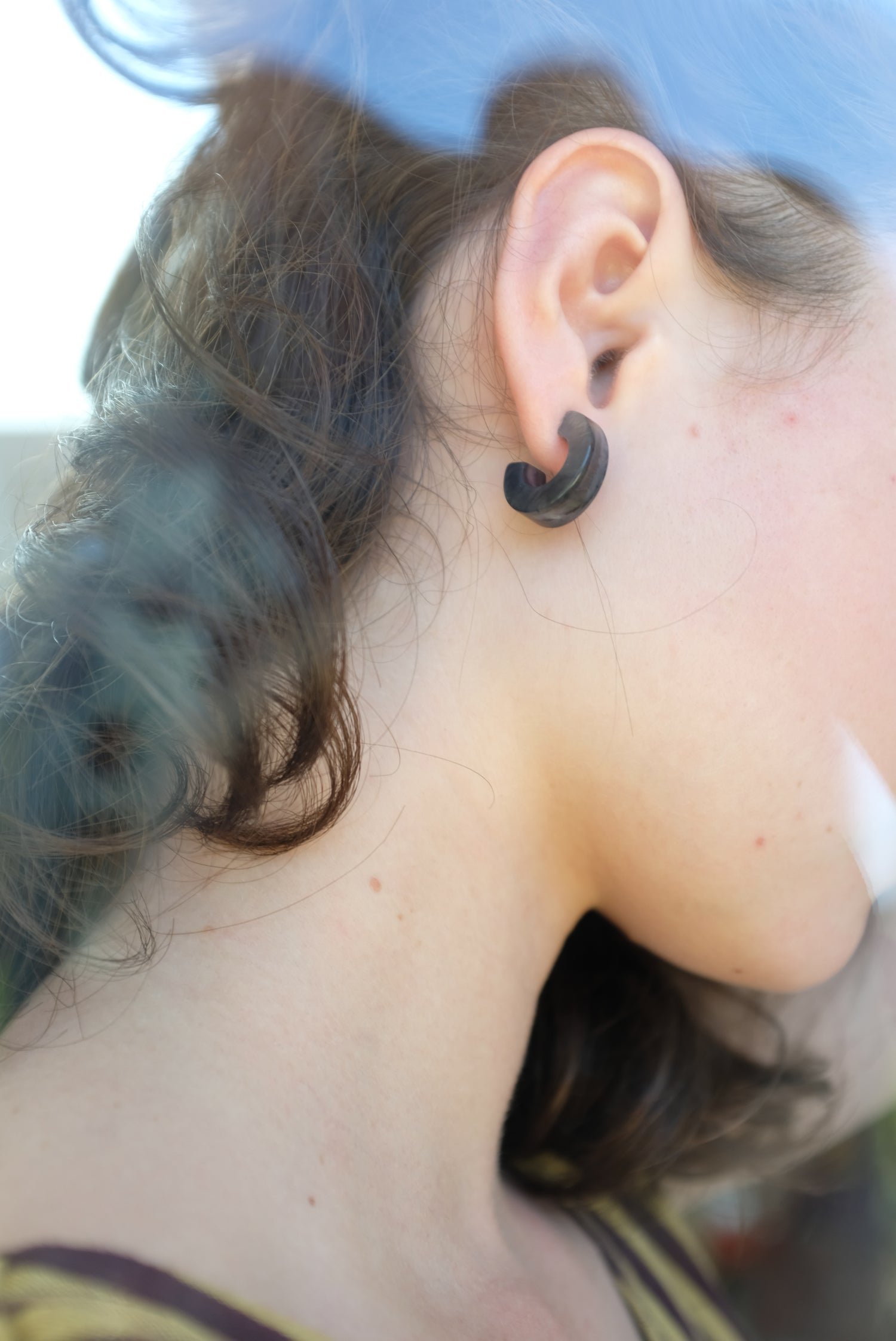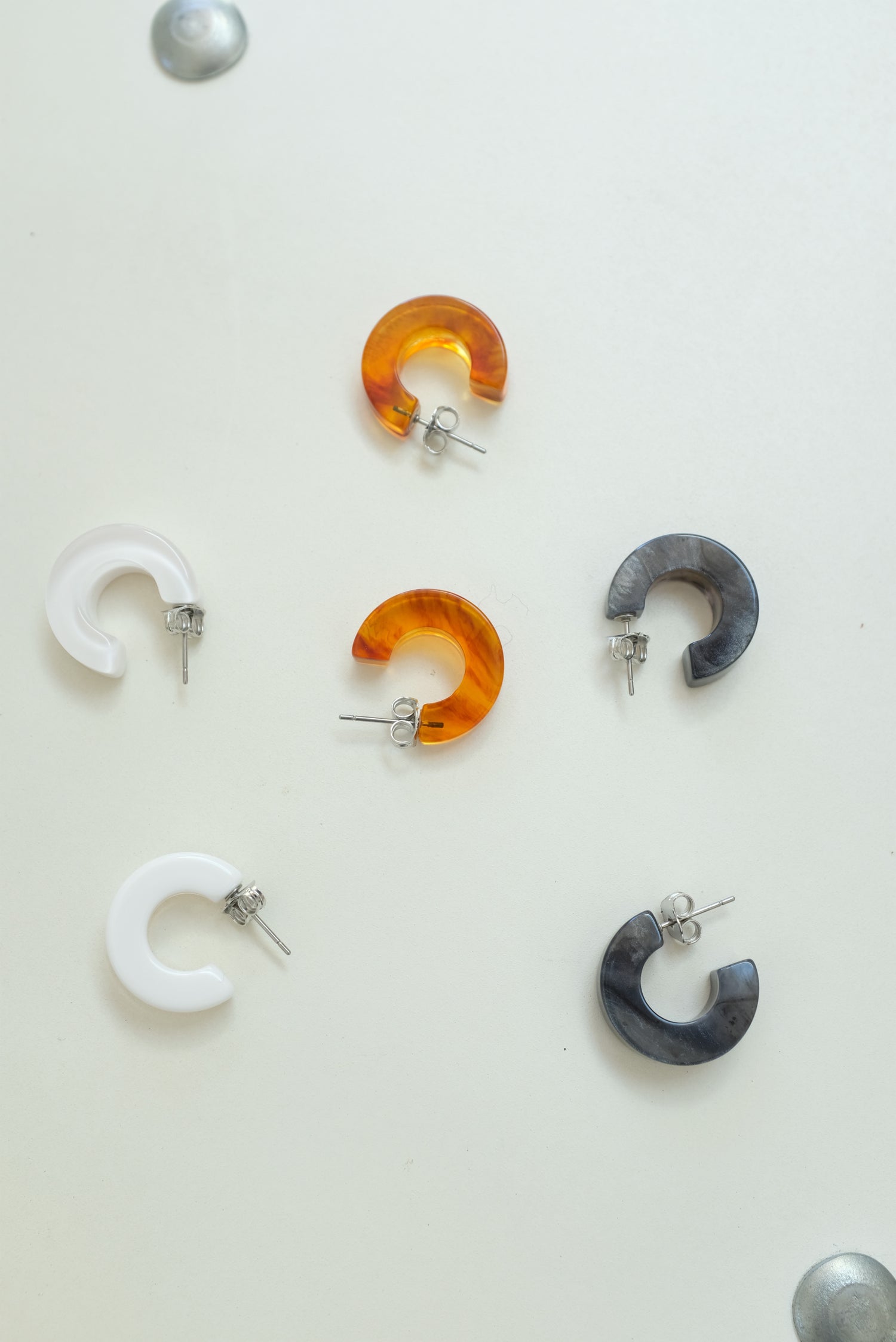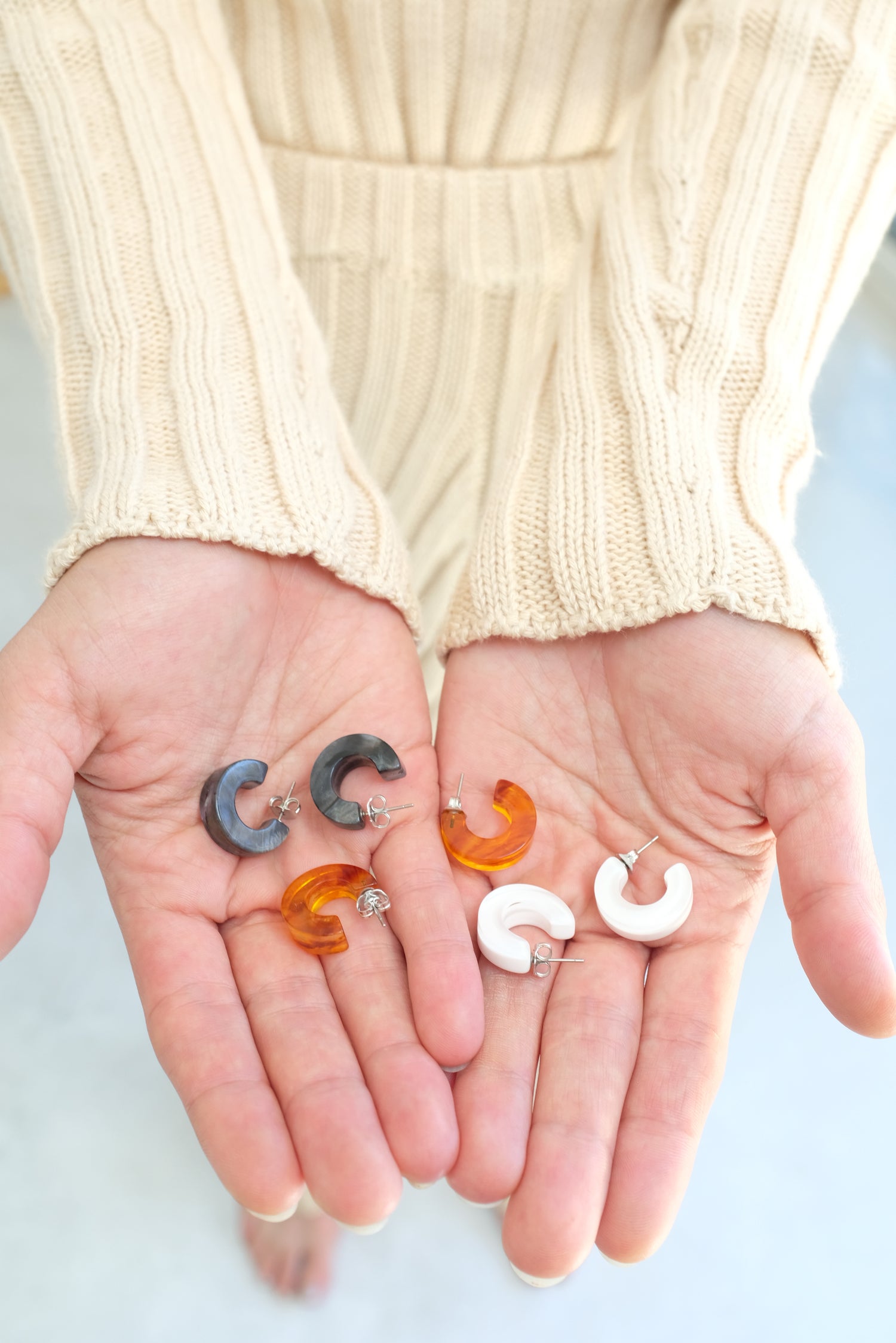 Small hoop earrings, stud fastening for pierced ears, plated steel post. Acrylic, Brass. Hoops measure 3/4”.