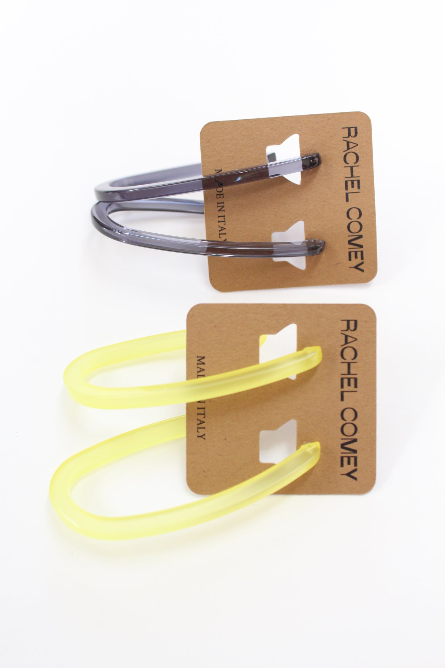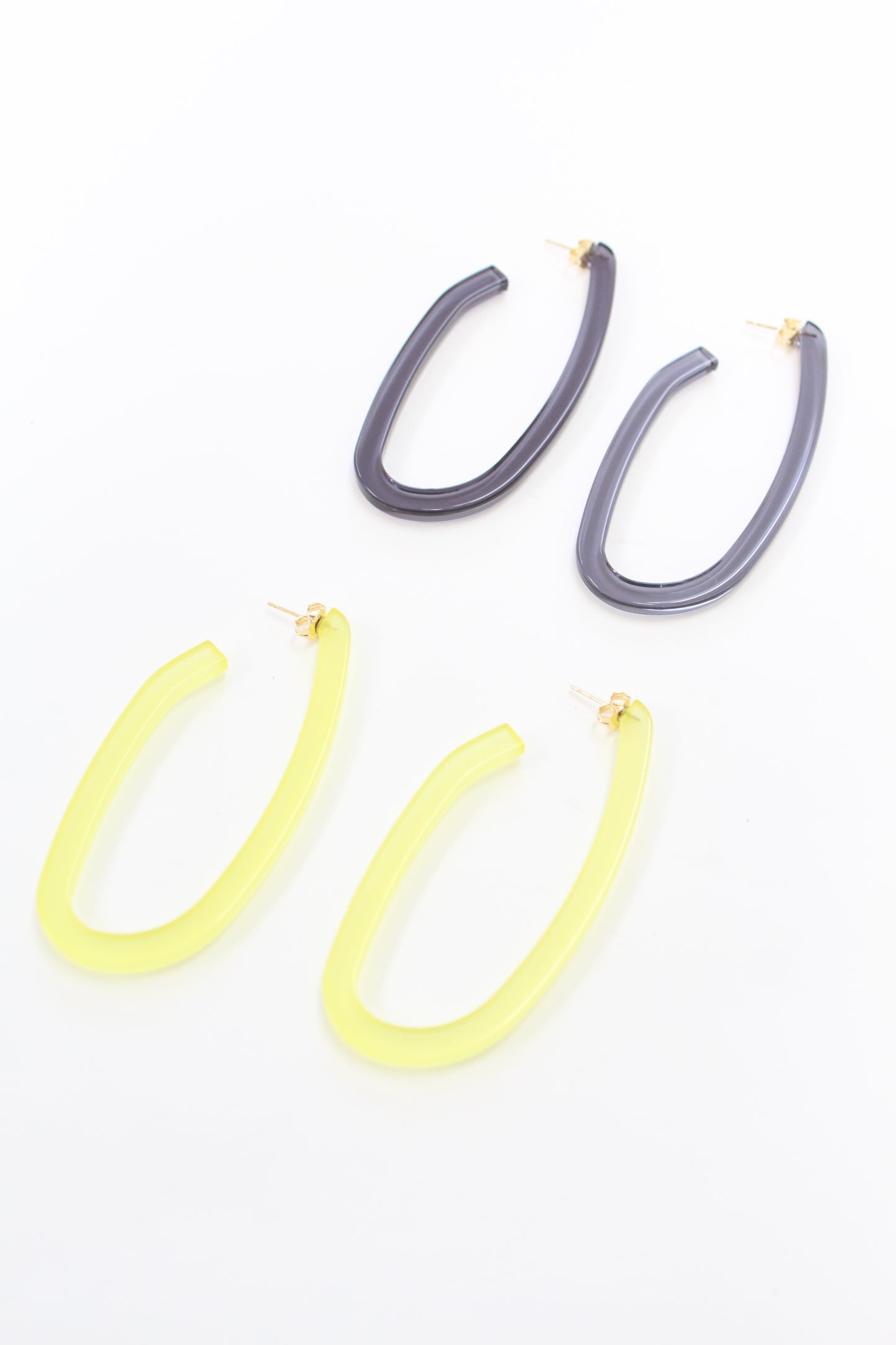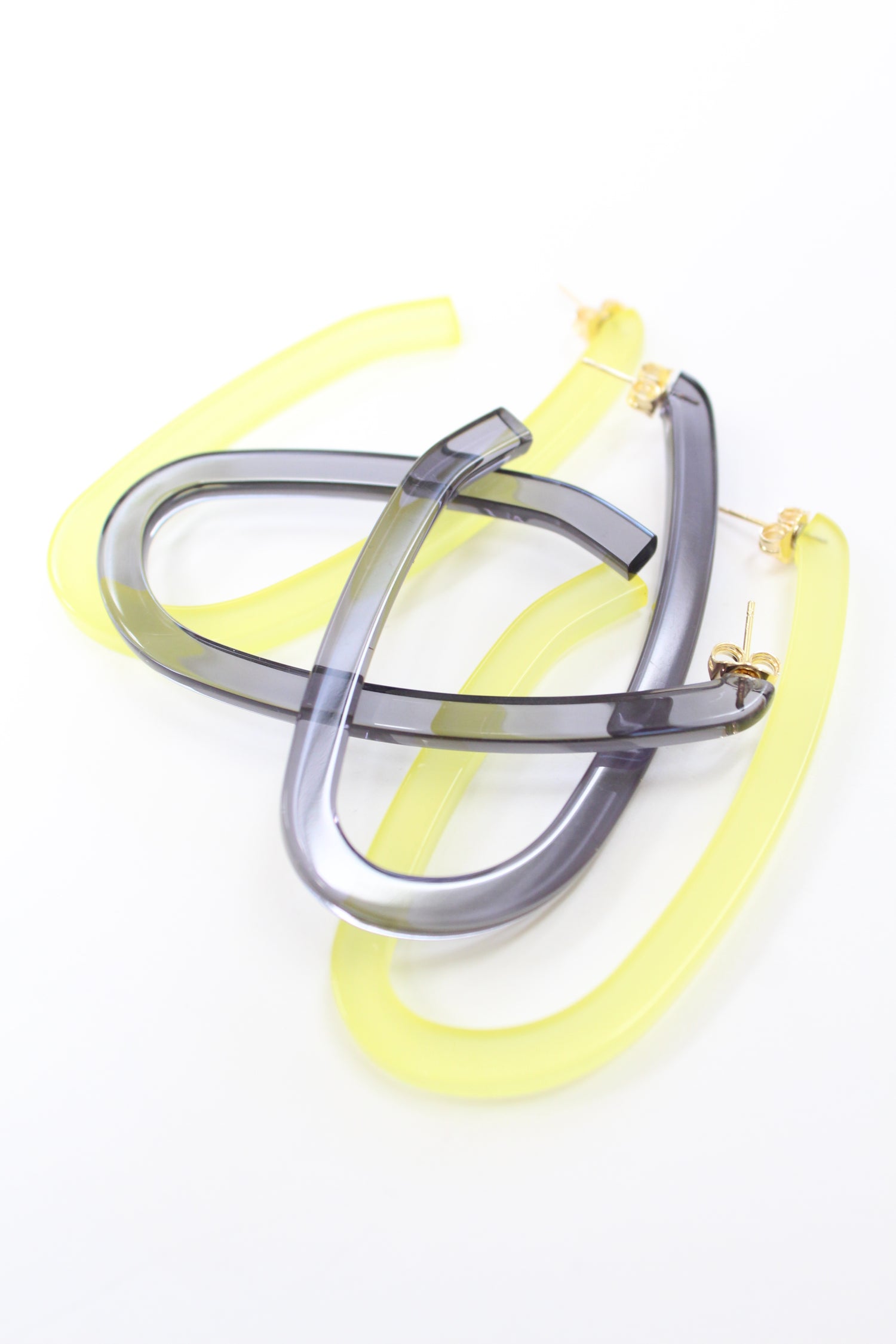 Acrylic hoop earrings, stud fastening for pierced ears. Plated steel post. Aprox. 3" length.