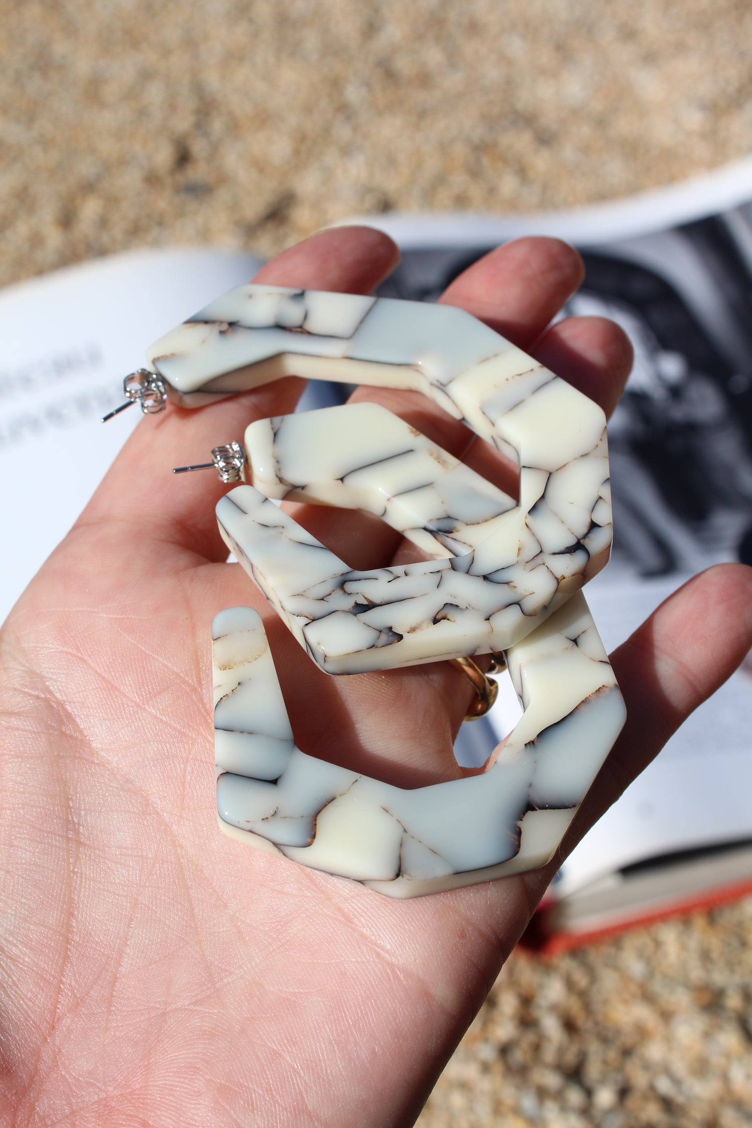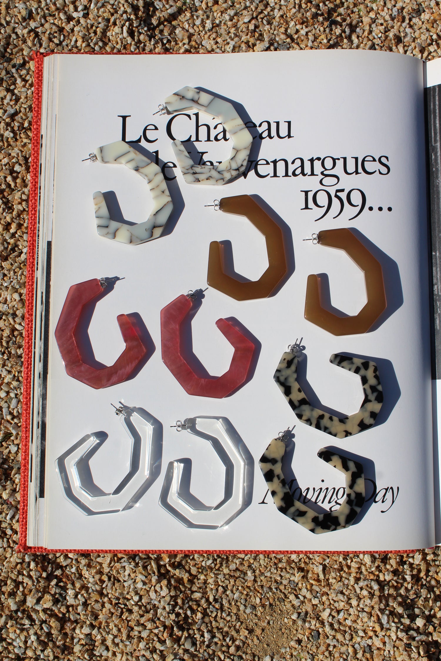 Acrylic hoop earrings, stud fastening for pierced ears. Plated steel post. Aprox 2.5"
