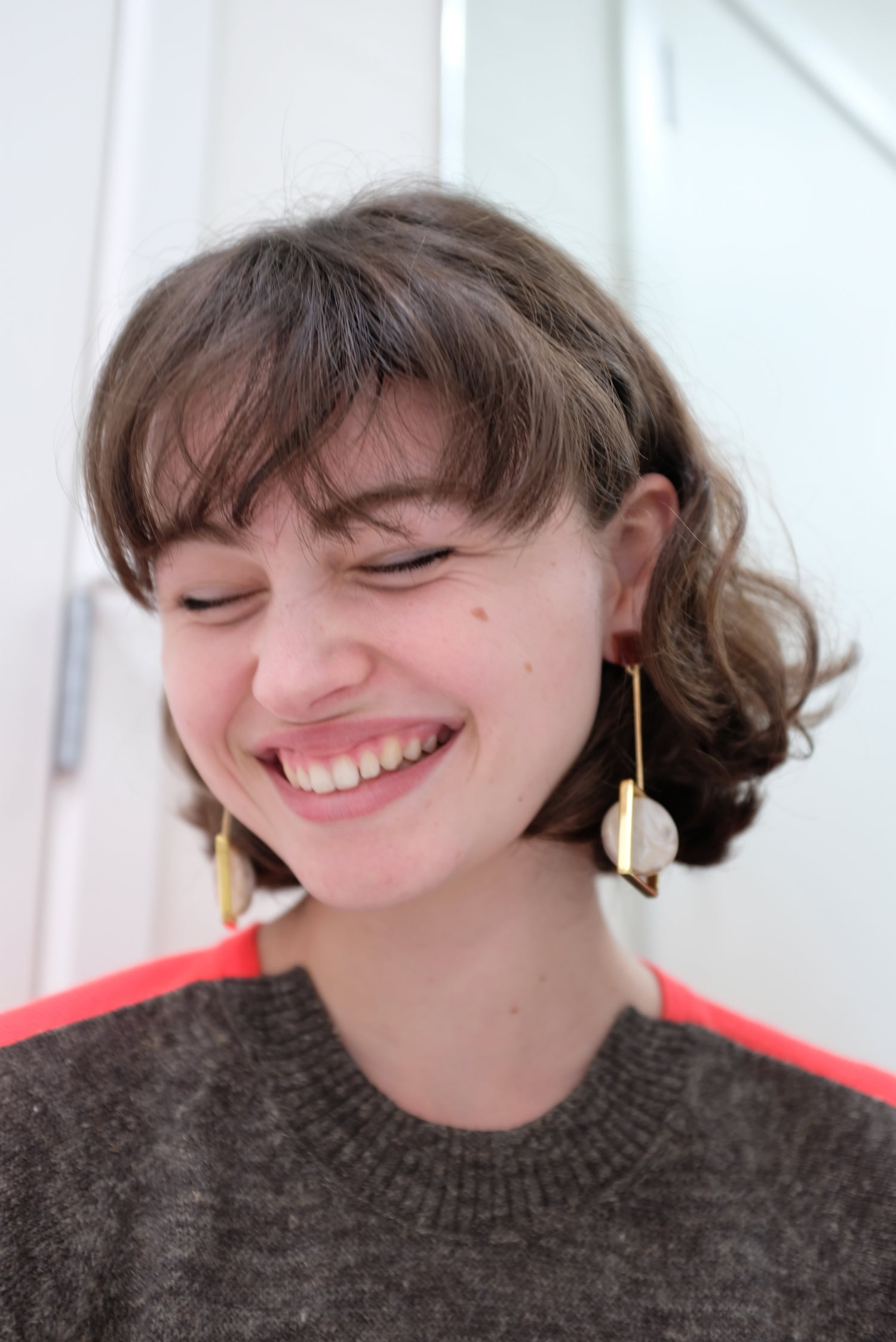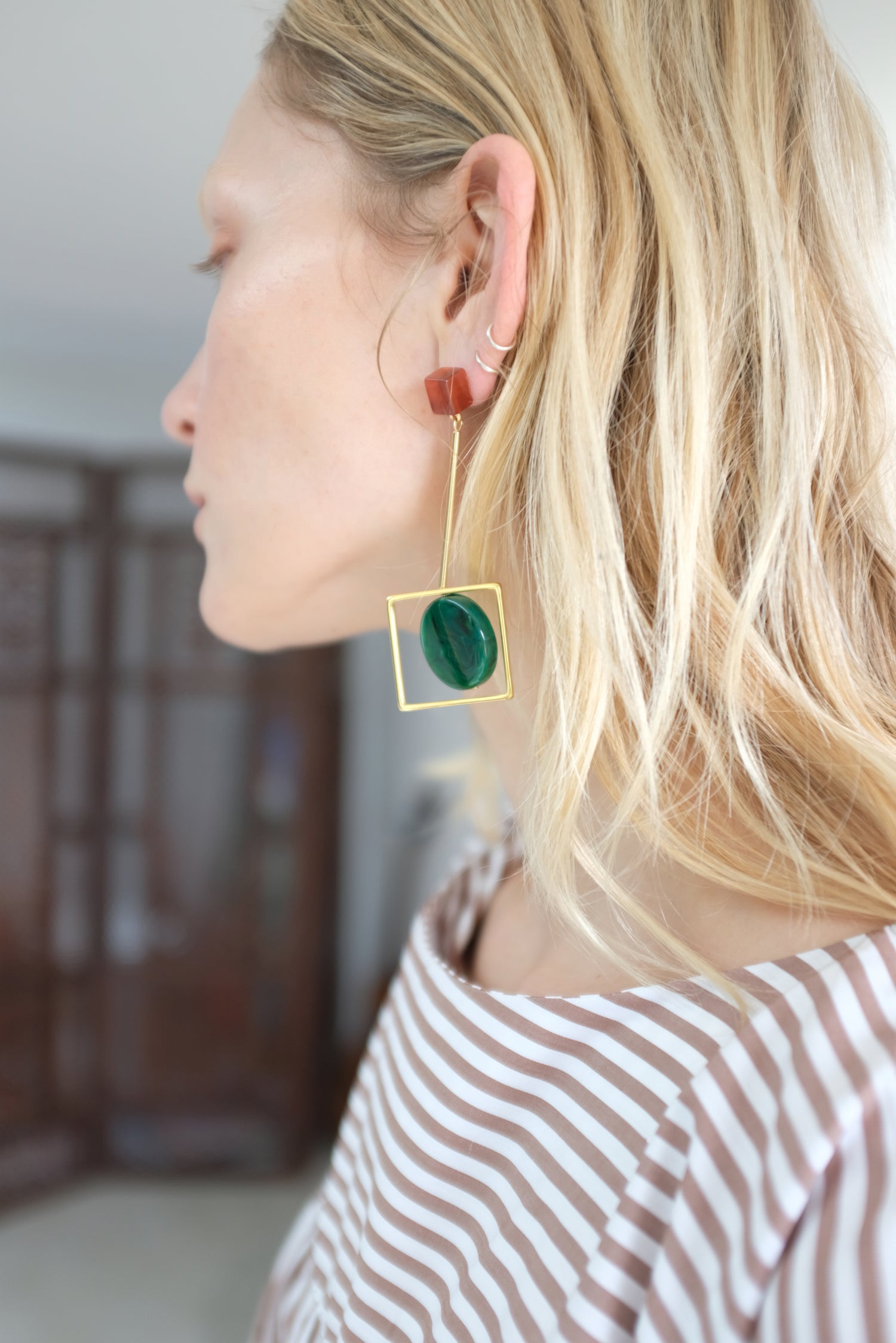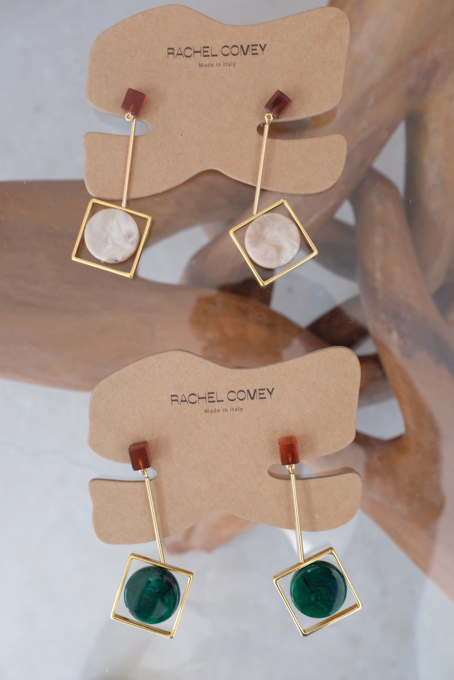 Acrylic and brass drop earrings. Stud fastening for pierced ears. Plated steel post. Aprox 3.5"